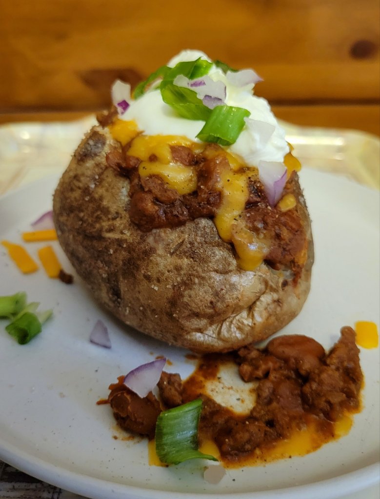 Cut open potatoes and top with butter, chili, cheese, green onions, and sour cream, or desired toppings.