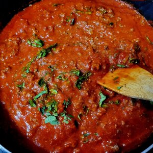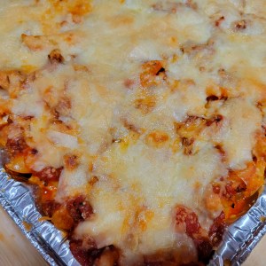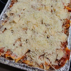 Layer sauce, pasta, cheese, & repeat with second layer and topping with just mozzarella & parm. 350° approx 30 minutes or when top is golden and bubbly 😉