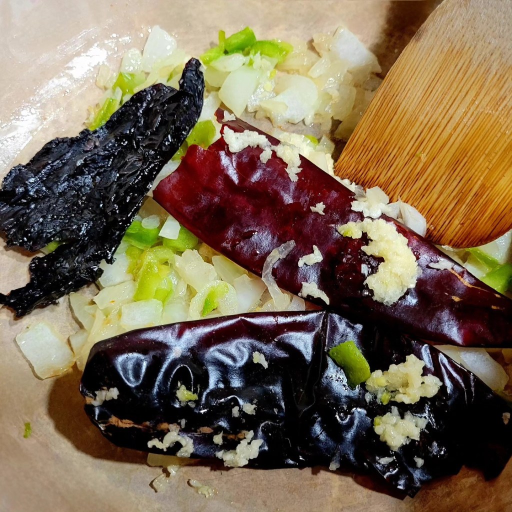 Of course, I made mine a little different. I didn’t have jalapeño, so I used guajillo pepper, ancho chile pepper, New Mexico Chile pepper (pods), & chipotle with adobo sauce. Also, chipotle chili powder & regular chili powder. And we like these chili beans that aren’t kidney beans.