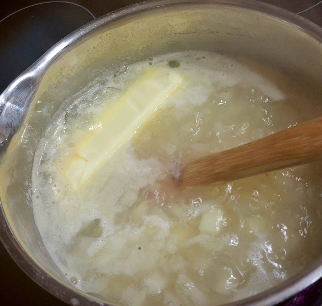 Cube potatoes small (5-6, depending on how many people), chop onion, cover with water, bring to slow boil (add salt) for about 15 minutes, or when potatoes are done. Add a stick of butter, a can of evaporated milk or heavy cream, salt❗️ & a generous amount of pepper❗️. Stir & let cook a few minutes to blend. My dad’s recipe 🤷♀️ We like it 😋