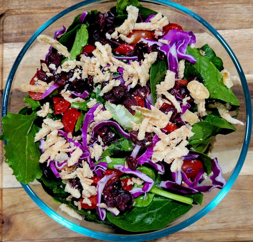 Spinach, arugala, romaine ๐ฅฌ red cabbage, cherry tomatoes, sweet red peppers ๐ถ, dried cranberries, fried onion, seasonings