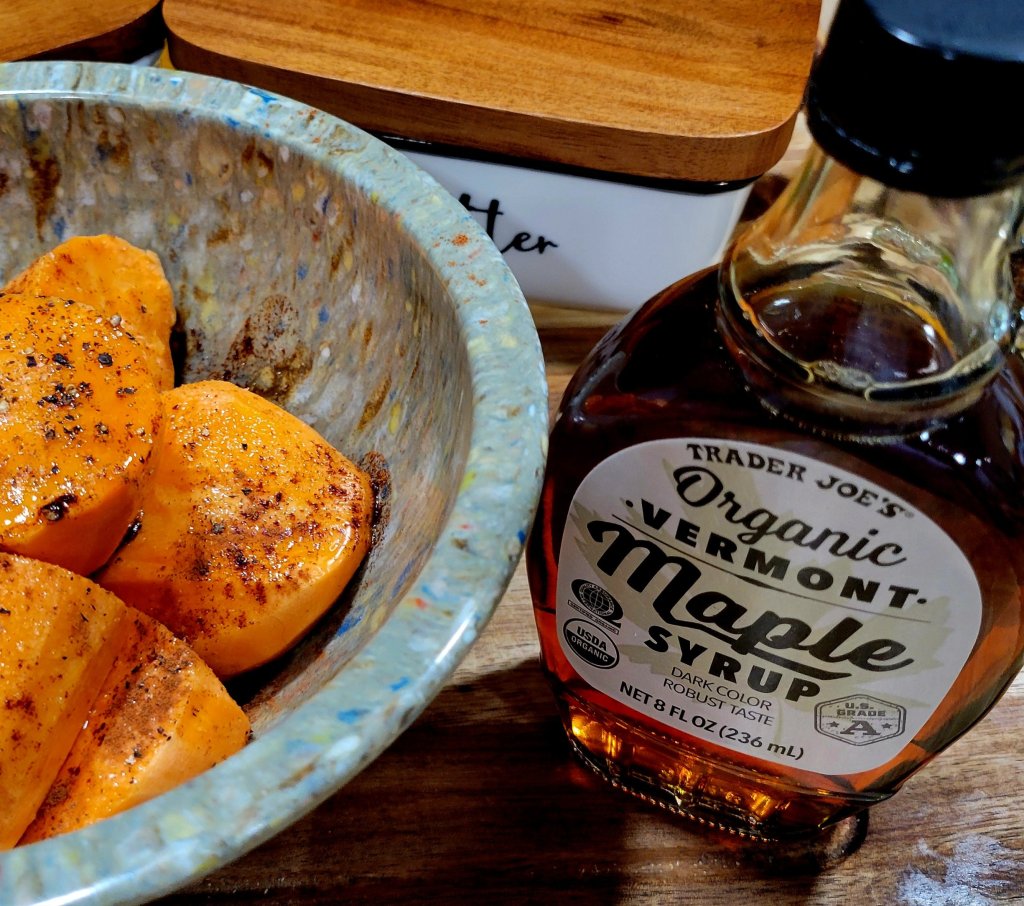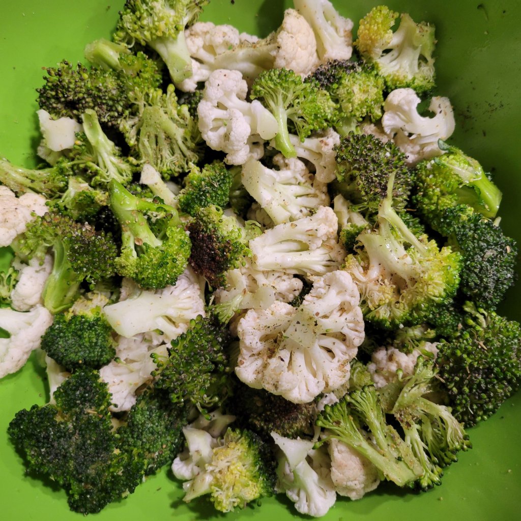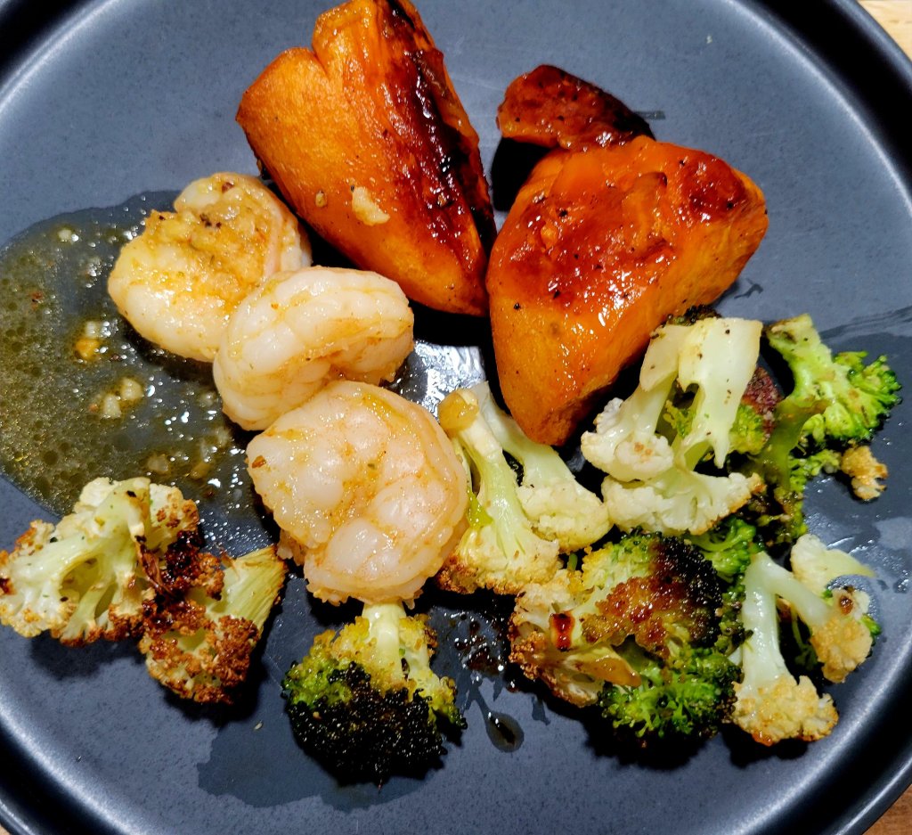 The sides, on this occasion 😉 (easy sheet pan sides), were honey and maple syrup 🍁 roasted sweet potatoes 🍠. We like ours peeled and sliced thick, meaty, tossed in 1/4 cup if evoo, 1/4 cup honey (ran low on honey, so I added maple syrup), salt, pepper, dash of cinnamon and a squeeze of lemon 🍋. Put in 375° oven for approximately 50 minutes or desired doneness. Halfway through, at 30 minutes, I added broccoli 🥦 and cauliflower, which was tossed in evoo and seasoned well with garlic, salt, and pepper.