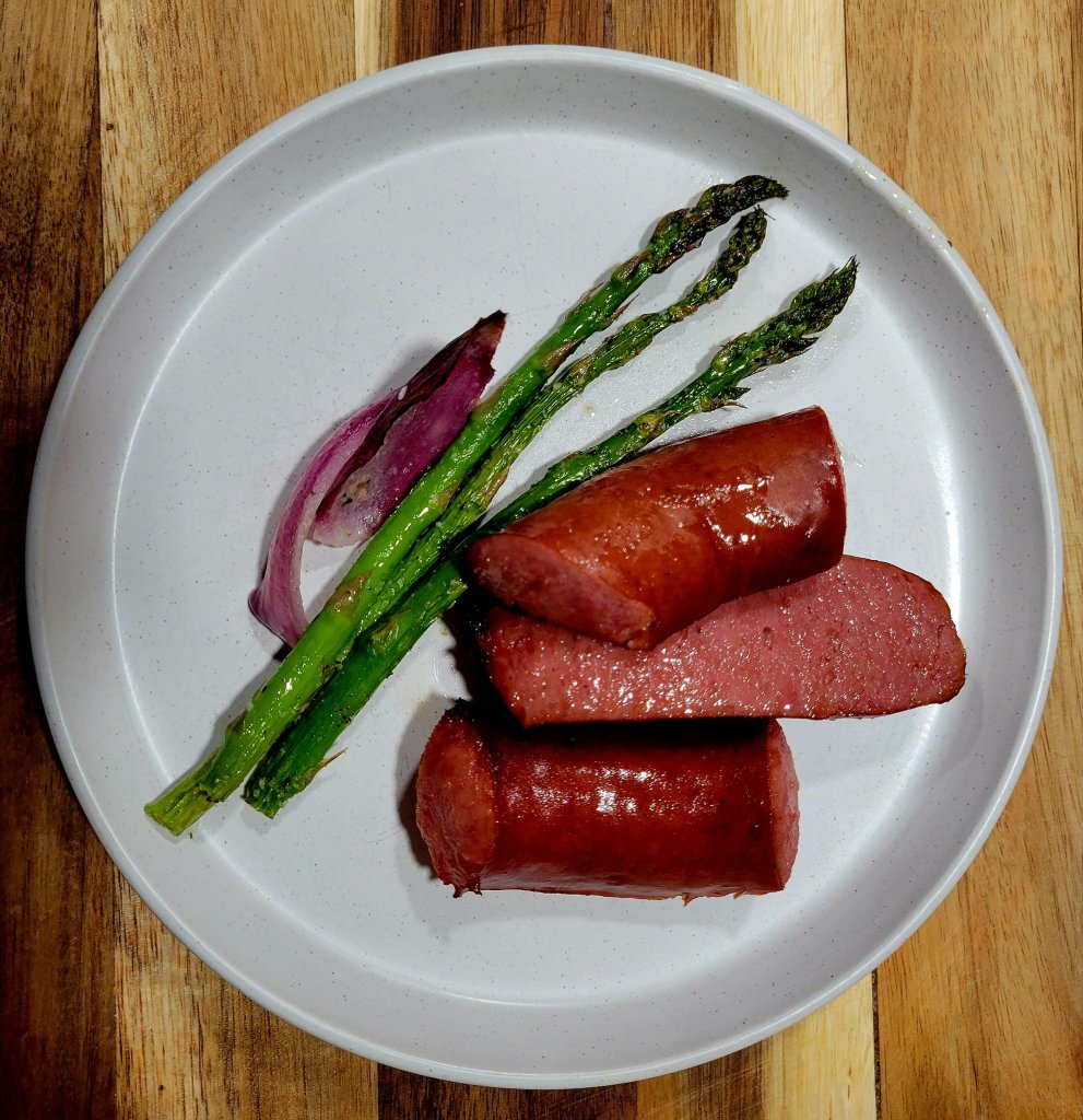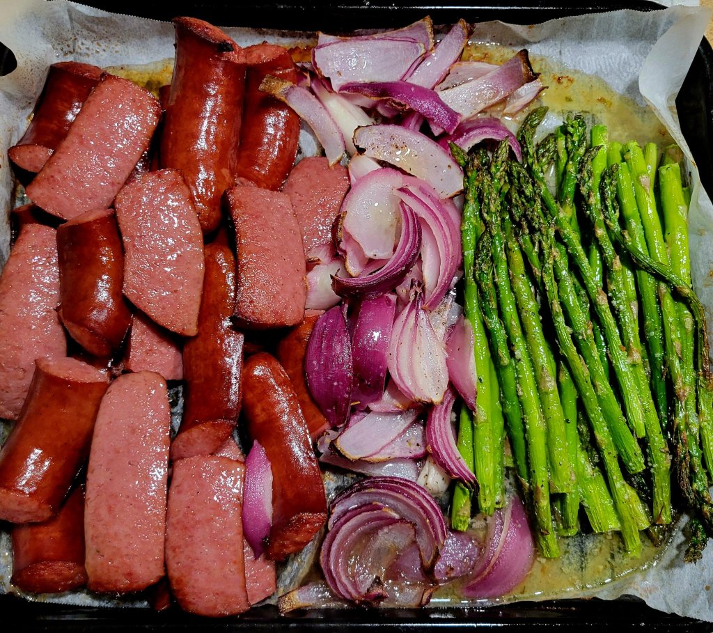 Preheat oven to 375° – cut kielbasa or favorite sausage in desired serving size pieces and place on one end/side of lined sheet pan. Clean and cut woody ends off asparagus and place that on the other side of the sheet pan. Slice red onion and put in between sausage and asparagus. I melted about 4 tbsp of butter, then mixed well with garlic powder and an herb/garlic/salt/pepper seasoning, drizzled butter over asparagus (won’t hurt if it gets on onions 😉). Drizzled a little evoo over it, too 🤷‍♀️ This would be good with alternative veggies that will cook at the same amount of time. Bake for 25-30 minutes.
