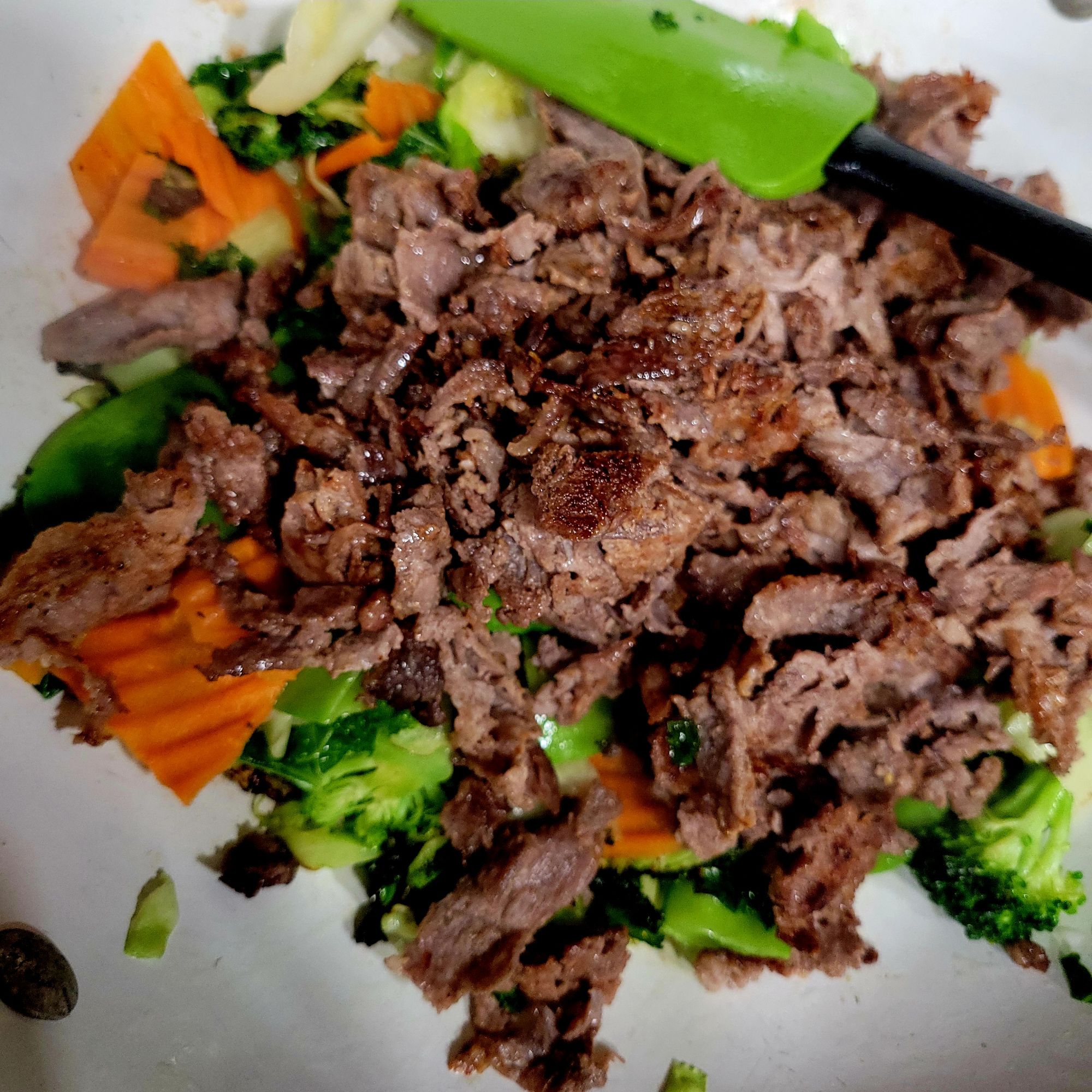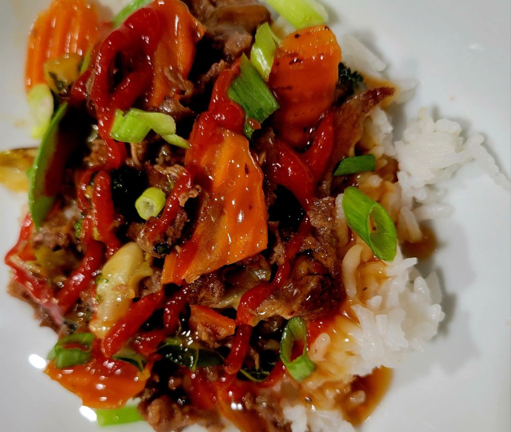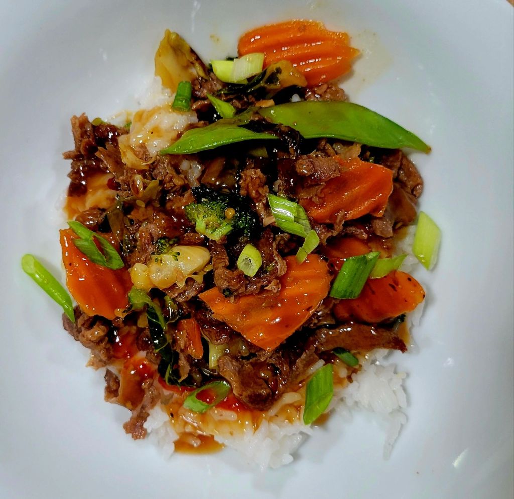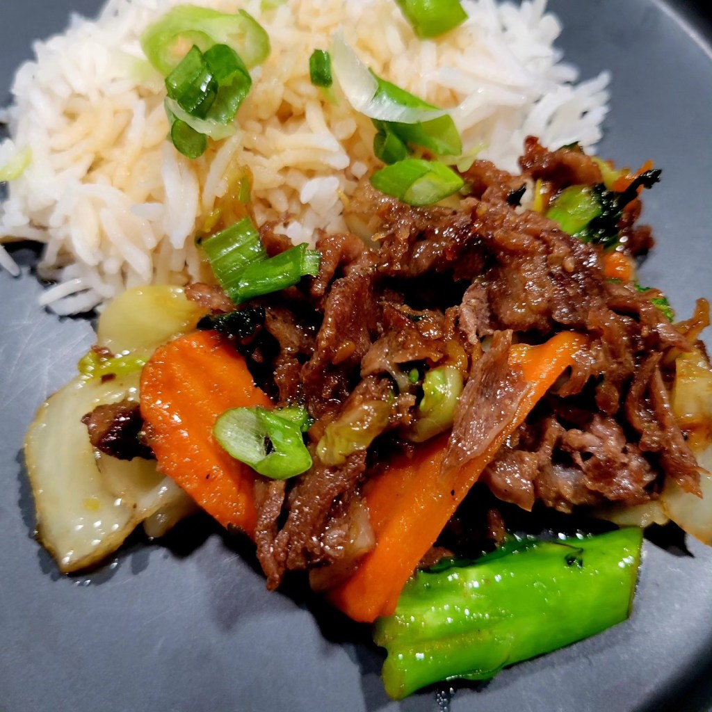 For the shaved sirloin, I got a cast iron skillet smoking hot (outdoors, inductionburner), cooked up fast, cooked veggies in my wok shaped chefs pan, stirring until tender, then added beef & sauce to veggies, continued until all heated together. π