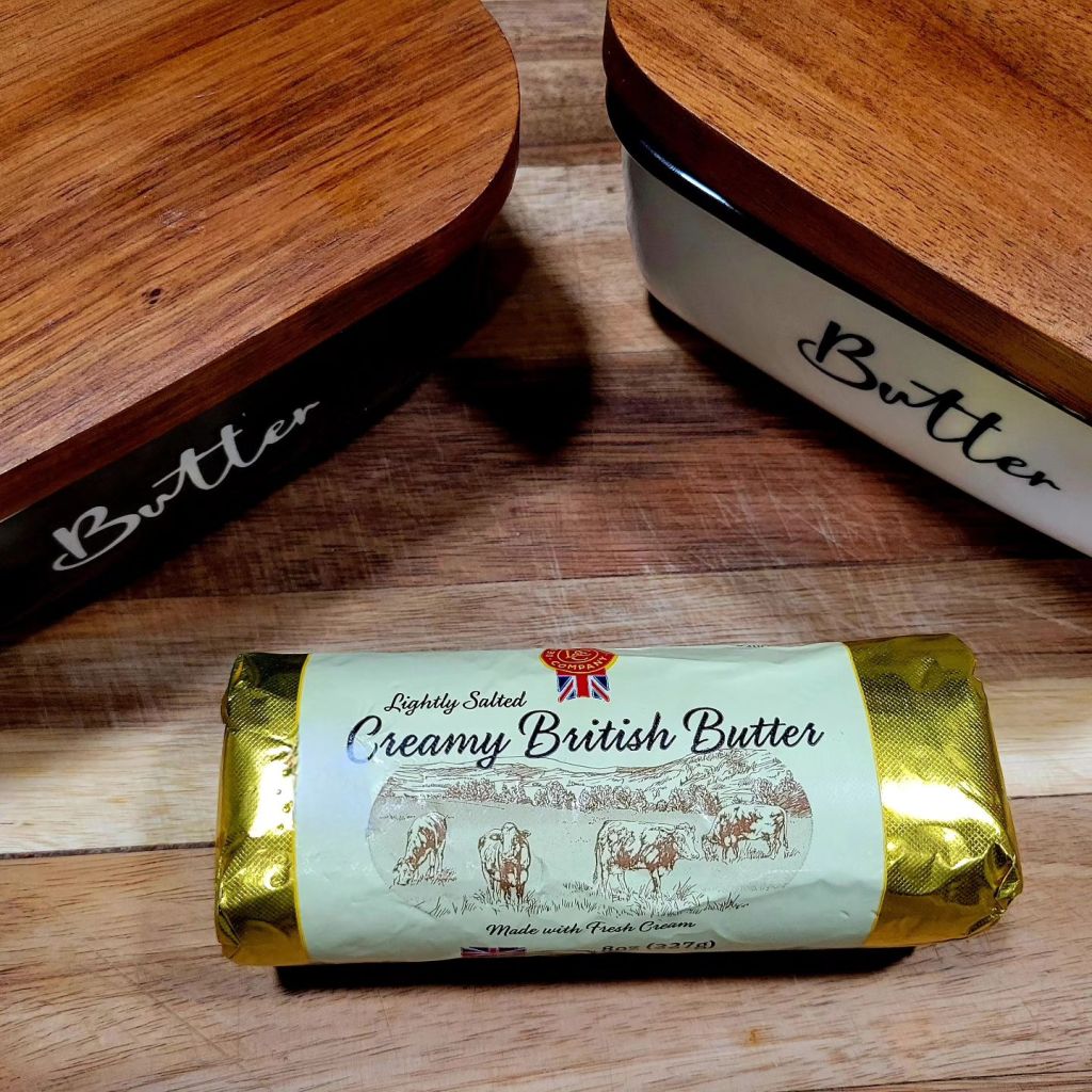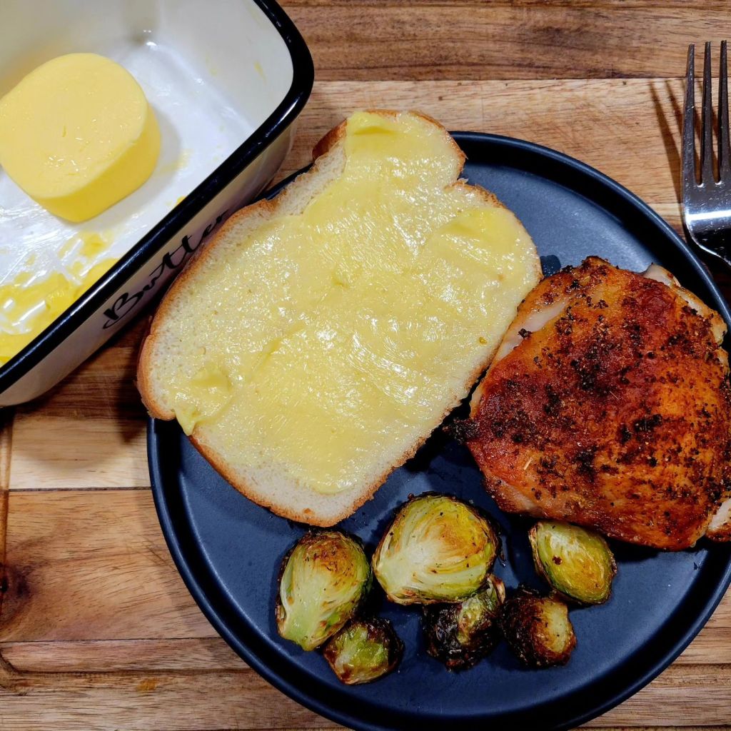 crispy oven baked chicken thighs with roasted Brussel sprouts, bread and butter; this time, creamy grass fed cultured British Butter 🧈 😋
