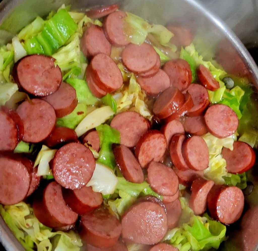 Fried cabbage with kielbasa – browned sausage and set aside, sautéed sliced onions, added about 1/4 – 1/2 cup of broth (depending on how much you have. I used vegetable broth), a dab of Dijon mustard 🤷♀️ (I ran across that in a recipe somewhere) 🤔, pepper, some chili crisp (we like spicy) and with wooden spoon I got whatever flavor stuck on bottom, added chopped/sliced cabbage and put kielbasa back in, stirred good, covered and let cook until cabbage was done. Might have been 20 minutes. Stirring a couple of times during cooking. When the liquid cooks out, the cabbage will fry or sauté, stir until it’s to your liking.