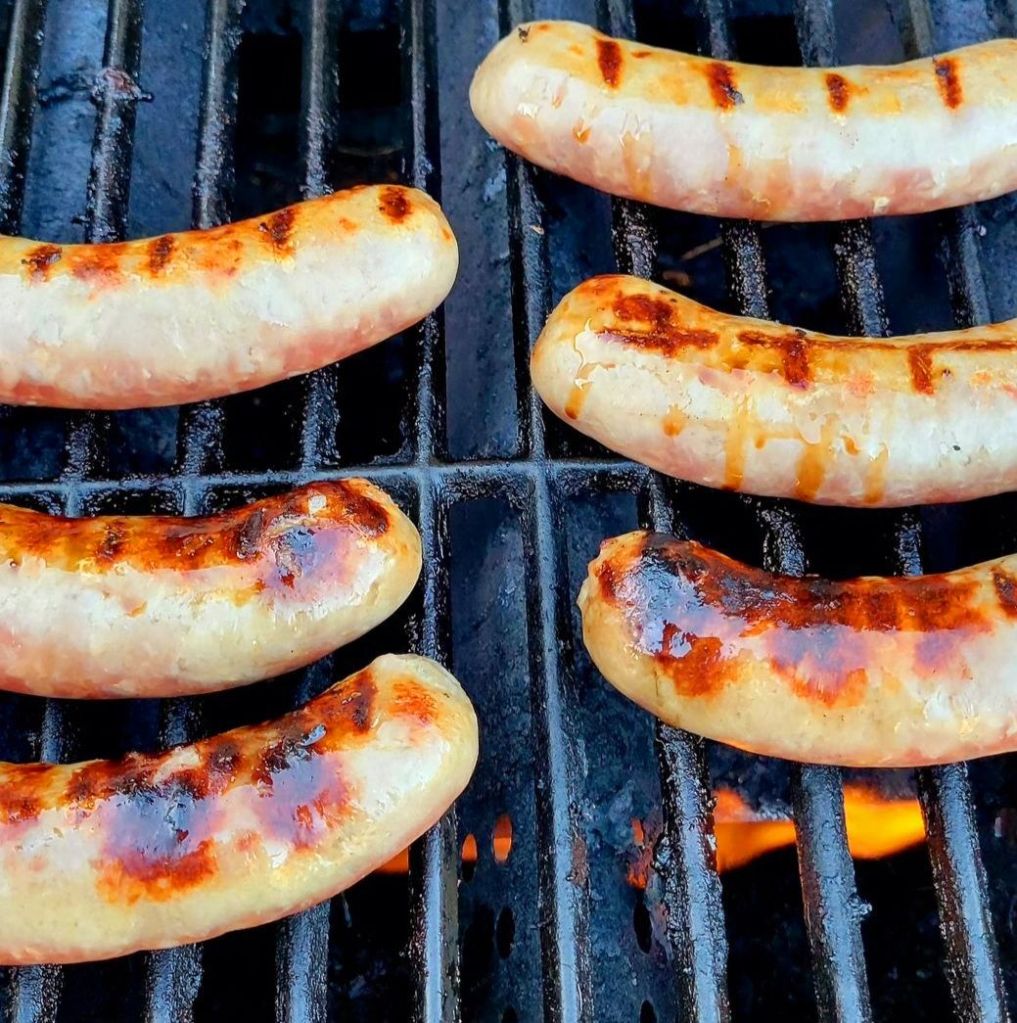 Grilled beer brats (they came made in beer already). I thought I got them too charred, but then my family all grabbed the most charred ones first! 🙃 and I thought I’d be the only one going with no bun; noooo… everyone else chose no bun also 😵💫 I made air fryer onion rings and roasted asparagus to go with brats, and bbq sauce for me.