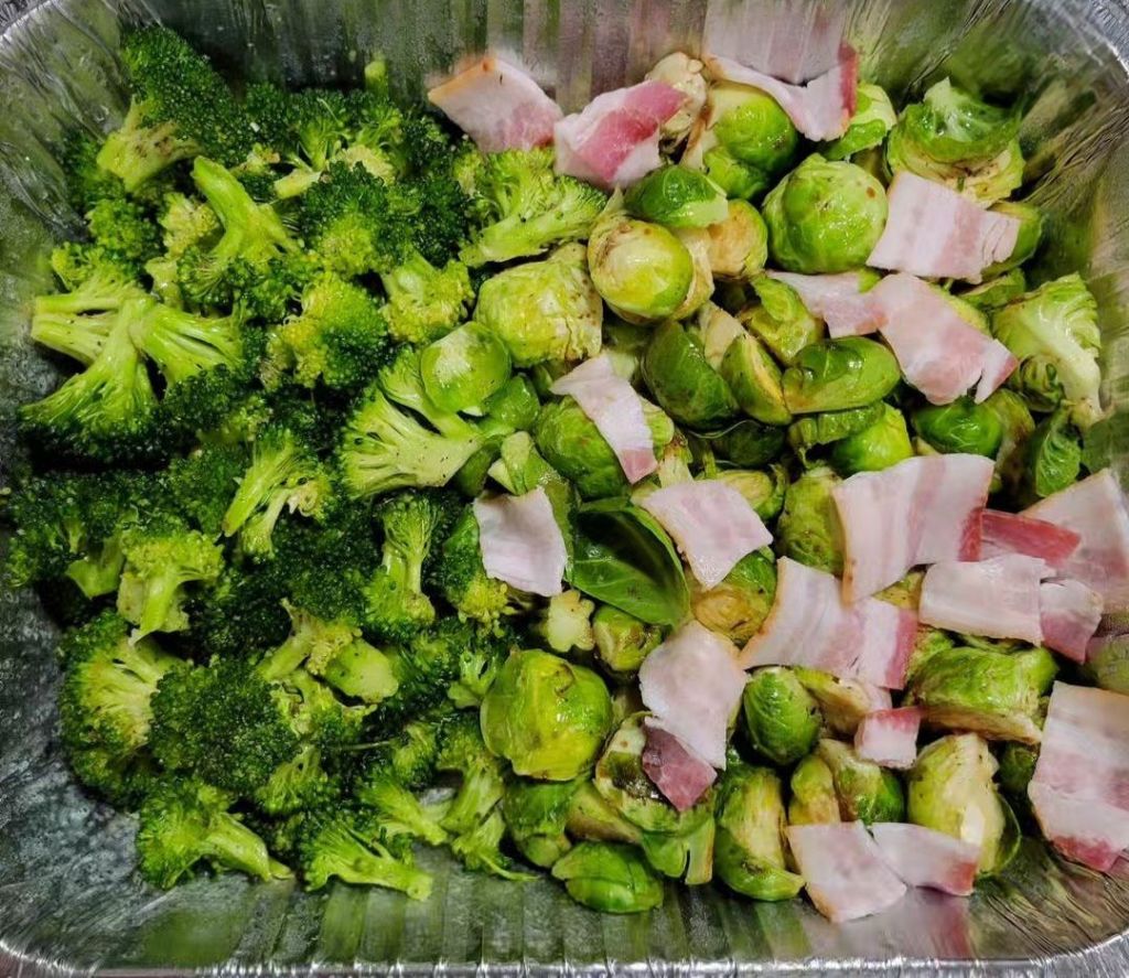 My granddaughter chose Brussel sprouts and broccoli 🥦 as a side to take to her school potluck. So I cleaned, trimmed, cut veggies, tossed in evoo, salt, pepper, garlic powder, and an herb seasoning. I separated them into baking pan in case anyone didn’t like one or the other. I added bacon on top of sprouts. 425° for about 20-25 minutes (I use a convection oven) Grated grana padano over all after it was done. 🧀 They liked it AND turned out to be the right choice, with dishes others brought; the only vegetables and something green 💚 😀