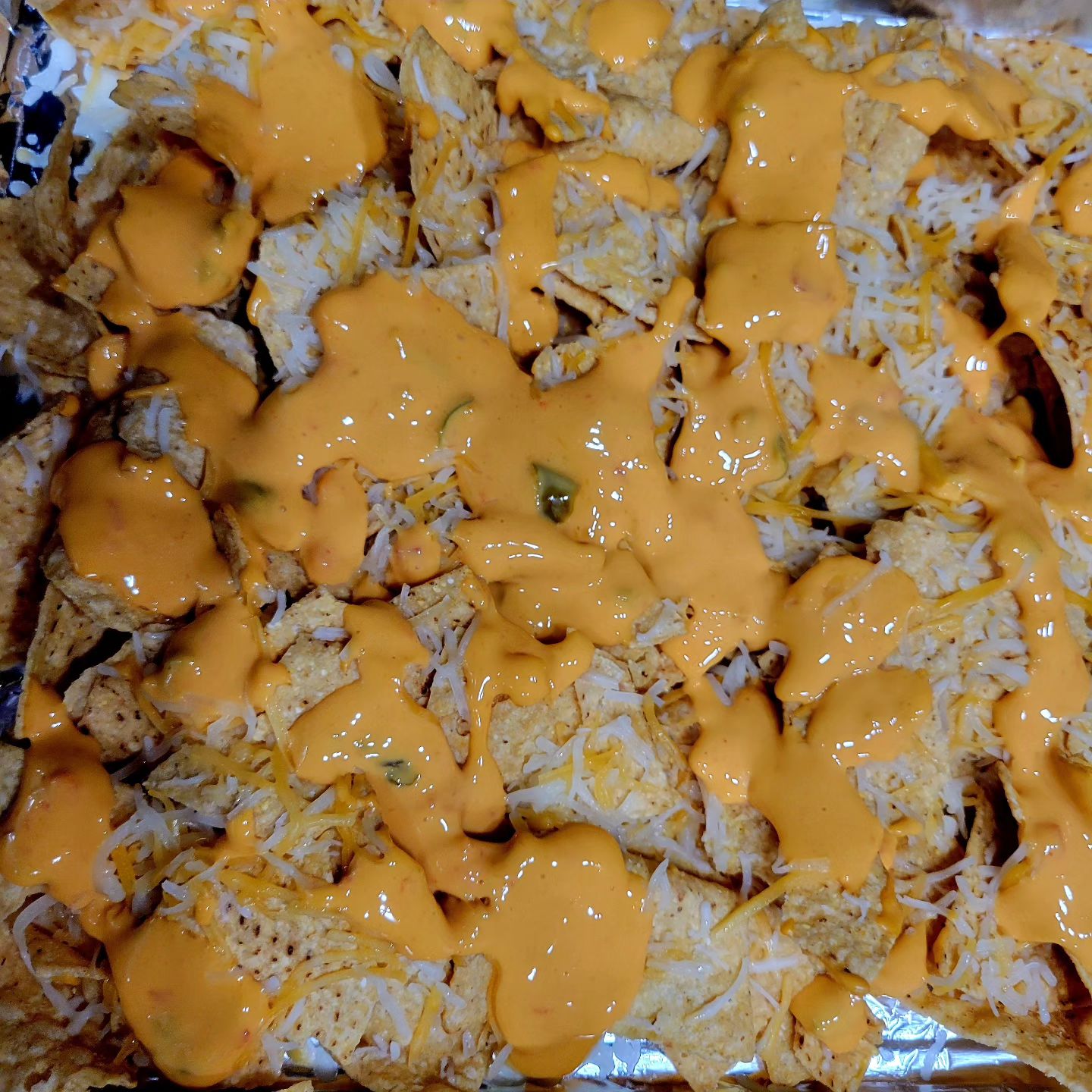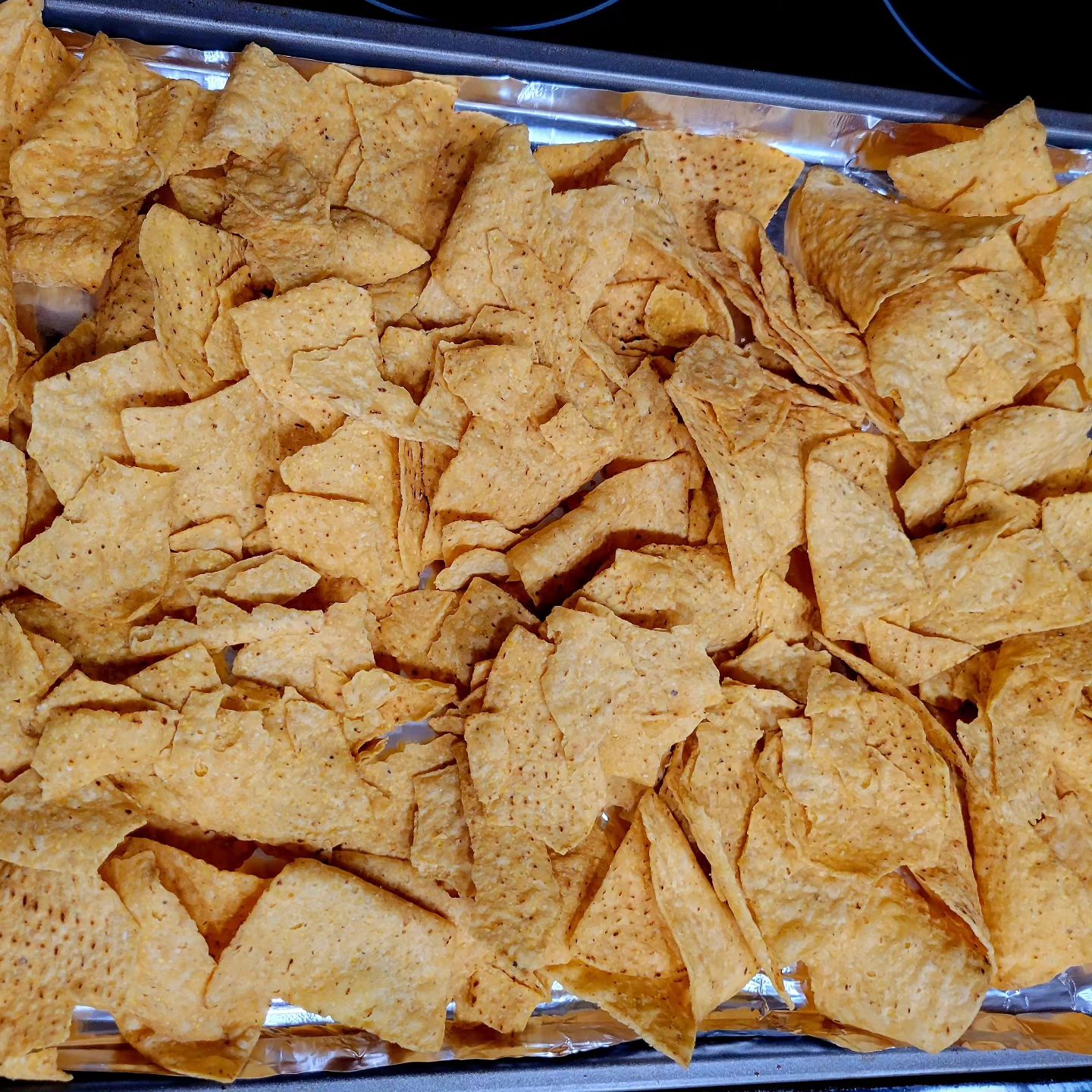 Easy & turns out perfect every time.ย Oven on 300ยฐ, spread tortilla chips on lined baking sheet, put in oven for 5 minutes. Add half the cheese you’re using (we use queso dip AND shredded ‘cheddar’ types) put in oven another 5 minutes. Add whatever toppings you like (shredded beef, chicken, pork), we like black olives, red onion, tomato ๐
