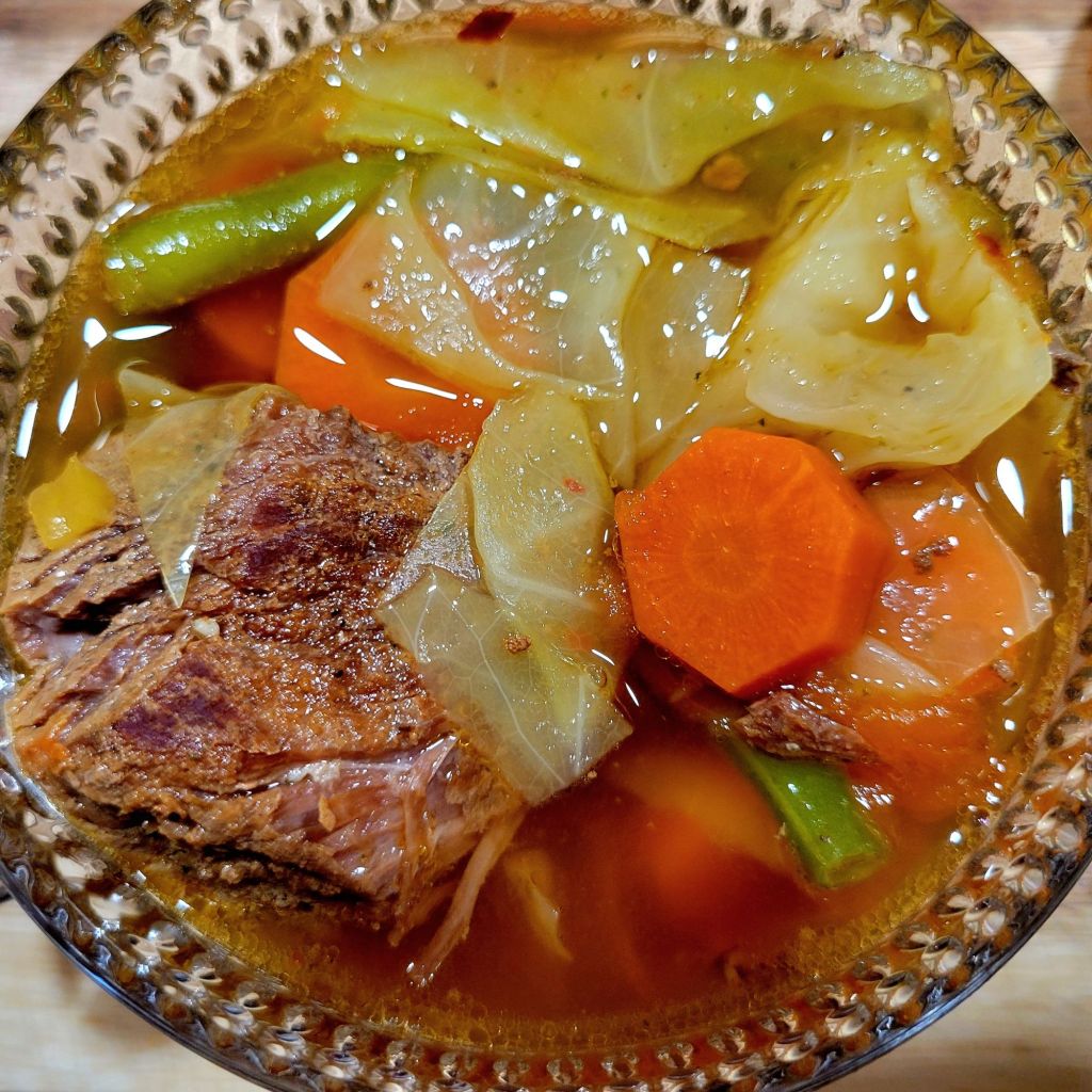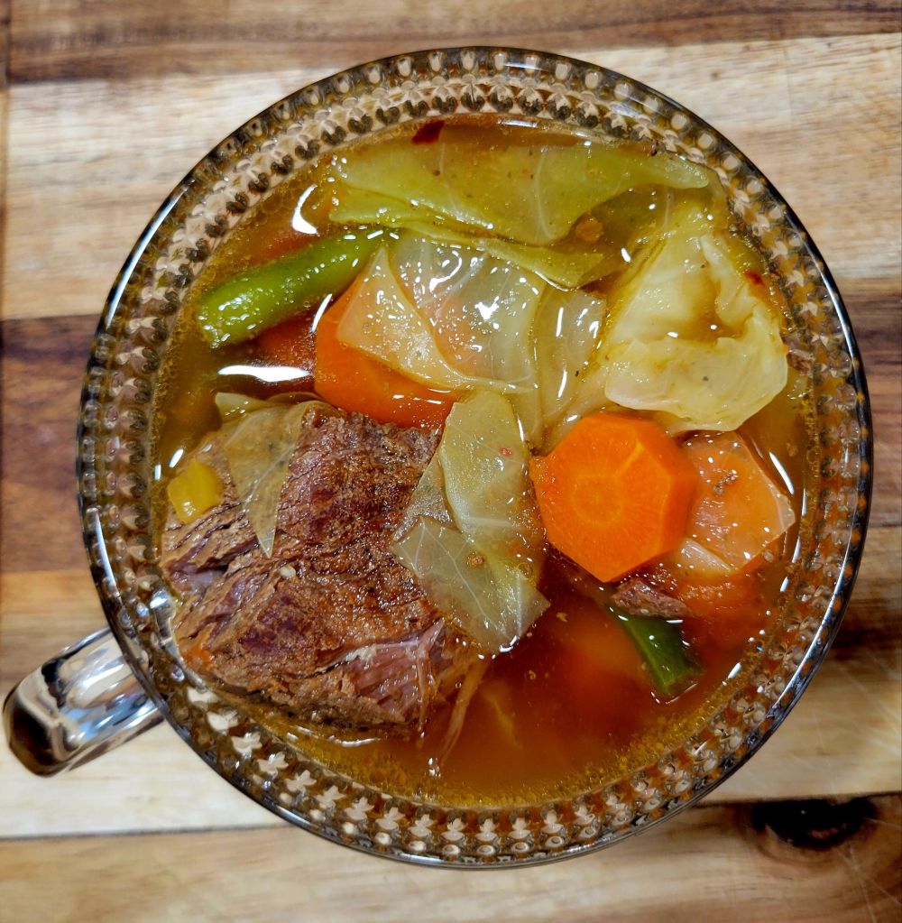 I made this soup a little different this time 😉 I had frozen 🫨 steak tips from Good Ranchers, where my daughter and I have been getting our meat 😍 SO, I left them out long enough to be able to season and sear them in my pressure cooker. Then I added a cup of beef broth and PC them for 30 minutes. It worked! 🫣 yay 👏 Actually, it worked beautifully. While that was cooking, I sautéed onion and garlic in garlic infused evoo. 🤔 added 3 cups of broth (guesstimate), combination of vegetable broth and beef broth. I also added a couple dashes of Knorr’s chicken bouillon with tomato. And because I just made homemade stewed tomatoes for my freezer, I added 1 cup of that. Brought that to a low, slow boil. Added steamed carrots and green beans (microwave with a tbs water for couple minutes), cabbage, and seasonings; couple tsp each of garlic powder, onion powder, celtic sea salt, fresh cracked black pepper, crushed red pepper flakes, and a teaspoon of sugar. When beef was done, I added it, along with liquid from PC to pot of soup. Let that cook until the cabbage is tender. The vegetables were all done at the same time. Not overcooked or under. I did not have Knorr’s Vegetable Soup Mix, but I didn’t need it. I have Better Than Bouillon soup bases, all flavors, along with their powder bouillon. Taste throughout and adjust seasoning to your liking.