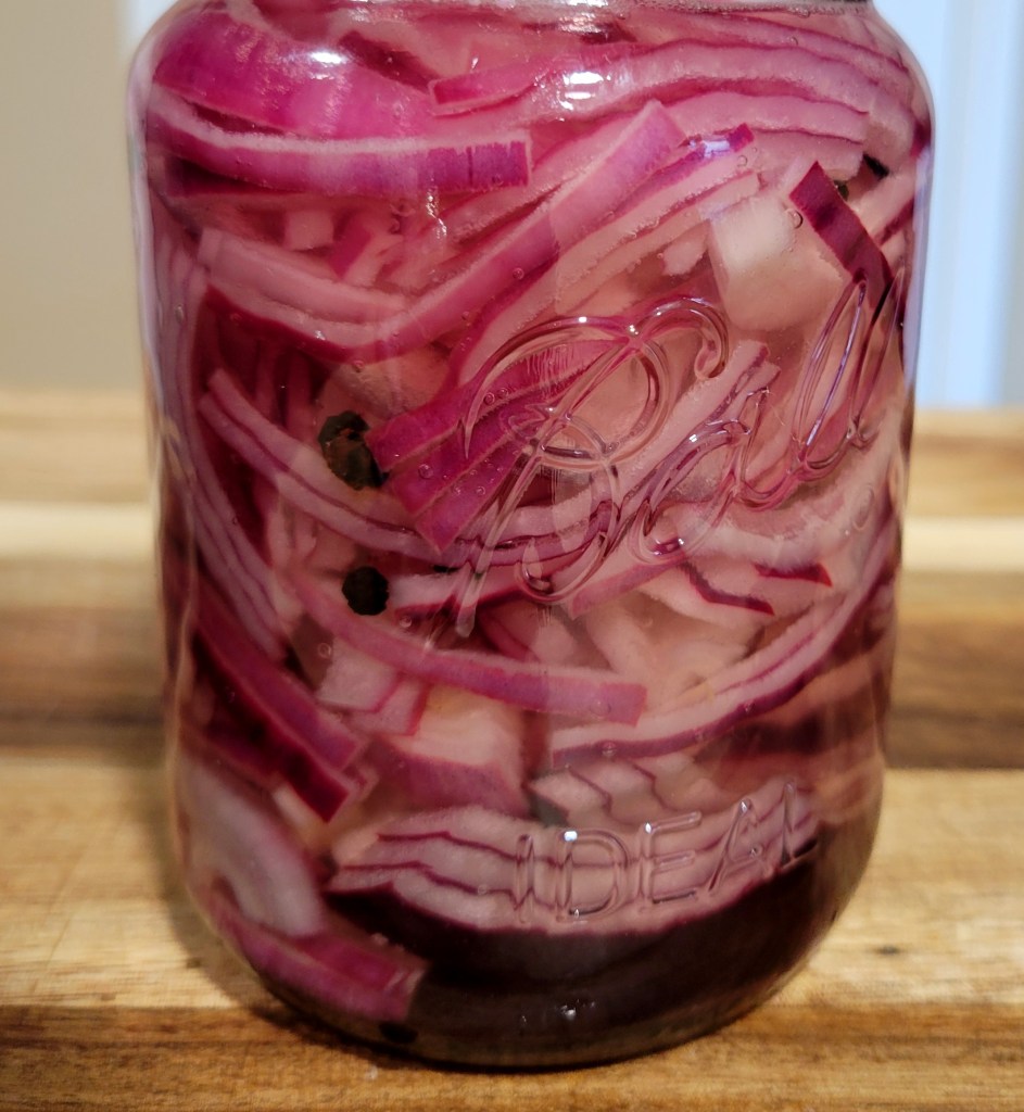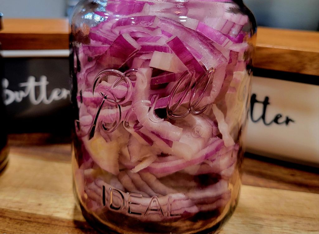 Whisk ½ cup apple cider vinegar, 1 Tbsp. granulated sugar, 1½ tsp. salt, and 1 cup water in a small bowl until sugar and salt dissolve. Place 1 red onion, thinly sliced, in a mason jar with a tight-fitting lid; pour vinegar mixture over. Let sit at room temperature for 1 hour.