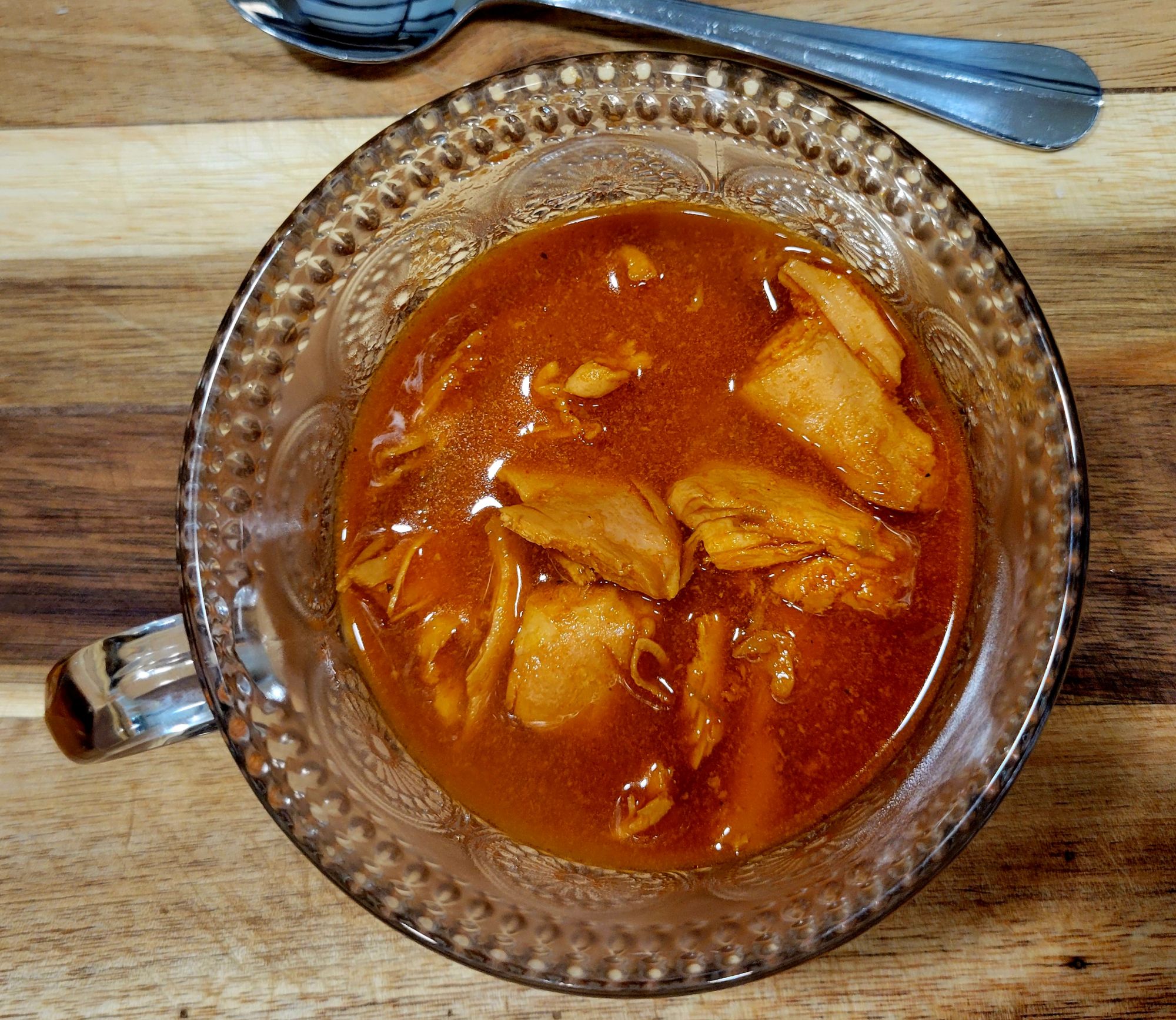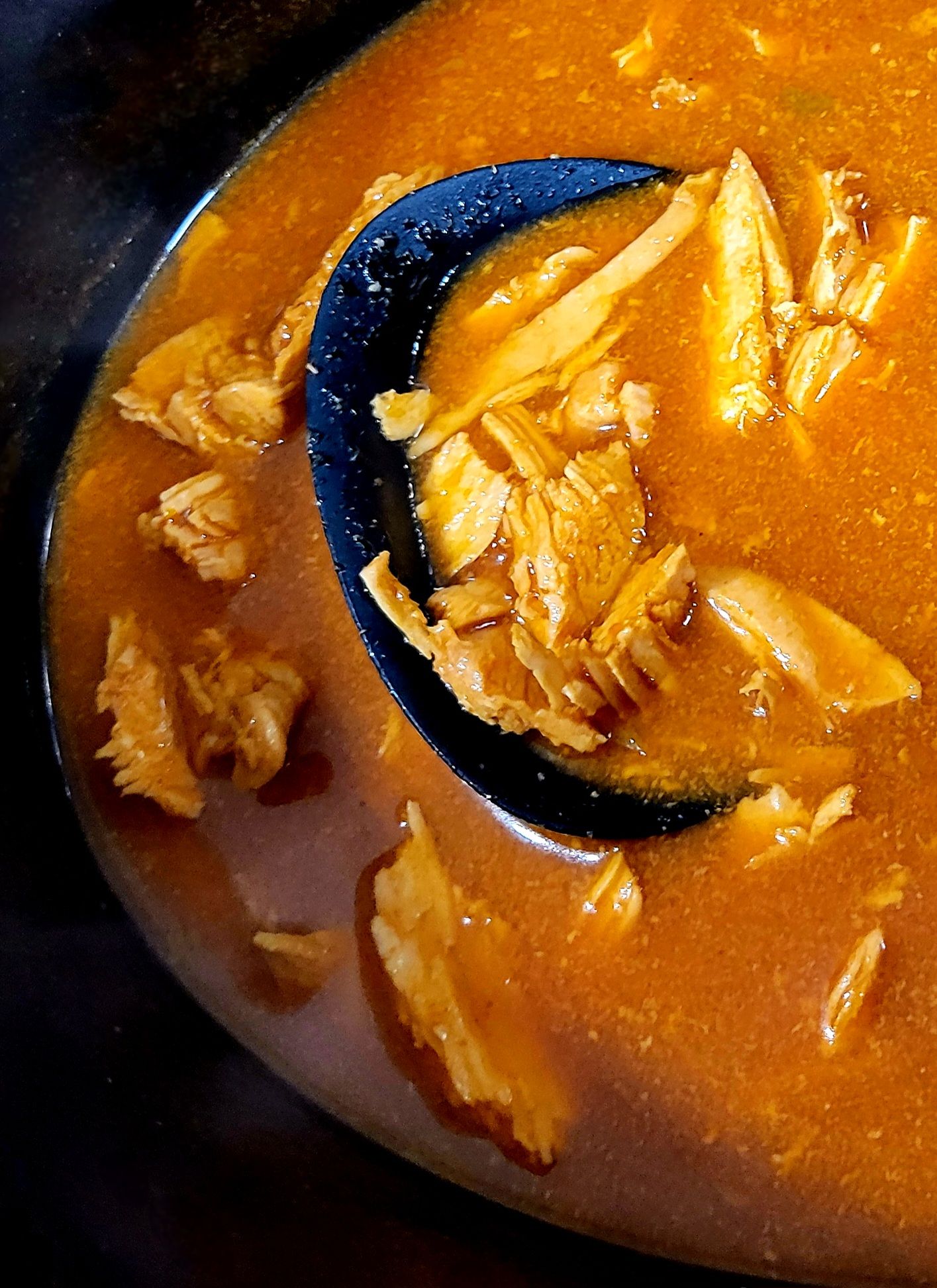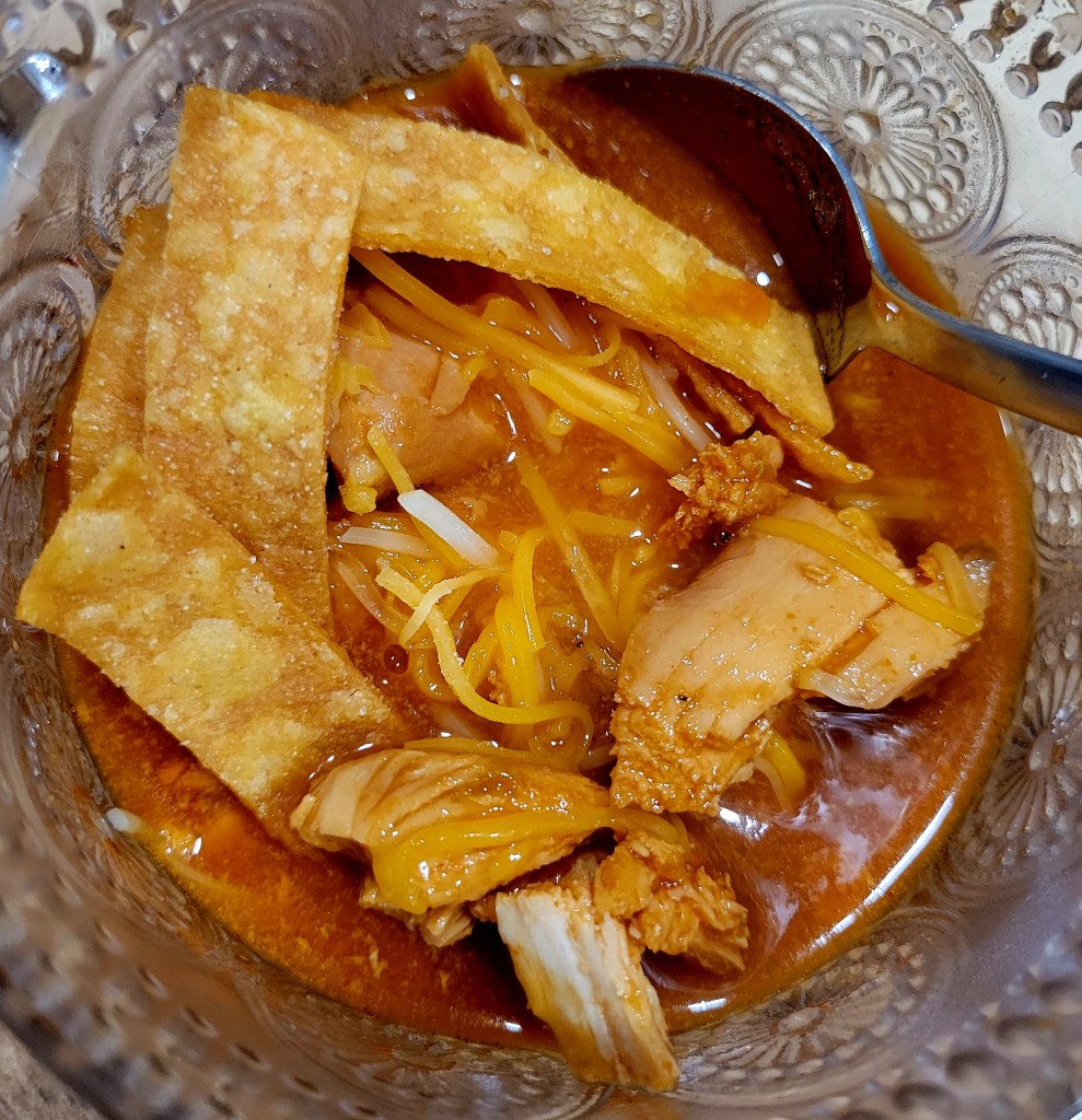 Place chicken in slow cooker. Add chile, peeled halved onion, garlic from sauce pan, along with the water (or broth) to blender. Add chipotle chilies & adobo sauce from container of chipotle to blender and mix thoroughly. Strain and pour over chicken in slow cooker; or strain straight into slow cooker 😉. Add chicken broth or stock to desired consistency, then seasonings. Cook on low for 6 – 8 hours or high 4 – 5 hours. It’s done when chicken easily pulls apart. Shred or cut chicken. Then cut tortillas in strips, fry in a little oil & serve either in bottom of bowl with soup on top or because my family likes crispy, serve on top of soup, like you’d do with crackers on chili 🥰