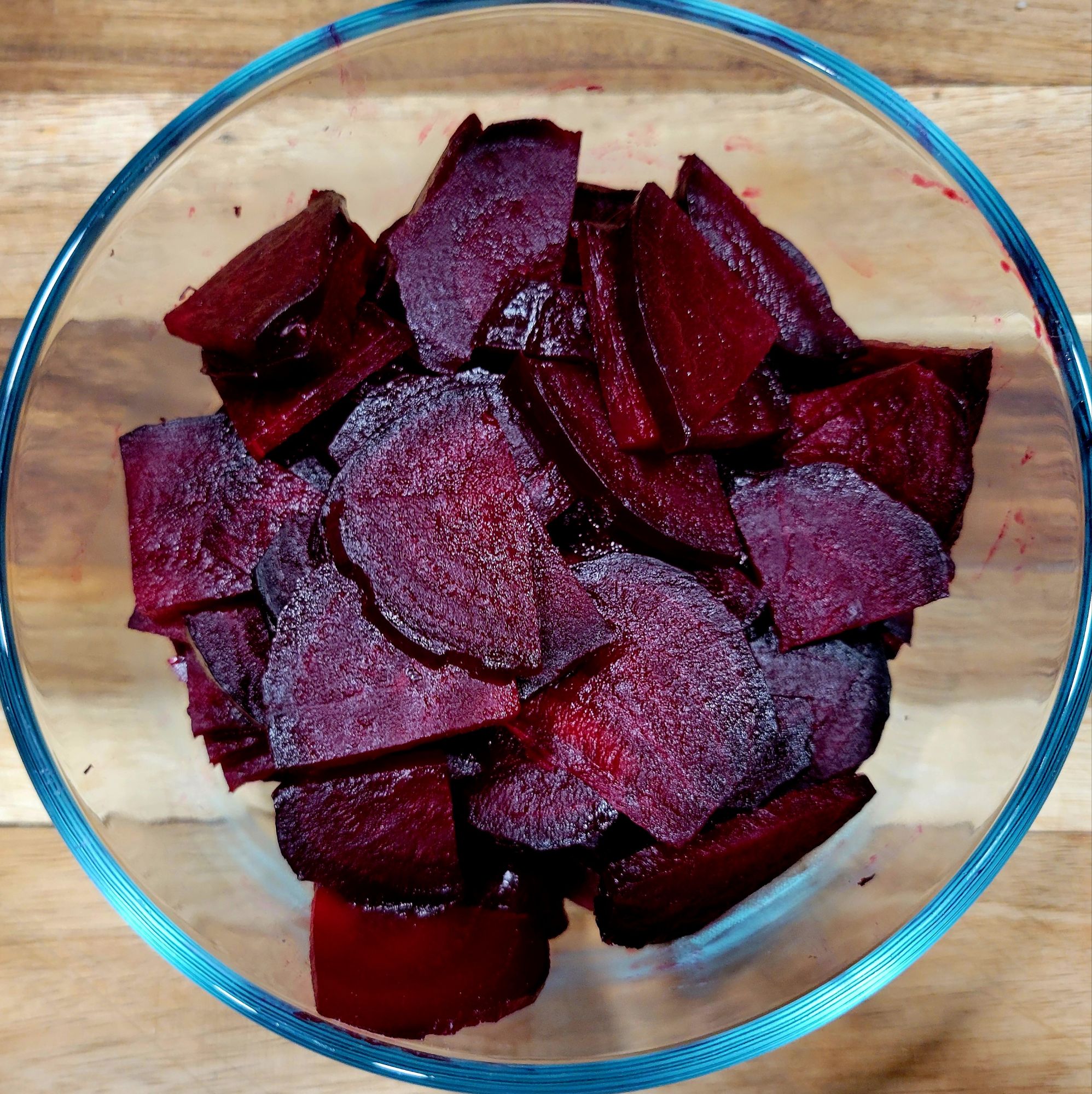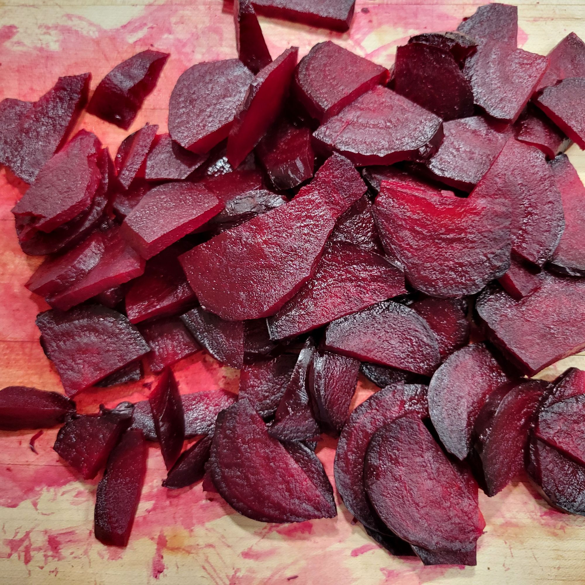 Cool and Prepare Beets – I recommend gloves 😉 Allow them to cool to room temperature, and then trim the roots and peel the skins- they should peel right off, super easy. Slice them into wedges if used in salad. Or store in refrigerator for later, up to 3 days. Good in smoothies, too 😋