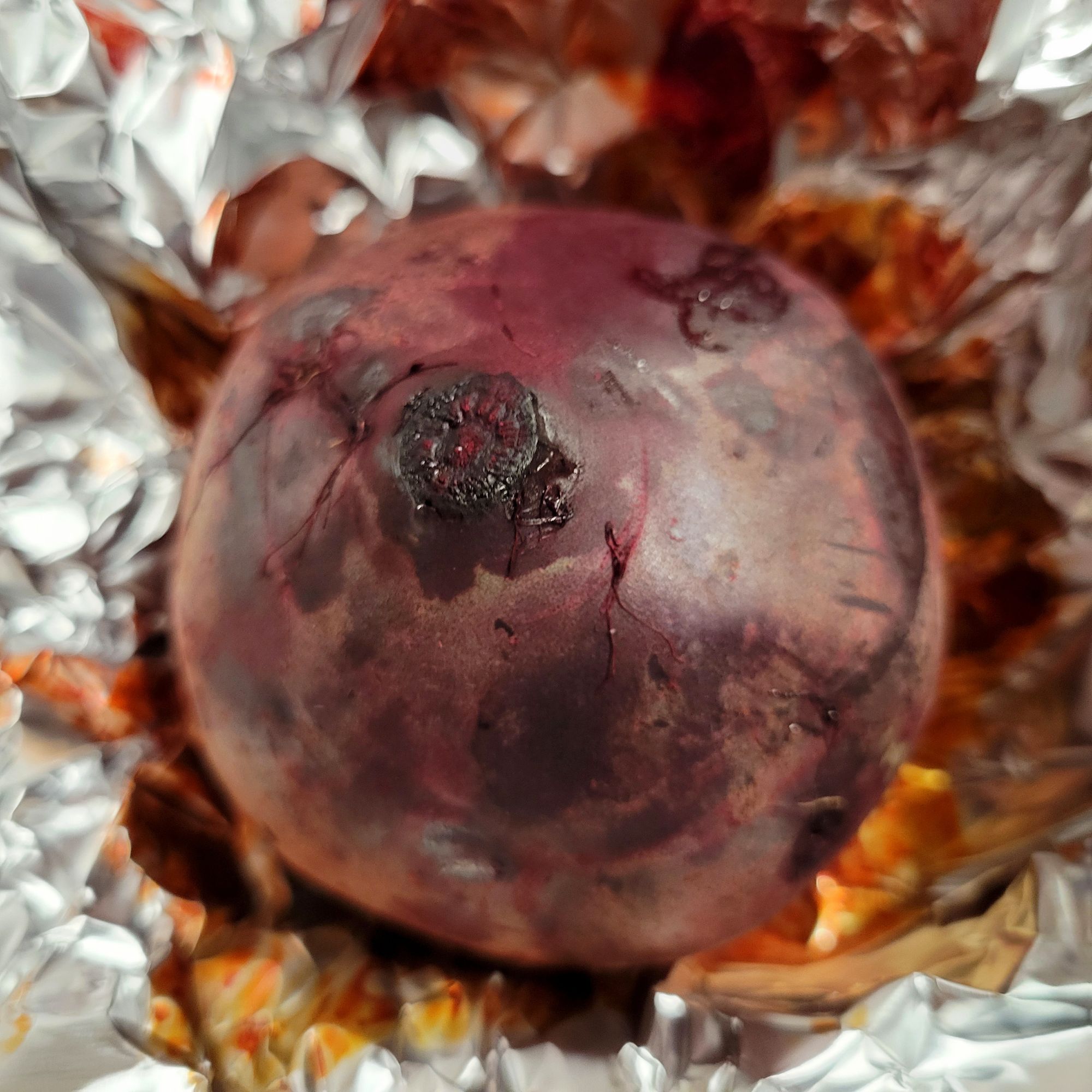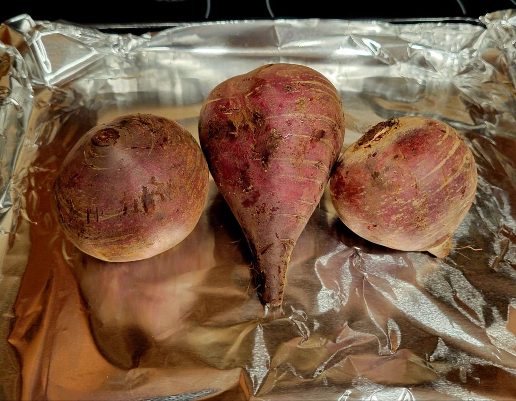 Wash and trim the beets so that the stems are about ½-inch long and the roots are no more than about 2 inches long. Preheat your oven to 400°F. and line the bottom of a rimmed baking sheet with foil. Tightly wrap each beet in aluminum foil to seal and arrange the beets on the baking sheet. Bake for 1 hour or until the largest beet is easily pierced. Unwrap the beets.