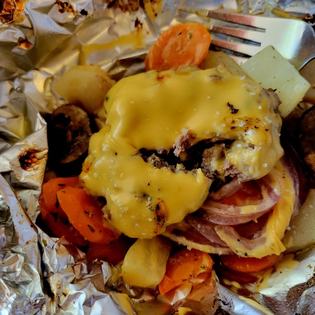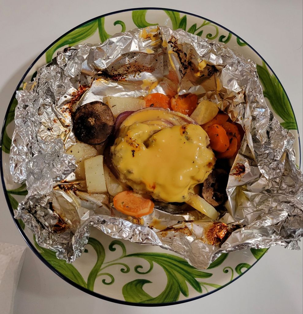 […] Hobo dinner aka Foil packet dinner was really good! I put the seasoned beef patty on top of seasoned veggies this time & cheese after removing from oven; just close the foil back somewhat, cheese is melted before you can turn around to serve đ […]