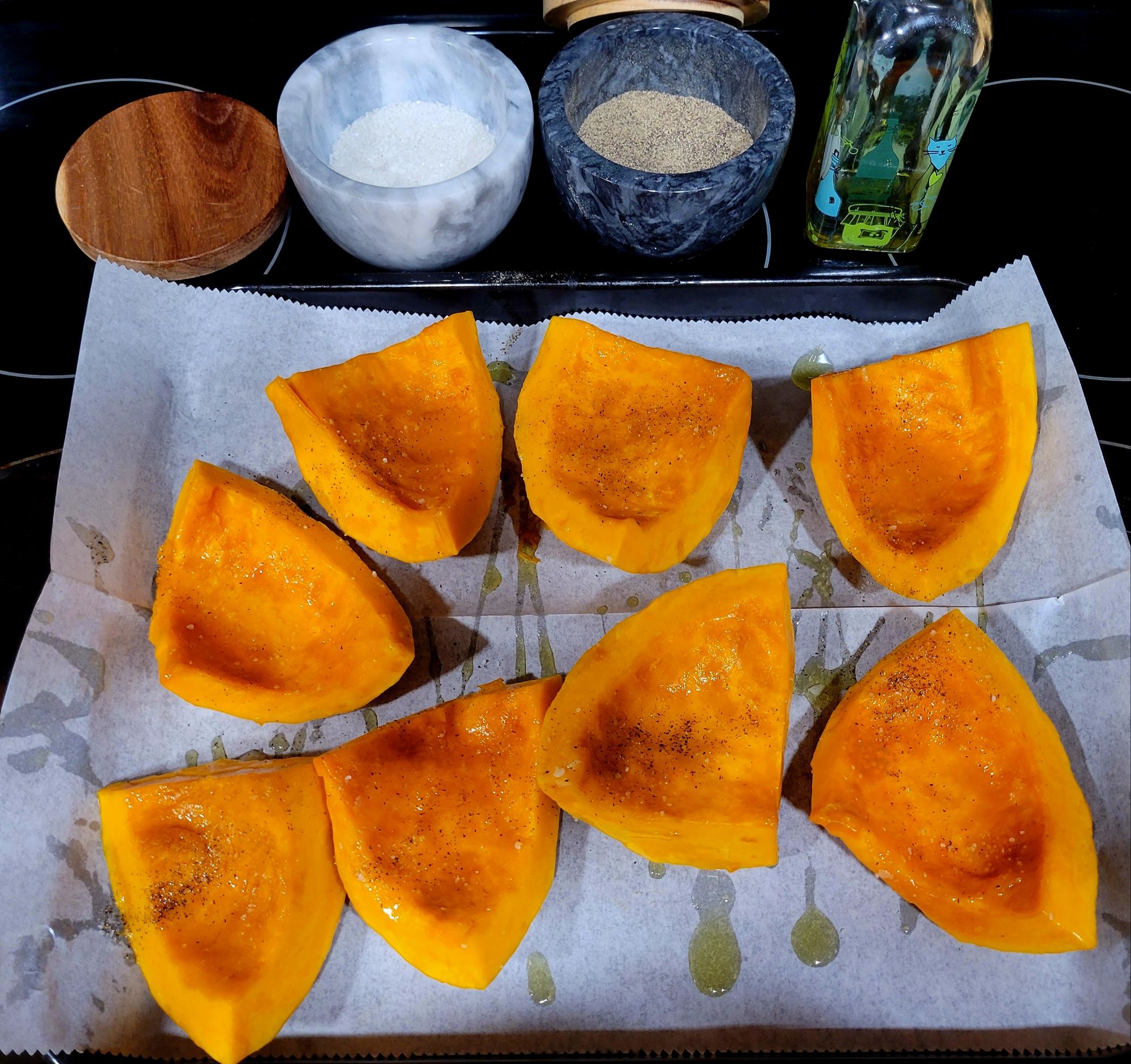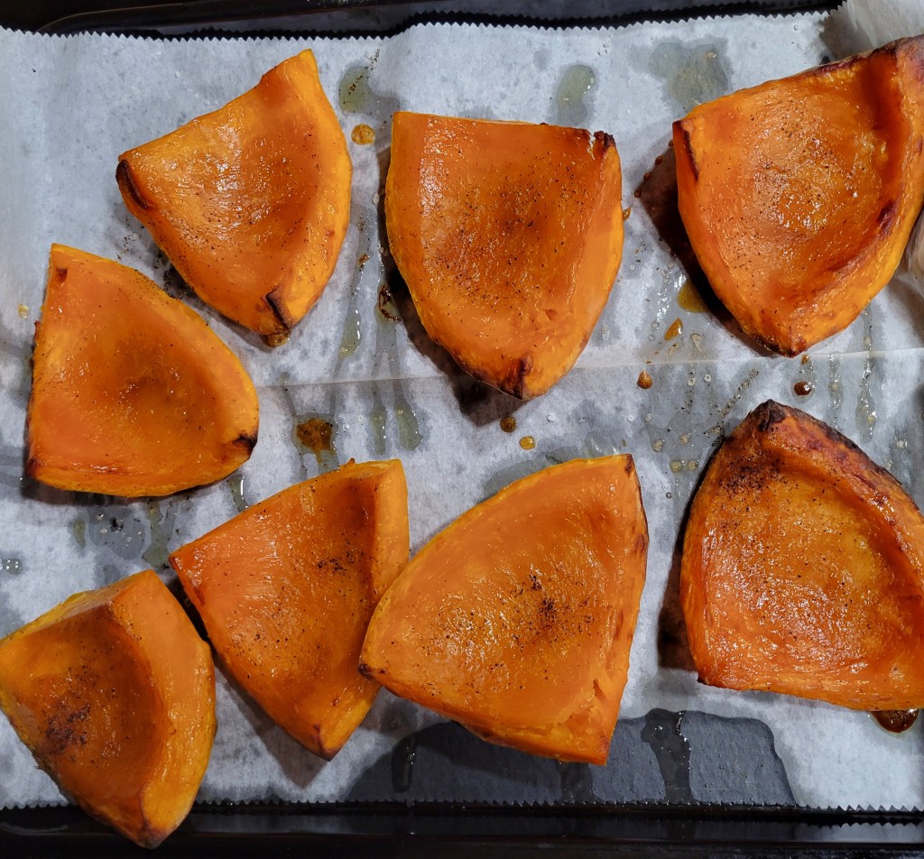 This kind of squash is used the same way as acorn squash or sweet potatoes. They taste like a mix of pumpkin and sweet potato. So I peeled off some of the skin, although it’s not necessary; the skin is thin and edible. This move on my part was for someone in my family who doesn’t like the skin 🙄 🤭 then cut in half, scrape out seeds and stringy part with a spoon, then cut in quarters, drizzled with evoo, celtic sea salt and fresh cracked black pepper. My daughter requested a drizzle of maple syrup on it, and it was great. Roasted in 375° oven for 30 minutes. Usually, it’s more like 400°-425°, but I cooked it at the same time as chicken, at temperature for chicken, because I knew the squash would work with that. How long depends on the size you cut squash. There’s a recipe and more information at Drive Me Hungry. 😉