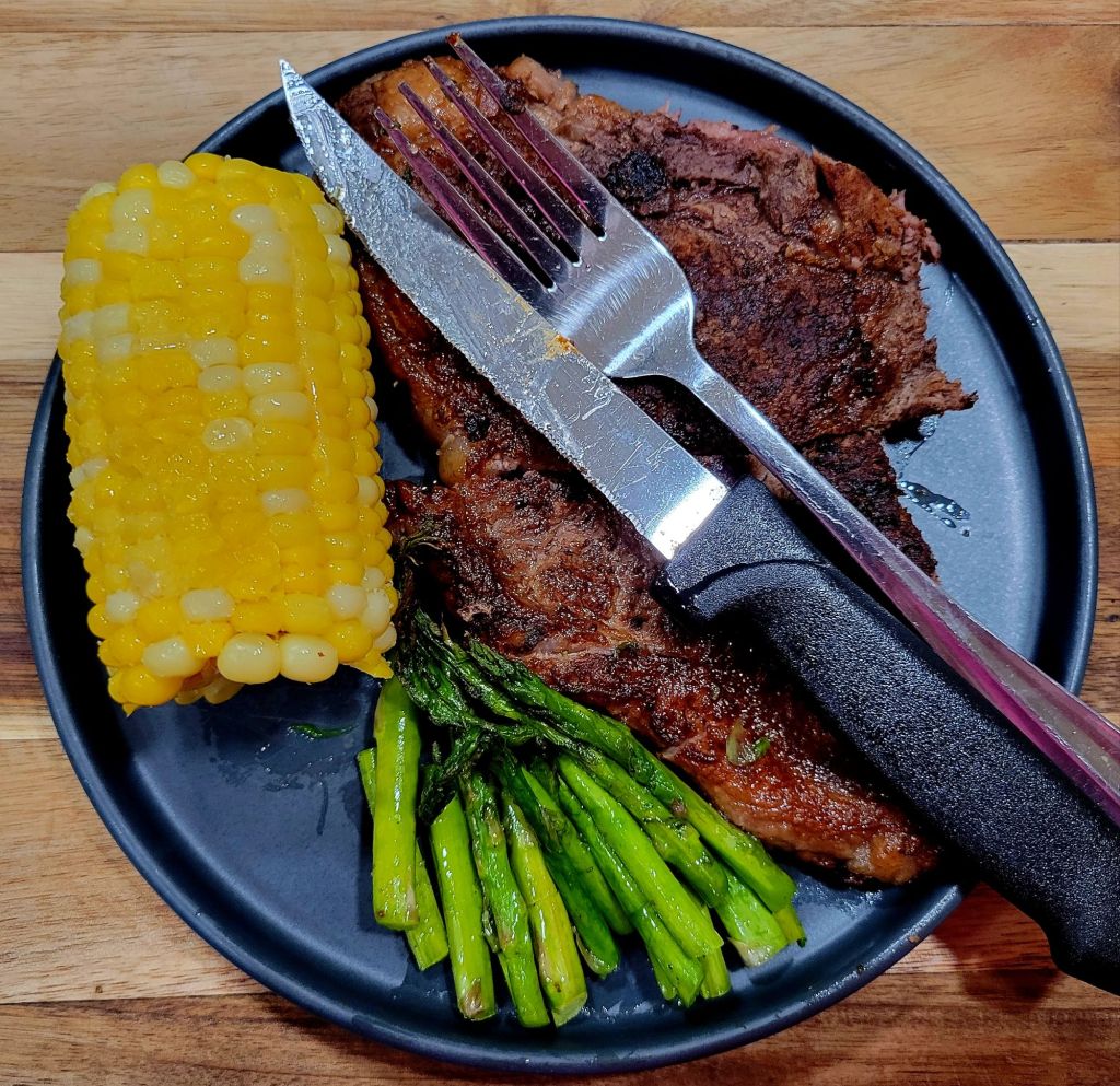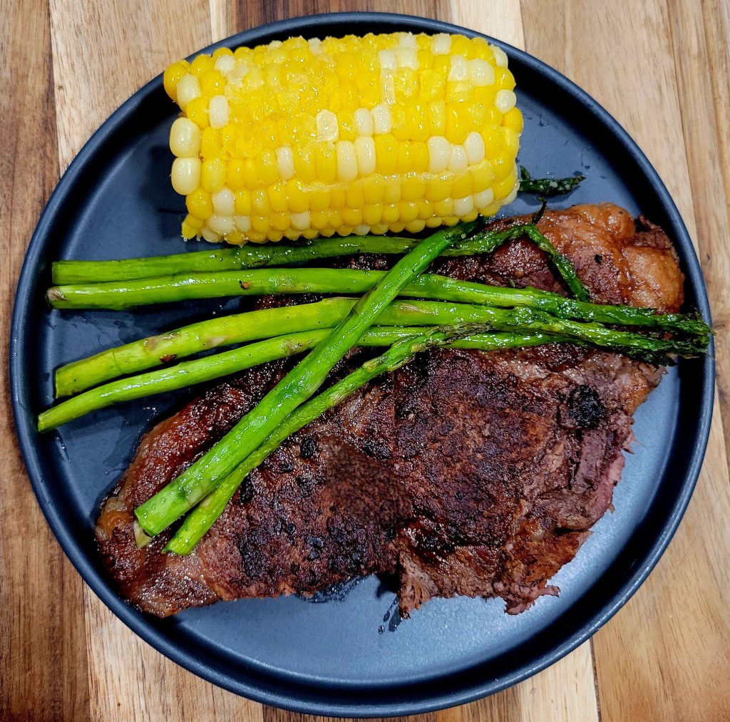 Steak, from local ranchers, with fresh vegetables, from local farms; corn π½ and asparagus.