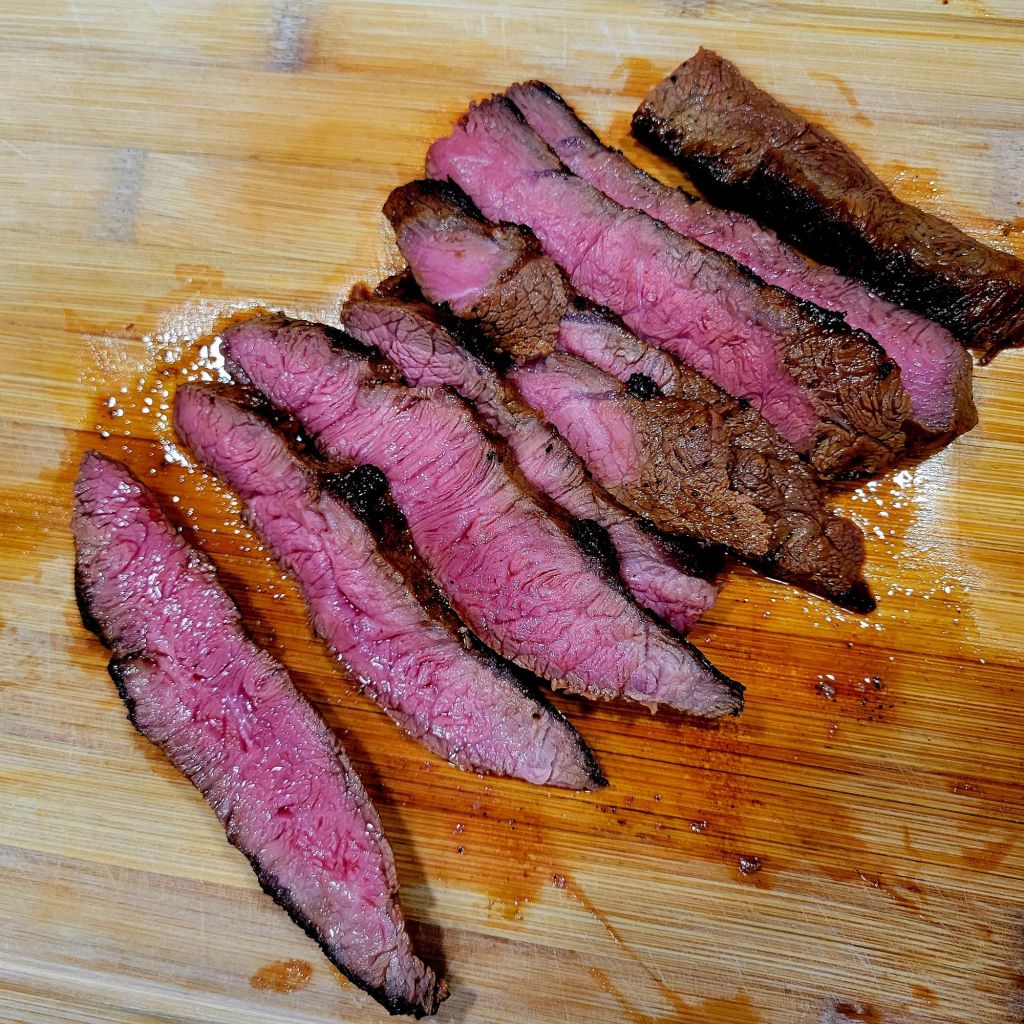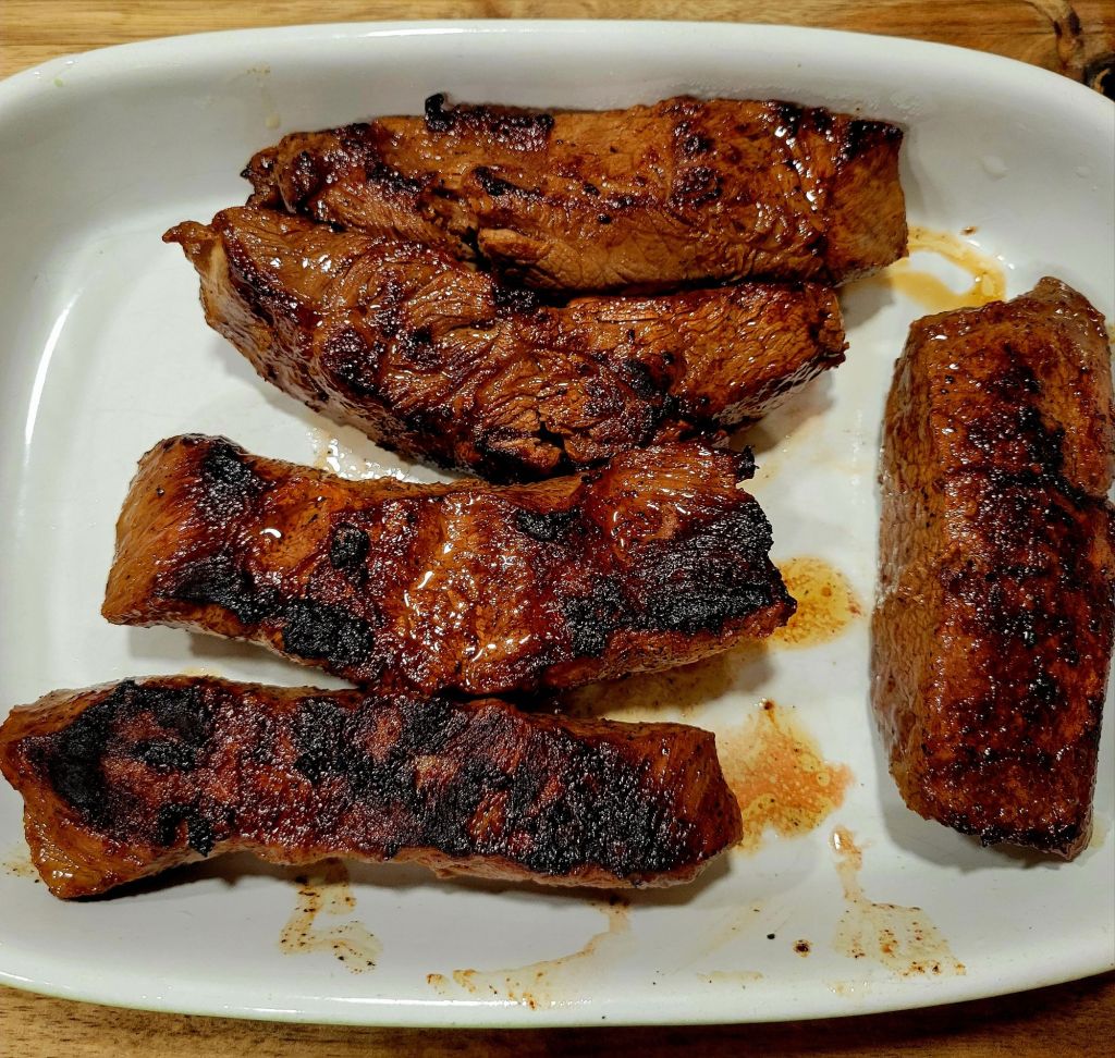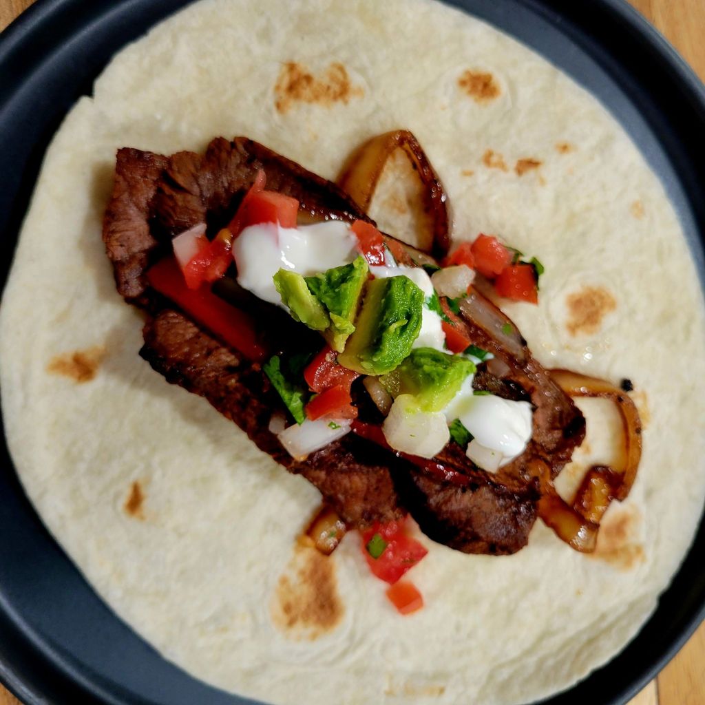 The steaks from Good Ranchers are tender. You really don’t need a recipe, just good seasoning and a hot skillet or grill. Musts are S&P, garlic powder, chili powder, and cumin. I started by marinating steaks first, in 1 cup soy sauce, 1 & 1/2 cups pineapple juice, juice from lemon, chipotle powder, cumin, fresh cracked black pepper and 3-4 cloves minced garlic, for a couple hours. Then, take the steak out of the refrigerator, remove from marinade, set aside, and allow them to come to room temperature. Meanwhile, slice medium onion (we prefer yellow, but any will work) in strips lengthwise. Slice bell peppers the same. Set aside. When ready to cook, put a tbs of good oil in a hot cast iron skillet. Season and sear steaks on each side, turn heat down to medium high, add butter, continue cooking, flipping again. Steaks are done when the thermometer reads 120°. Timing depends on thickness. That’s why I rely on a thermometer. Let steaks rest. Add vegetables to same skillet, on medium, season with Salt, pepper, garlic powder, chili powder and cumin, stir and cook to desired doneness, some like the veggies to still have some bite/crunch to them. Slice steak thinly against the grain, add back to pan with veggies. Toss together to mix and heat all together. Serve on flour tortillas, as is, or with favorite toppings. We’re all different in my house 🙃 I put Pico de Gallo, avocado, and crema on mine. My kids like spicy salsa, extra jalapeño, and sour cream.