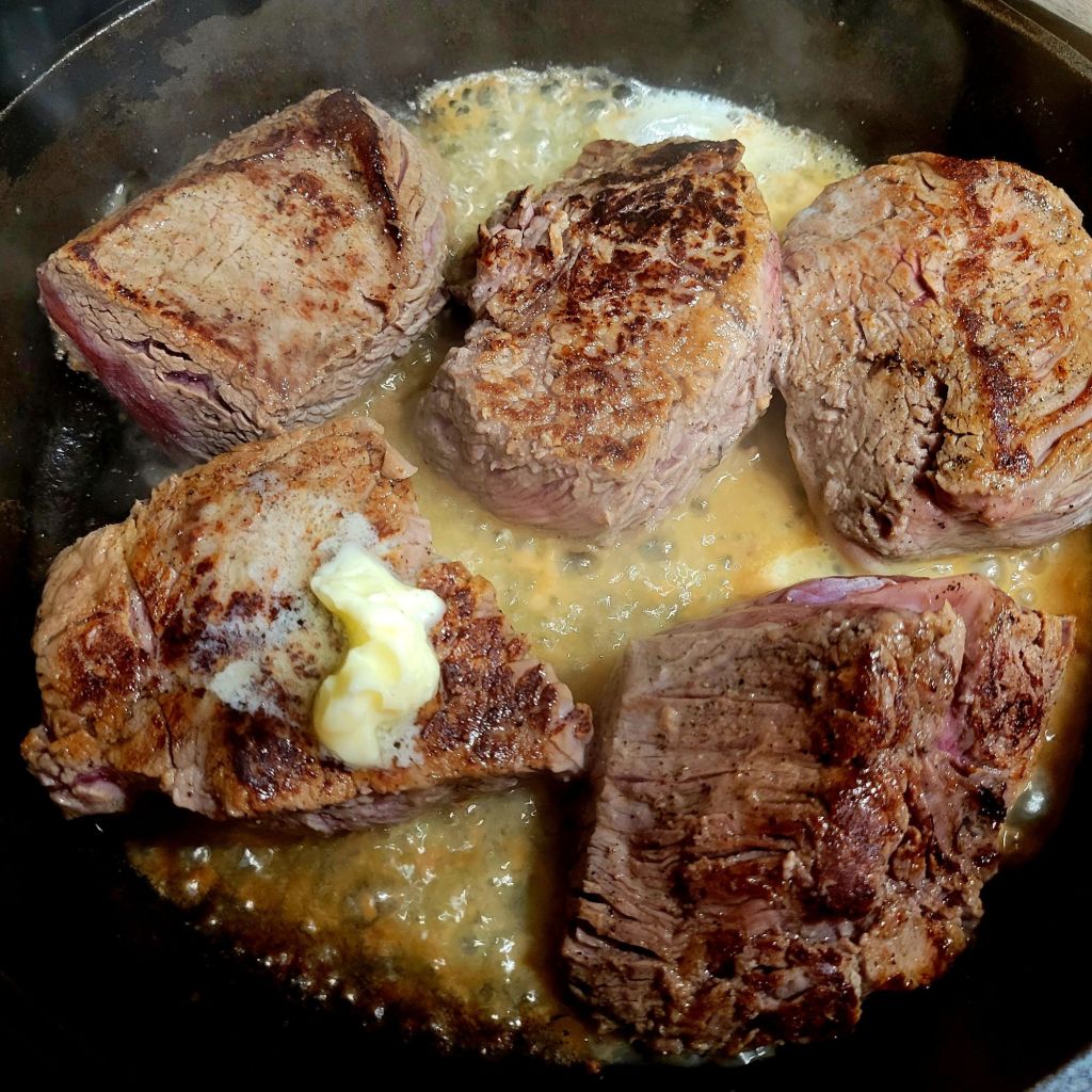 I did marinate my steaks for a couple of hours first.Β Minus the cumin and chili powder; I wasn’t going southwestern with this π Otherwise, I used the same marinade as I did with Flat Iron Steak in the previous post because we really enjoyed that. Remove steaks from marinade, rinse off, and pat dry with paper towel. Let steaks come to room temperature. Season with plenty of salt and a little fresh cracked black pepper. I like celtic sea salt π§ π π Get cast iron skillet very HOT. I did wipe the bottom of the skillet with a touch of bacon fat π₯ because, imho, nothing wrong with THAT FLAVER π Sear each side of the steak. After flipping steak over, add lobs of butter, and if you have it… some herb πΏ like rosemary or thyme. When seared well, baste/spoon some of butter on top of steaks and place hot skillet in 450Β° oven for 8 minutes or when an instant read thermometer reads your desired doneness. Remove steaks from skillet to a platter or it will continue cooking. Allow steaks to rest 5-10 minutes. Perfect π. You can find more information/details about steak doneness and temperatures π‘ at Ruth’s Chris Steak House. ‡οΈ