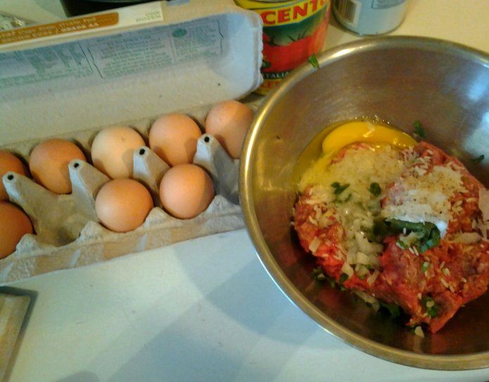 Mix rice into meat, adding mint leaves and parsley, salt, and pepper. Mix in raw egg. Form mixture into 1 ½” meatballs. Meatballs can be made bigger, but they cook faster when small.