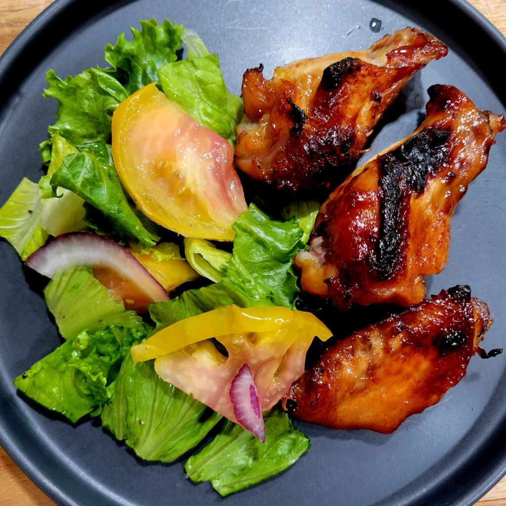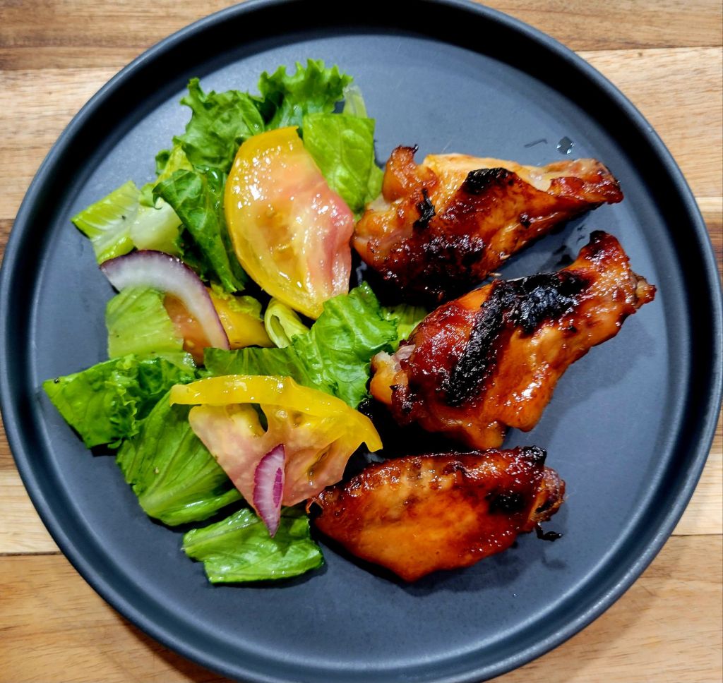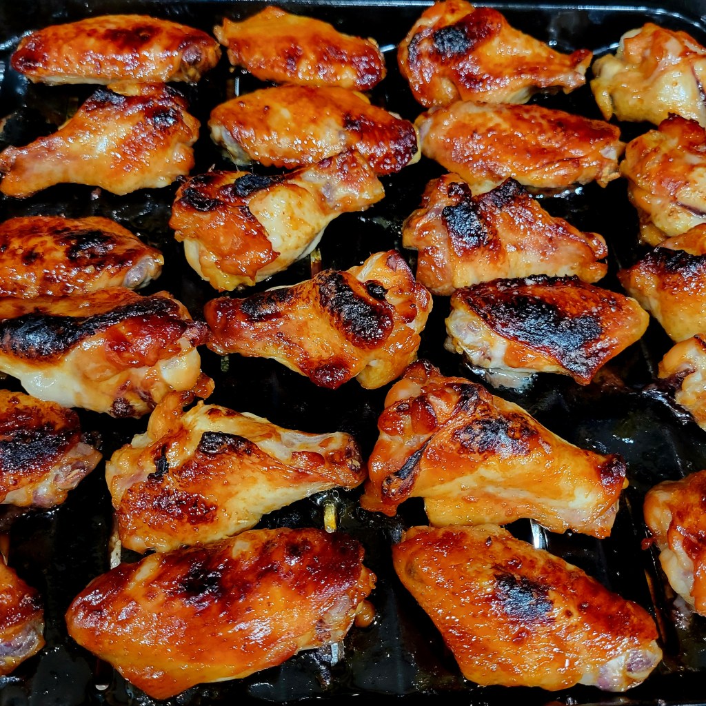 Broiler – arrange marinated wings on baking sheet with a rack, broil for about 12 minutes, browning to desired doneness, flip & do same on other side. Ovens may vary. I used a convection oven. I don’t bother taking temperature with these because wings are so small. They’re done by the time both sides are browned good. In my case, you might use the word “charred” 🤭