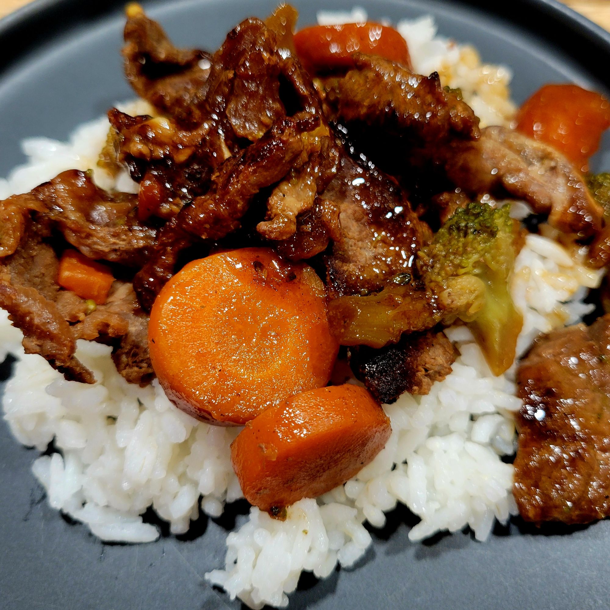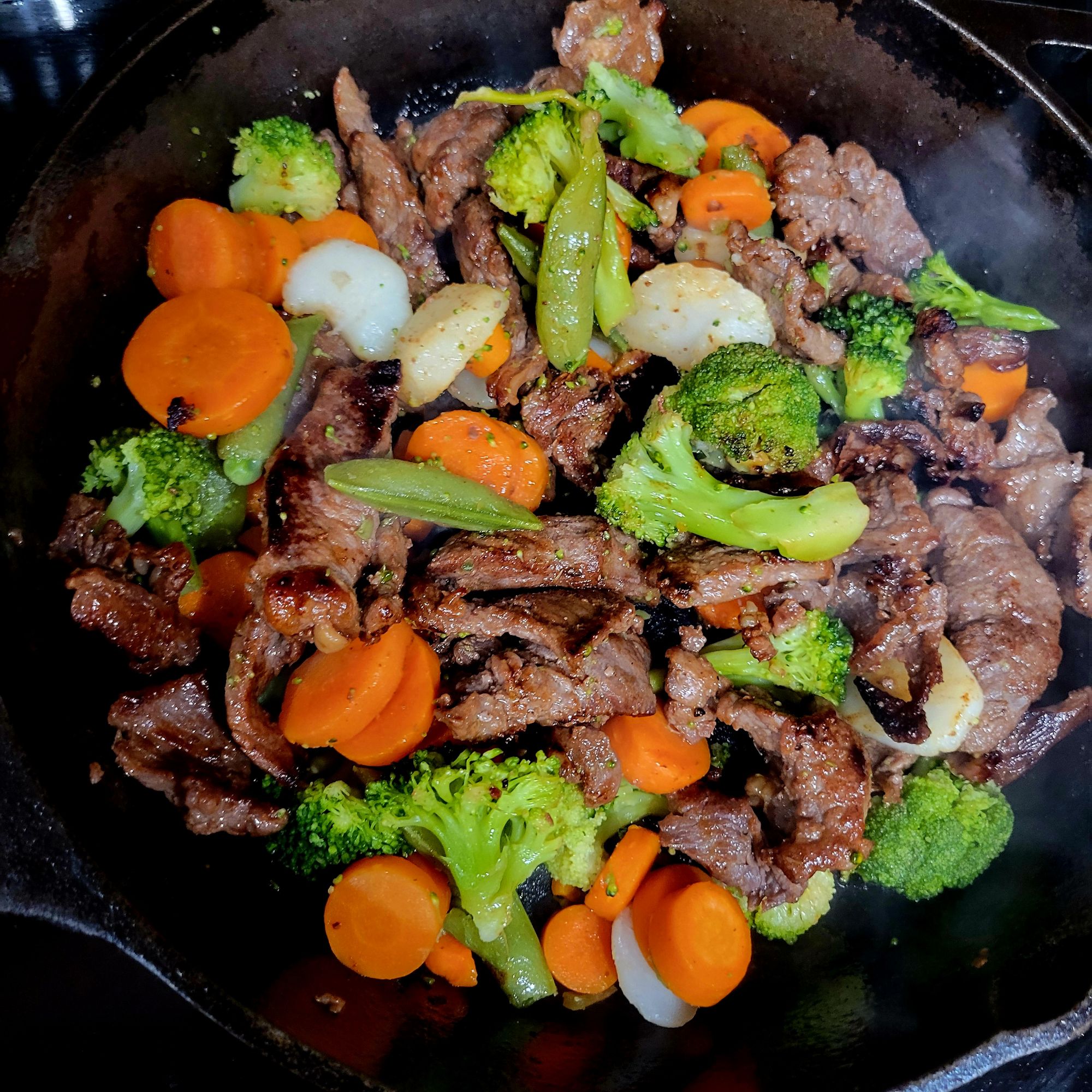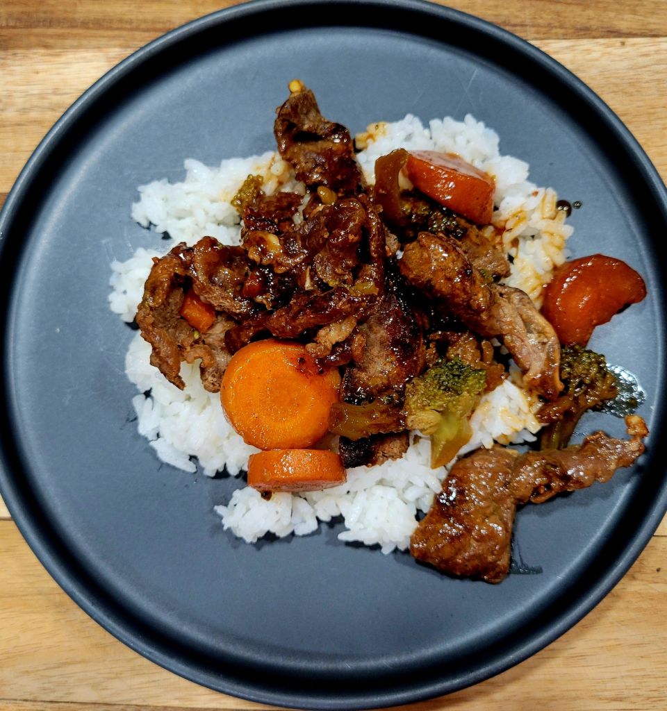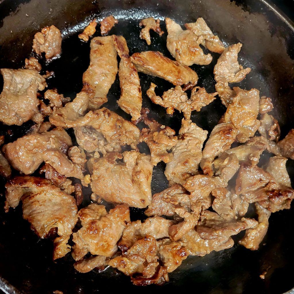 I used the same sauce as in my gyudon post. This time, using vegetables to make shaved steak stir fry or rice bowl. Like in a previous steak stir fry, but stuck with simple Japanese sauce, with sake, mirin, soy sauce, and little sugar.