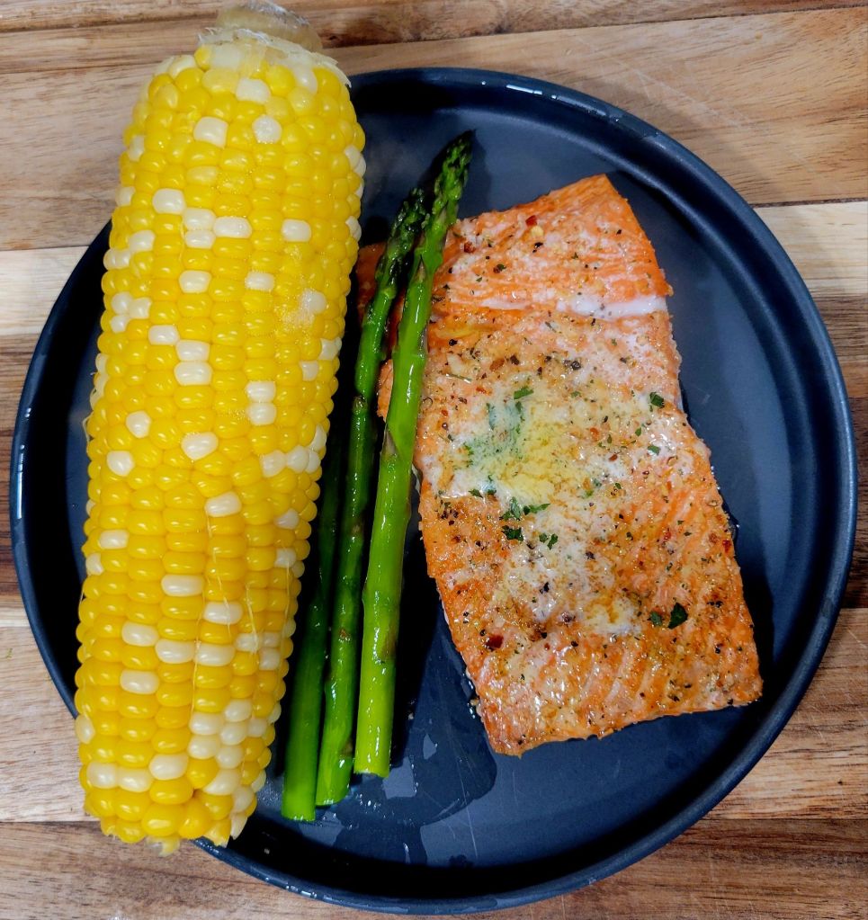 Veggies ๐ corn with store bought Vital Farms Butter, asparagus with avocado oil & seasoning pictured above, salad with above seasoning and Garlic Expressions dressing ๐