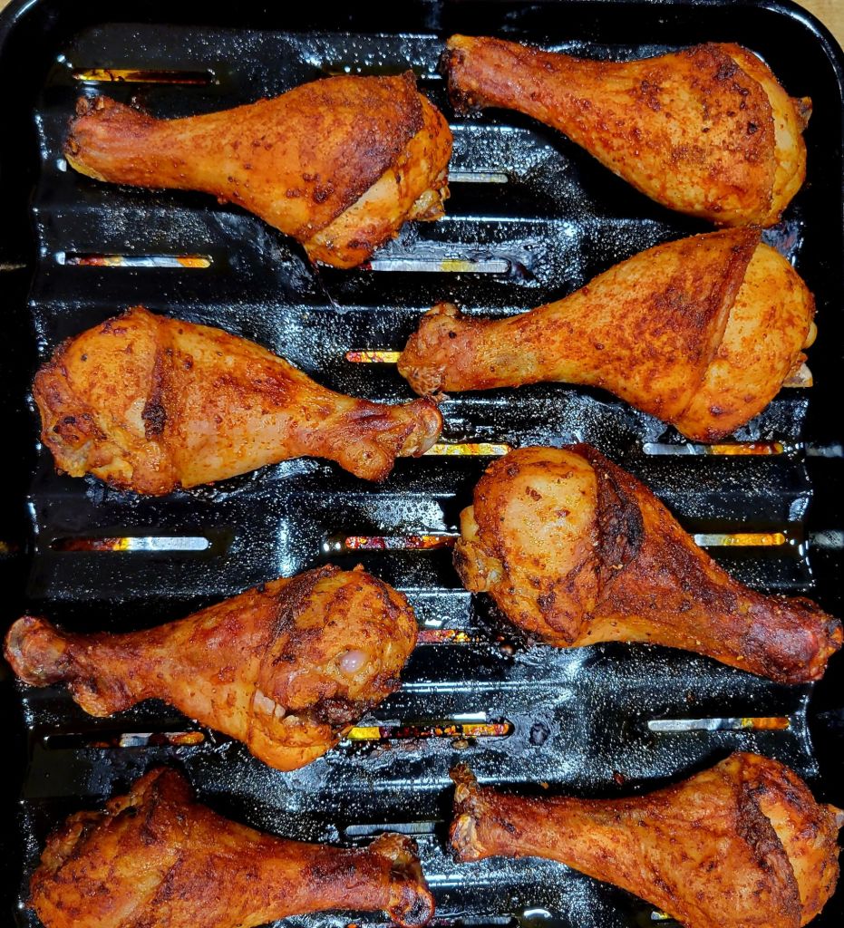 Mojo marinade is good with EVERYTHING π πππ§πΆ So I marinated drumsticks all day in mojo marinade, 30 minutes before cooking, removed from marinade, pat dry with paper towel. Coat with avocado oil or evoo, then season well with a good salt (I love celtic sea salt, but I’ve been using Redmond Real Salt), fresh cracked black pepper, garlic powder, chili powder, chipotle powder, and paprika; about a teaspoon of each seasoning. Then, place on baking sheet with rack and roasted at 425Β° for approx 55 minutes, when internal temperature is 165Β° and desired crispness. Delicious, crispy on the outside, juicy on the inside. π