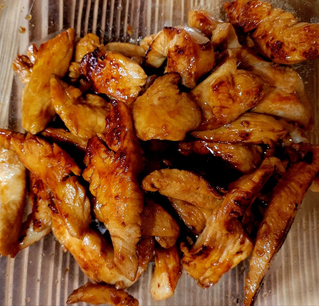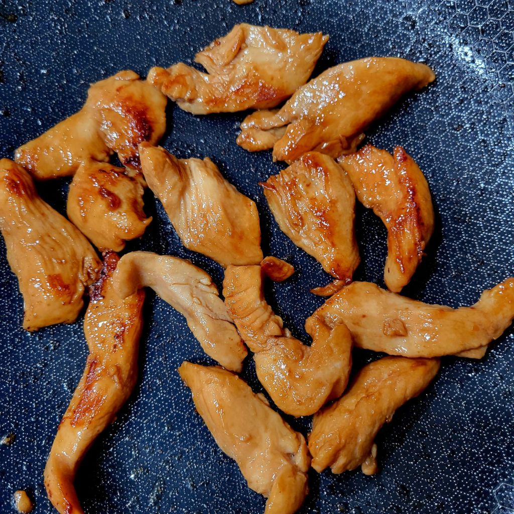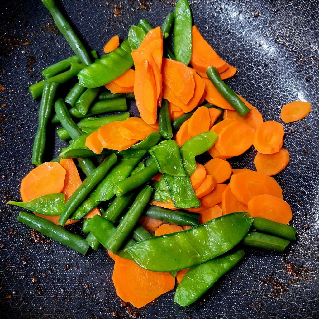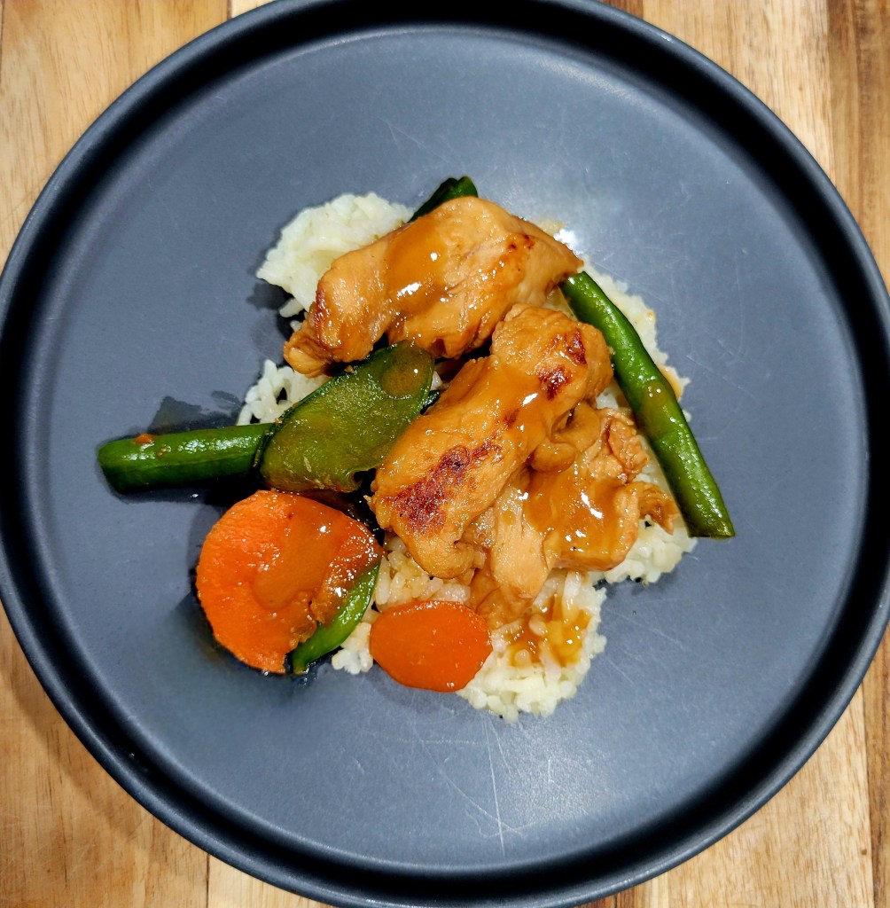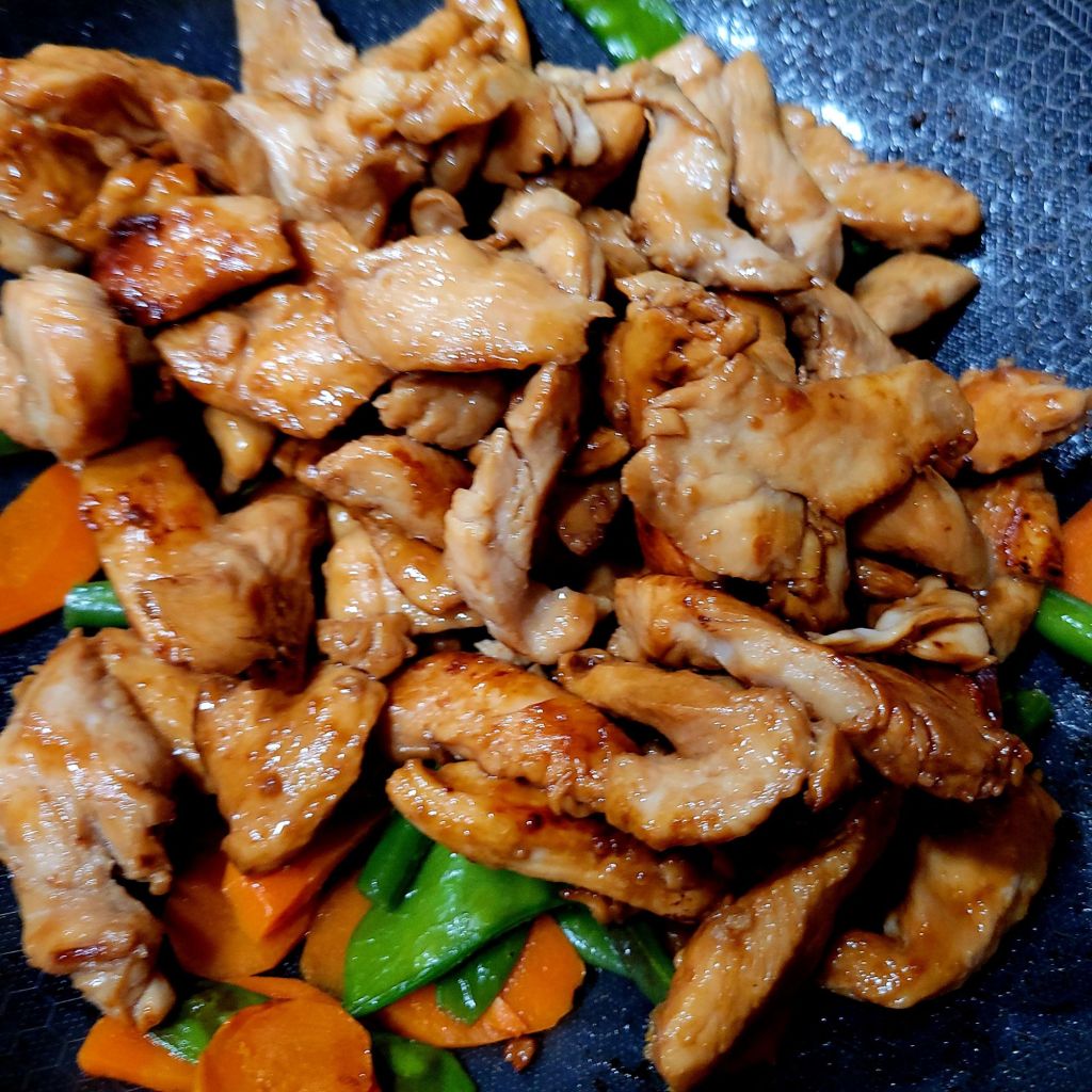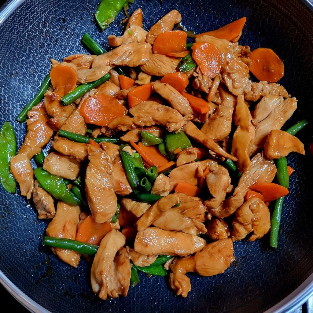 In hot wok, add tbsp or so of healthy oil. Add chicken strips in small batches. I had a bowl to transfer seared chicken to. The chicken gets better color if allowed to cook undisturbed for a minute. After chicken is done and set aside, I added a dash of oil to wok and added vegetables (your choice; I had blanched and frozen snap peas, green beans, and carrots). Tossed, then added a couple tablespoons of water and put lid on for a minute to allow veggies to steam a little. Tossed again, when water cooked out, I added chicken to wok with veggies, tossed, then added a couple spoons (about a 1/4 cup) of the teriyaki sauce from small saucepan, stirred and it’s done.