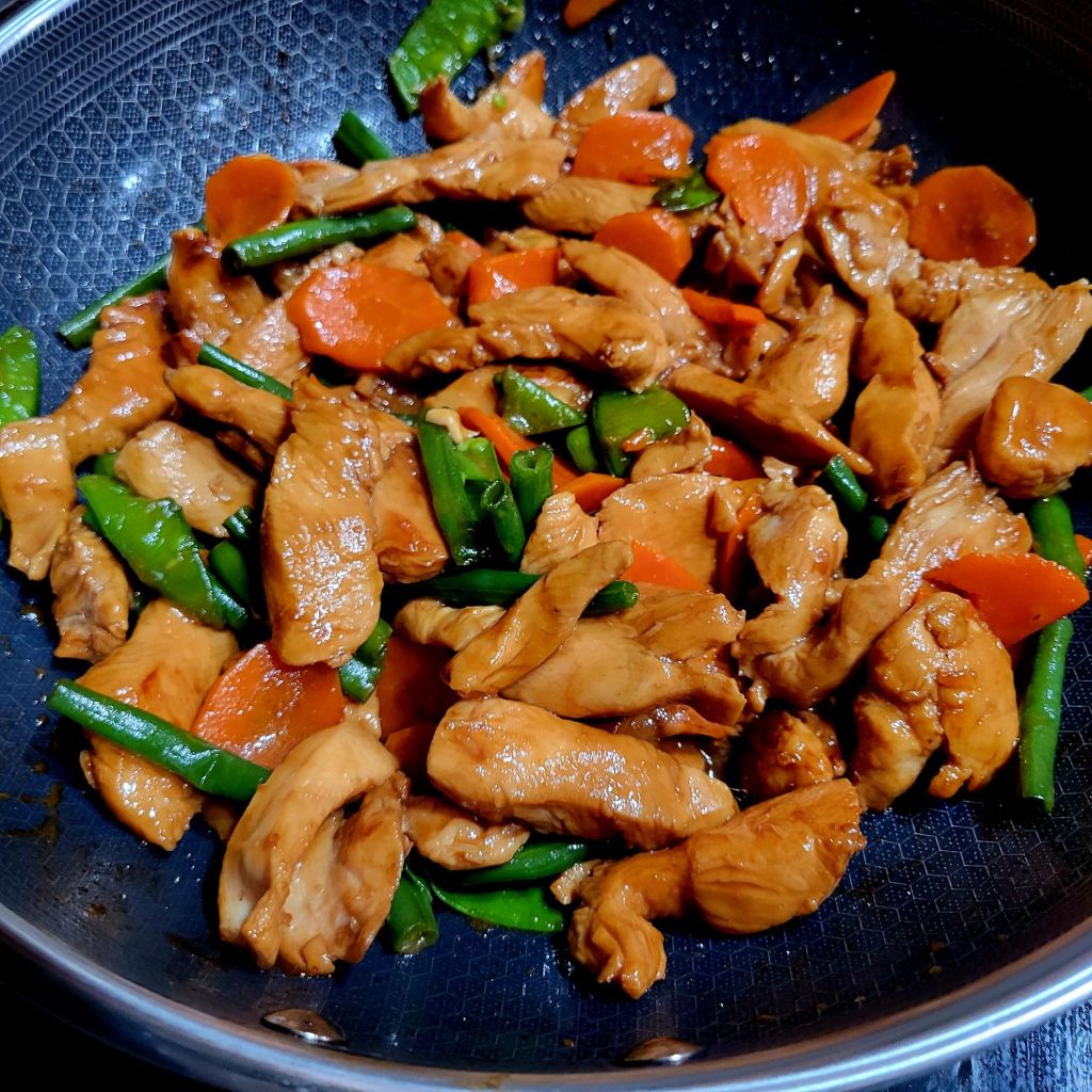 This Teriyaki Chicken Stir Fry is delicious‼️😋 I couldn’t wait to try out the new hexclad wok my daughter got me for my birthday 🥰 I marinated chicken strips (cut from 3 chicken breasts that were split first, to make them thinner; then cut in small strips). Marinated in teriyaki sauce a few hours. Recipe ⤵️ although (yeah, here I go again, not following recipe 🙄) I used brown sugar instead of white. I also used fresh minced garlic in place of powder. Avocado oil instead of vegetable oil. Lastly, I reserved half of marinade to make a teriyaki sauce by putting in a little saucepan and adding a slurry (2 tbsp cornstarch mixed with 2 tbsp cold water, stir) to thicken a little. Left sauce on low on back burner.