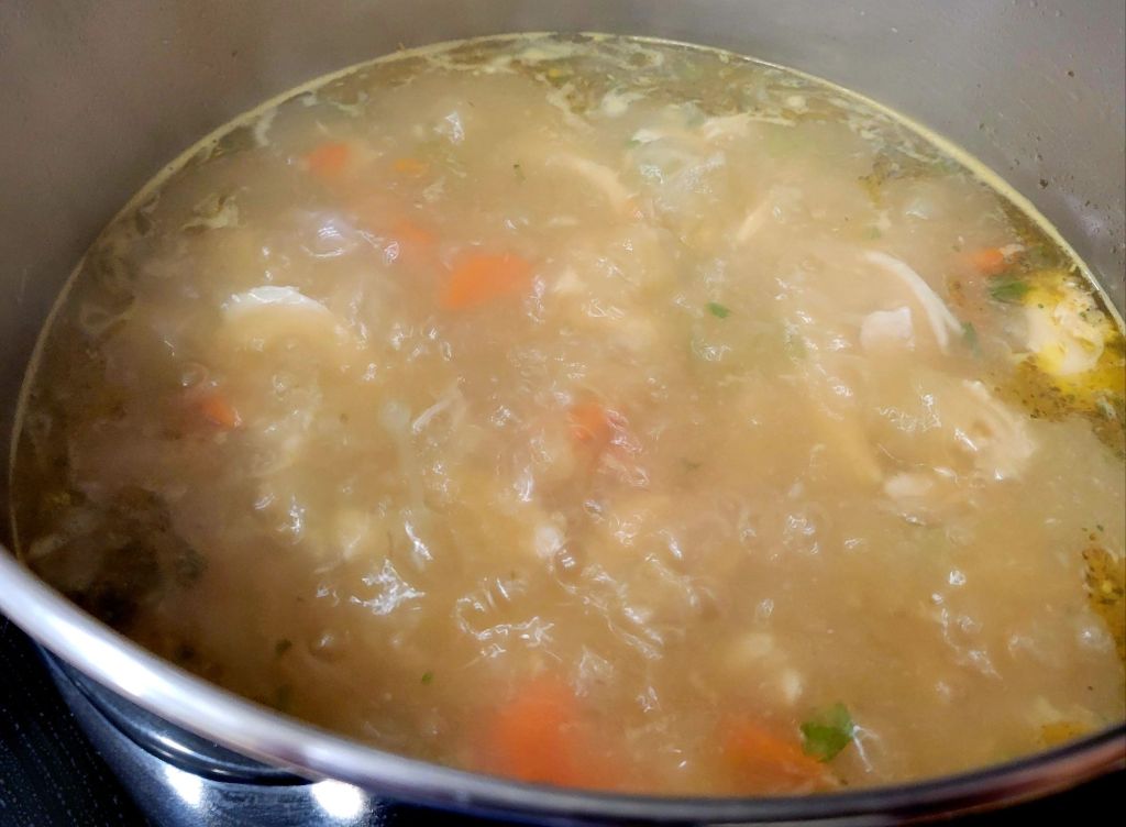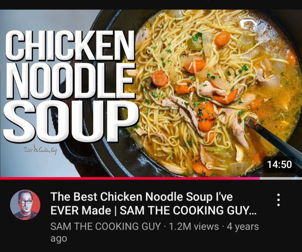 I’ve been making this for over 50 years, so I don’t need a recipe, but… I thought I’d share this one. I like Sam the Cooking Guy that being said, I did a couple of things differently. I did not use soy sauce, nor Asian noodles*, and I cooked my chicken in broth, then took it out, let the dark meat cool a little bit, enough to handle (although, just like his style, I couldn’t wait so it was HOT! 🤭), tore it up and added it back into broth.