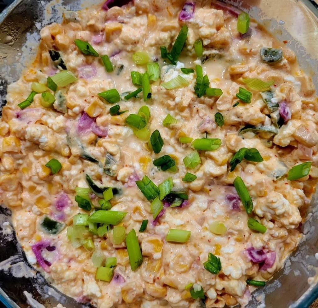 Crab stuffed salmon, with a side of a creamy Mexican elote