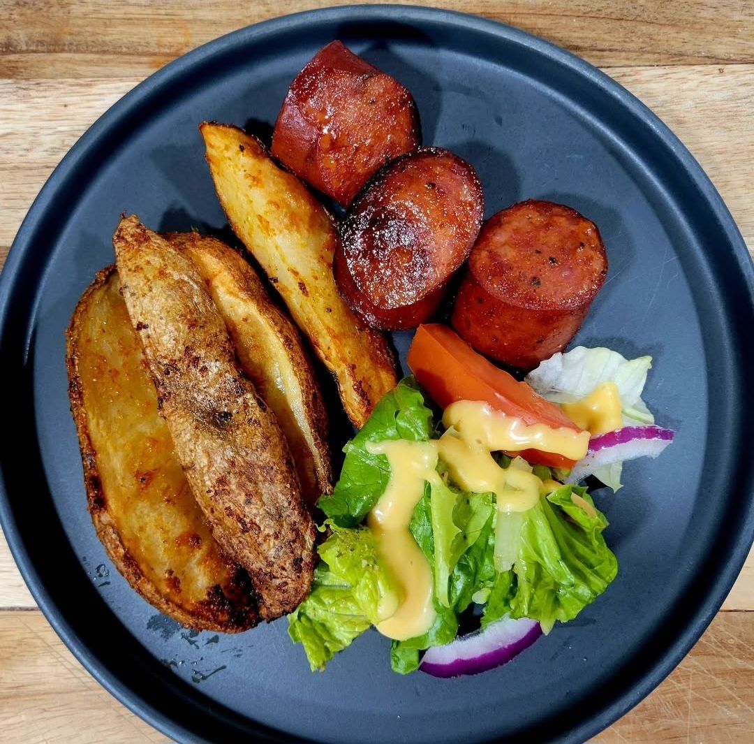 Usually, kielbasa, but last time was andouille sausage, with seasoned potato wedges 😋