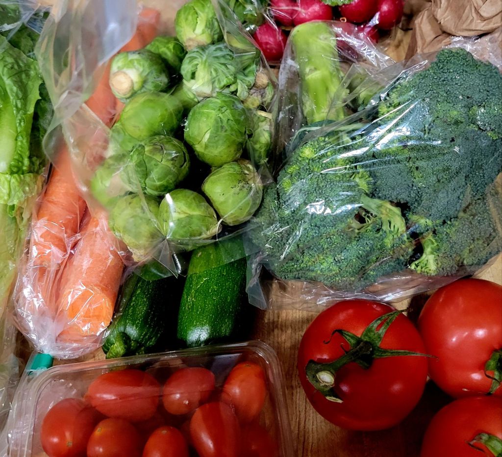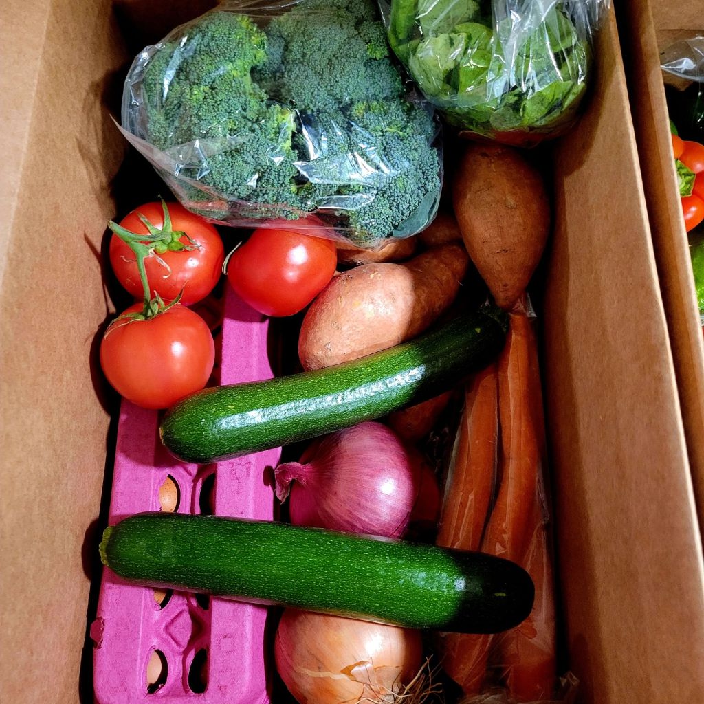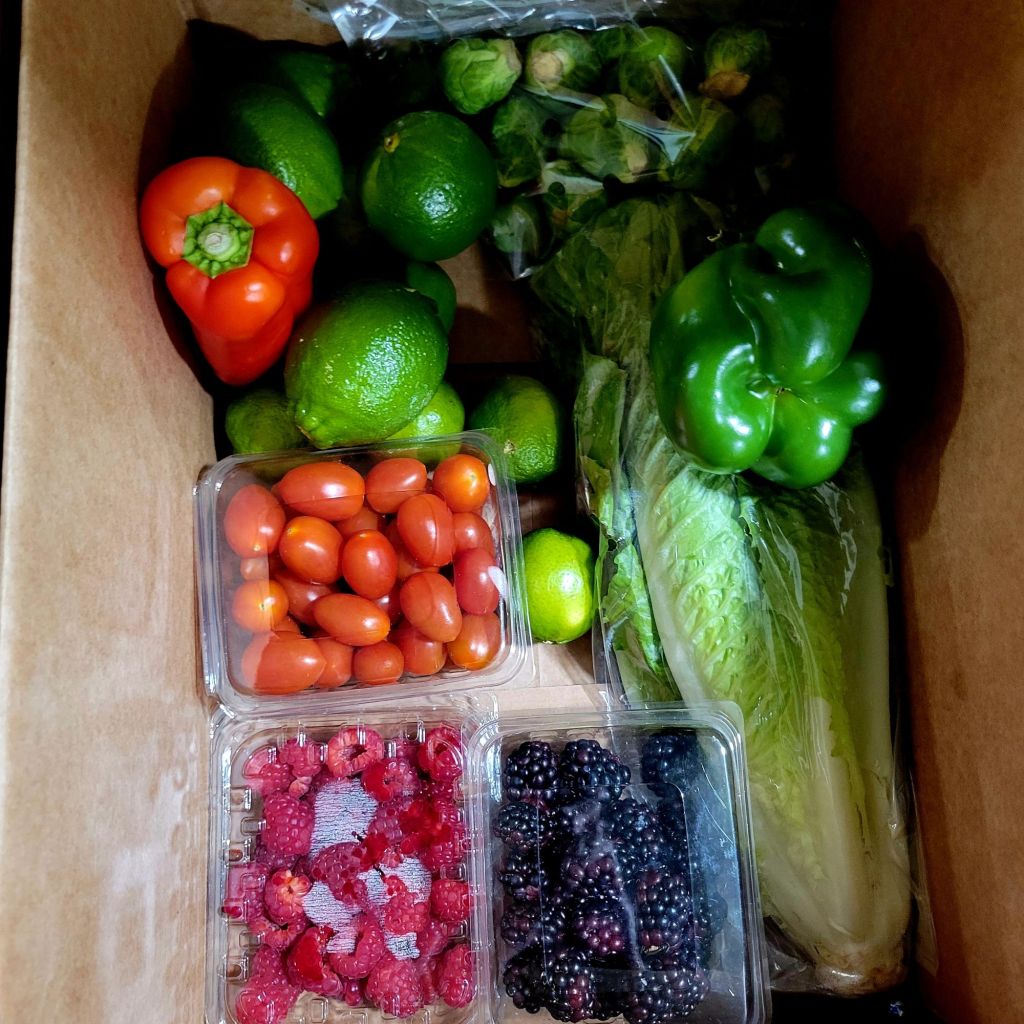 Romaine lettuce, tomatoes, peppers, carrots, zucchini, eggs, limes, avocado, raspberries, blackberries, Brussel sprouts, broccoli, red onion, yellow onion, sweet potatoes, acorn squash…. š¤