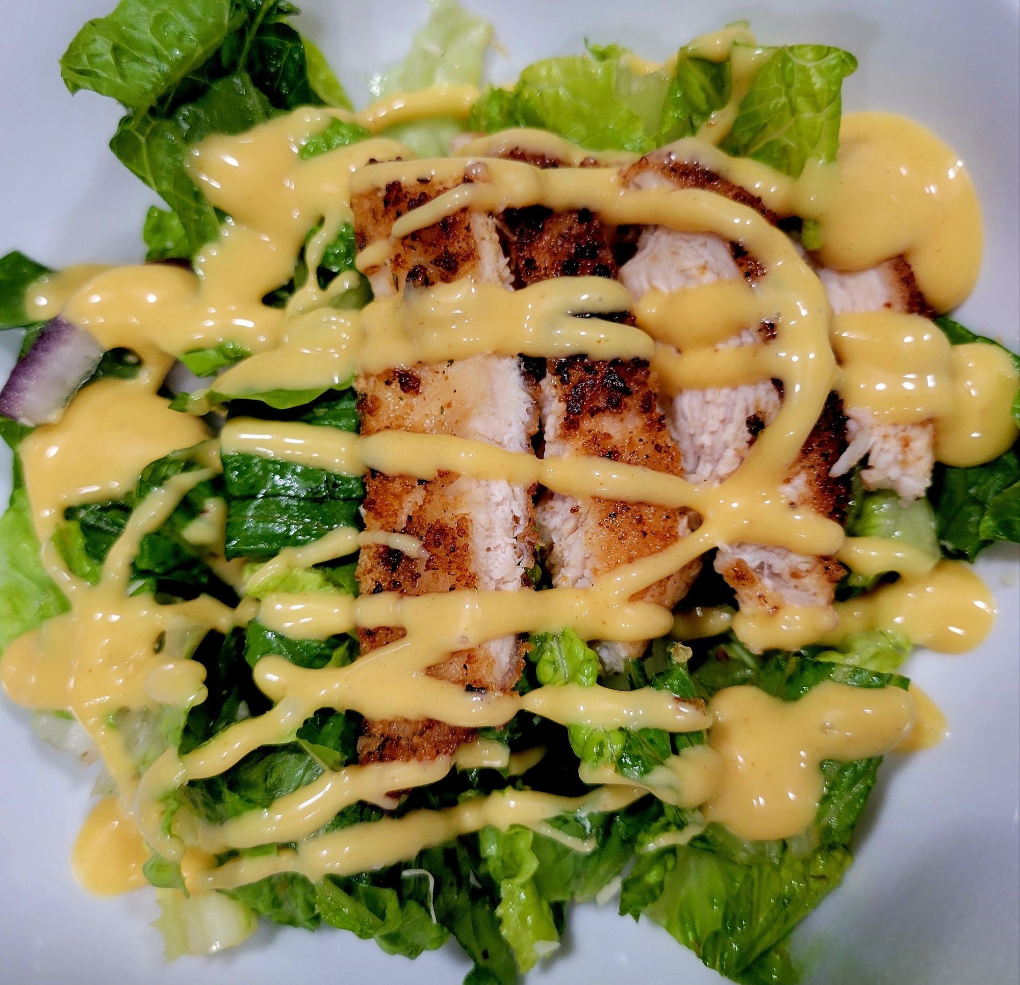 My daughter’s dish above. She doesn’t use Caesar dressing like me and my son. She likes honey mustard. It’s all good.š