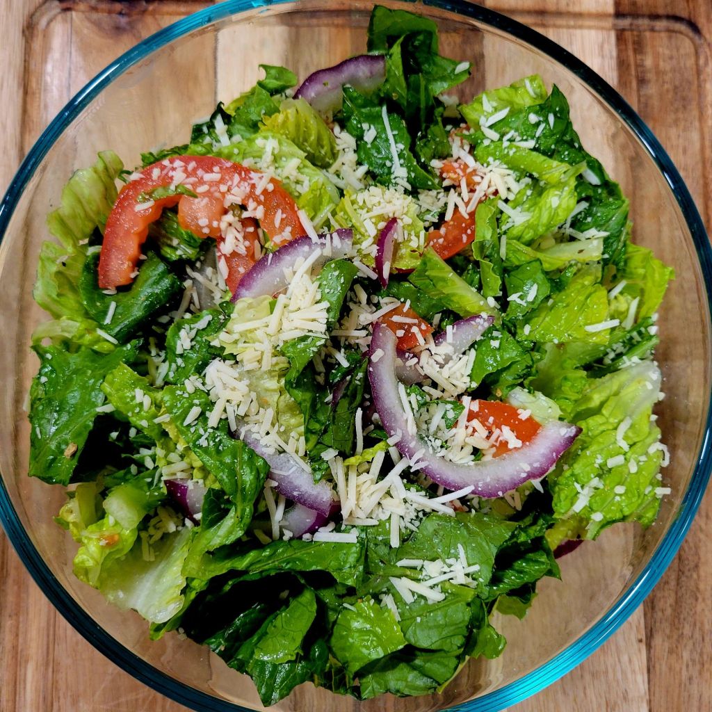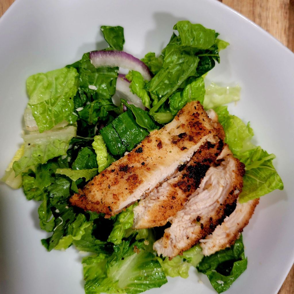 Easy. You don’t really need a recipe. First, I made a nice fresh salad with romaine lettuce, 1 tomato (only because I had to use up the tomato; I got a new farm box delivery today with fresh new produce). Thinly sliced red onion. We never have croutons, so the tomato and lack of croutons made it not exactly a Caesar salad…Ā I suppose. š I sprinkled salad with our favorite seasoning. McCormick Herb, Garlic, Salt and pepper. Tossed, topped with a little shredded parm and Romano, set aside.