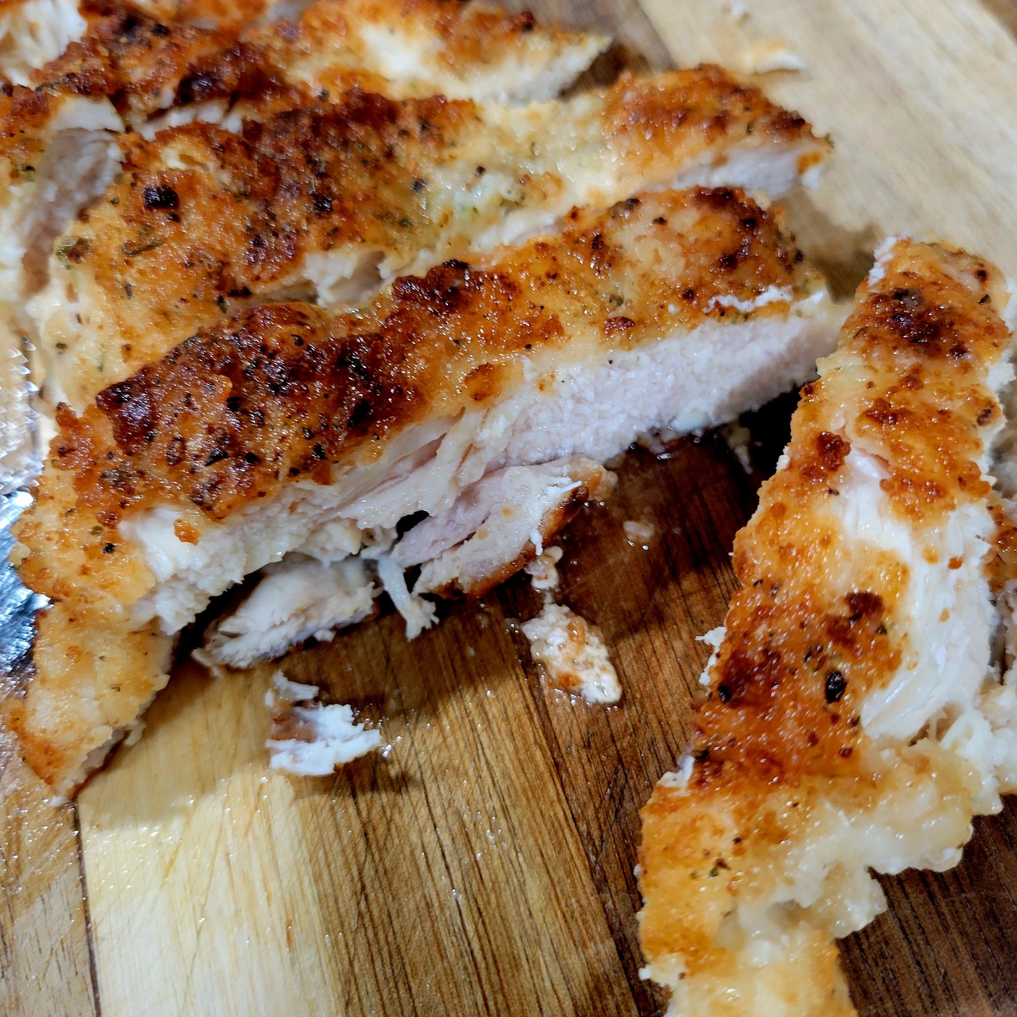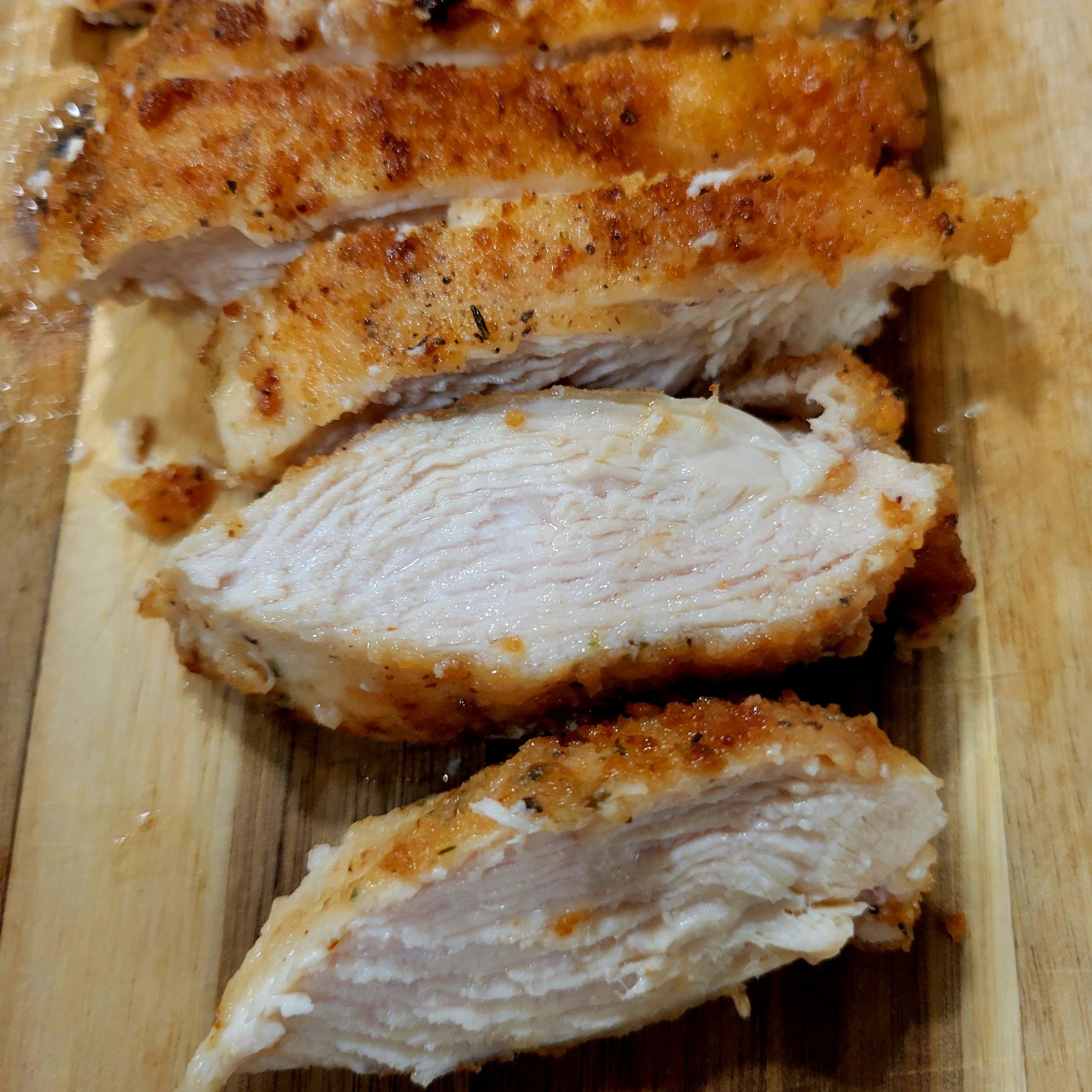I cut chicken breasts in half to make them thinner. I did not pound them. Also, I did not use any kind of steps for dredging them. I simply seasoned (Redmond Real Salt, fresh cracked black pepper, and McCormick Herb Garlic Salt and Pepper seasoning) on both sides of each chicken breast and the same seasoning in a mix of 1/2 cup flour, 1/2 cup panko breadcrumbs in a wide bowl. I simply placed each piece of chicken on flour mix and patted to get it to stick. Repeat on both sides, and transfer to a platter. Heat healthy oil. I used a mix of tallow and avocado oil; actually, I drizzled a little olive oil in too š« š just because they were right there staring at me from oil dispensers š¤ Any will work. Even bacon fat… if that’s all you have. Better than seed oils. Just sayin’. I heated oil on medium high, when HOT, fried chicken until golden crispy on outside, and internal temperature was 165°. I had to do it in 2 batches. I used a smaller skillet. Transfer to paper towel lined platter. I sliced each chicken breast in slices; pictured above and below. A delicious, easy, and healthy meal. Crispy chicken, that’s tender and juicy on the inside.