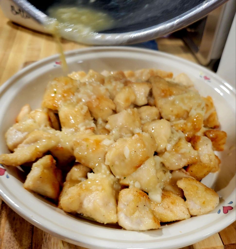 - Add butter, 1 piece at a time, and stir until completely melted before adding next piece. Immediately remove skillet from heat. Pour sauce over chicken in bowl, and toss to coat. Garnish with parsley; serve immediately with lemon wedges.
