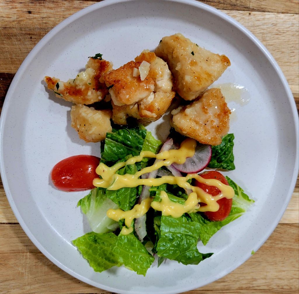 - Whisk together flour, salt, lemon-pepper seasoning, and garlic powder in a large bowl until combined. Add chicken pieces, and gently toss until evenly coated.