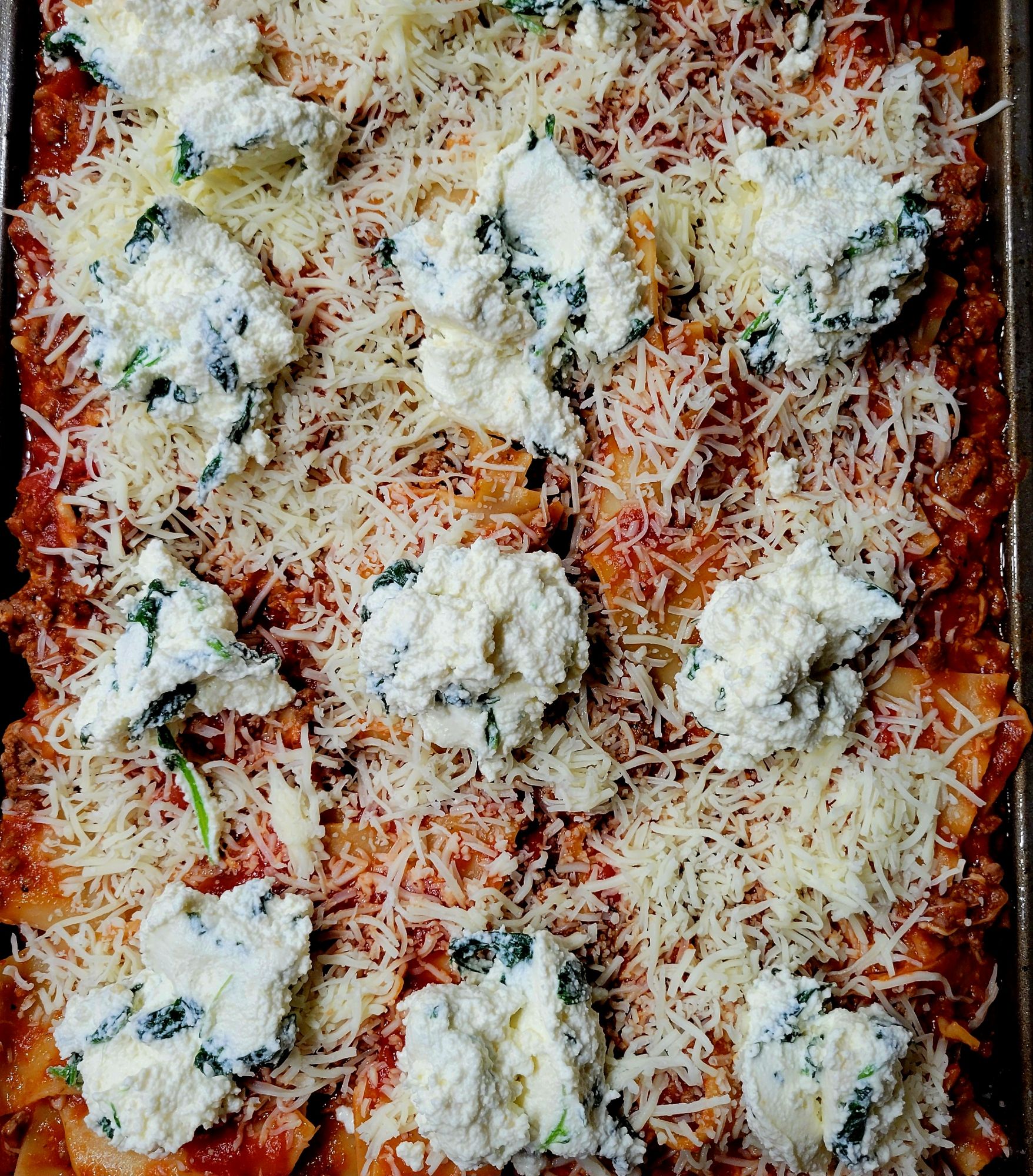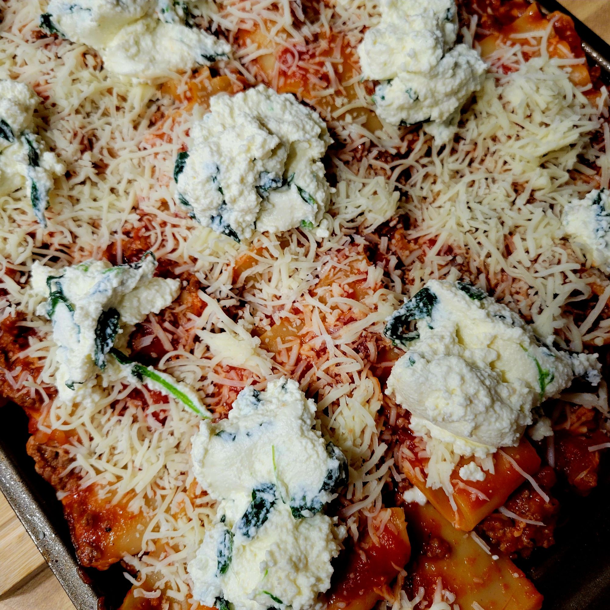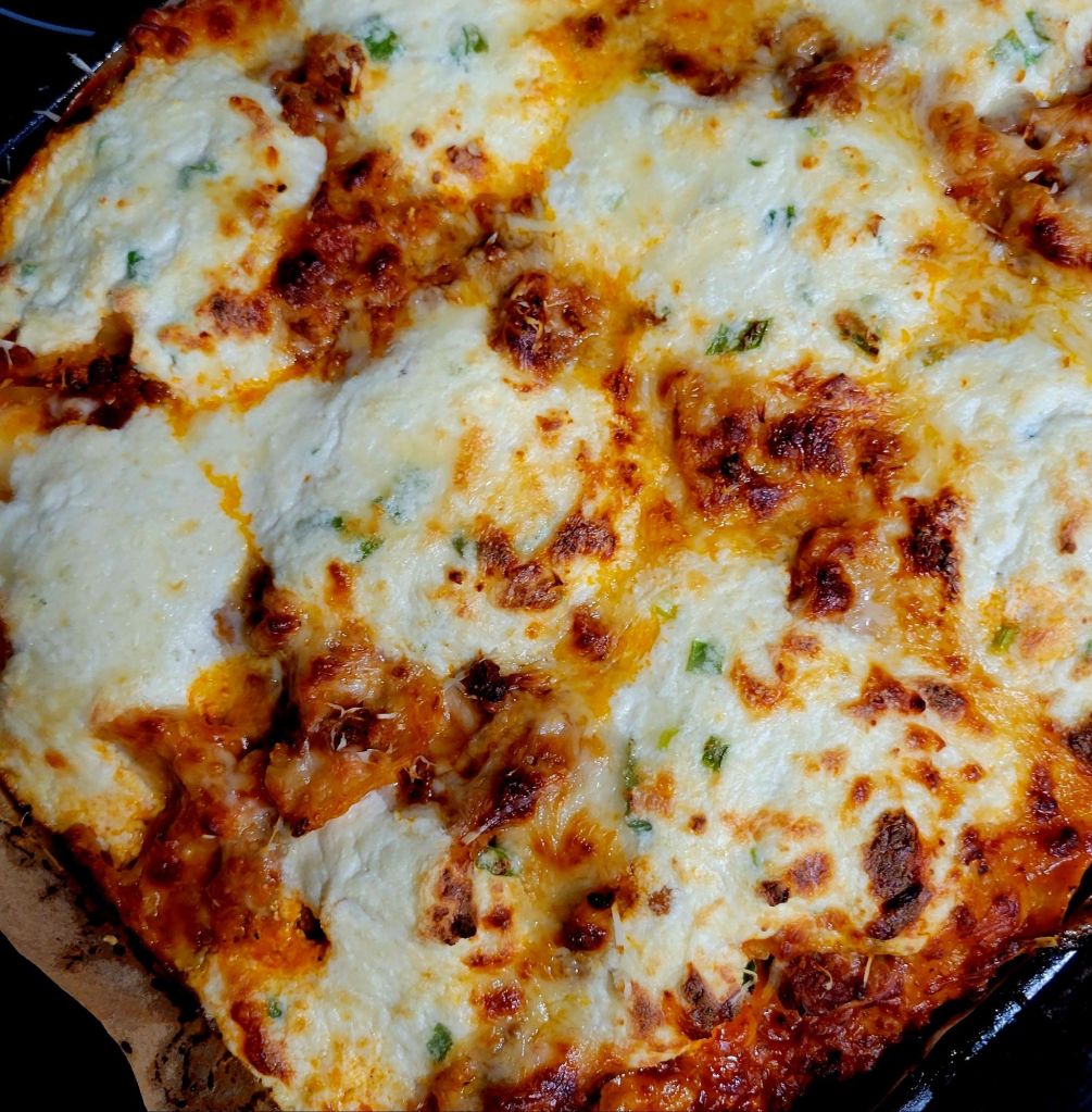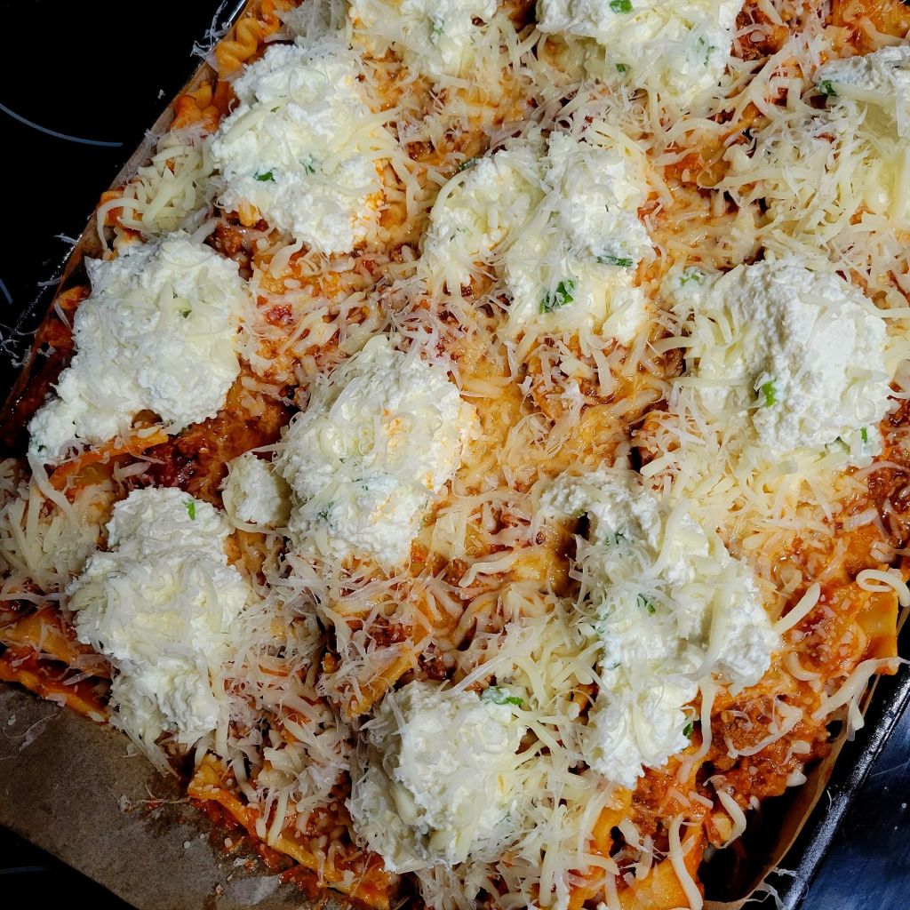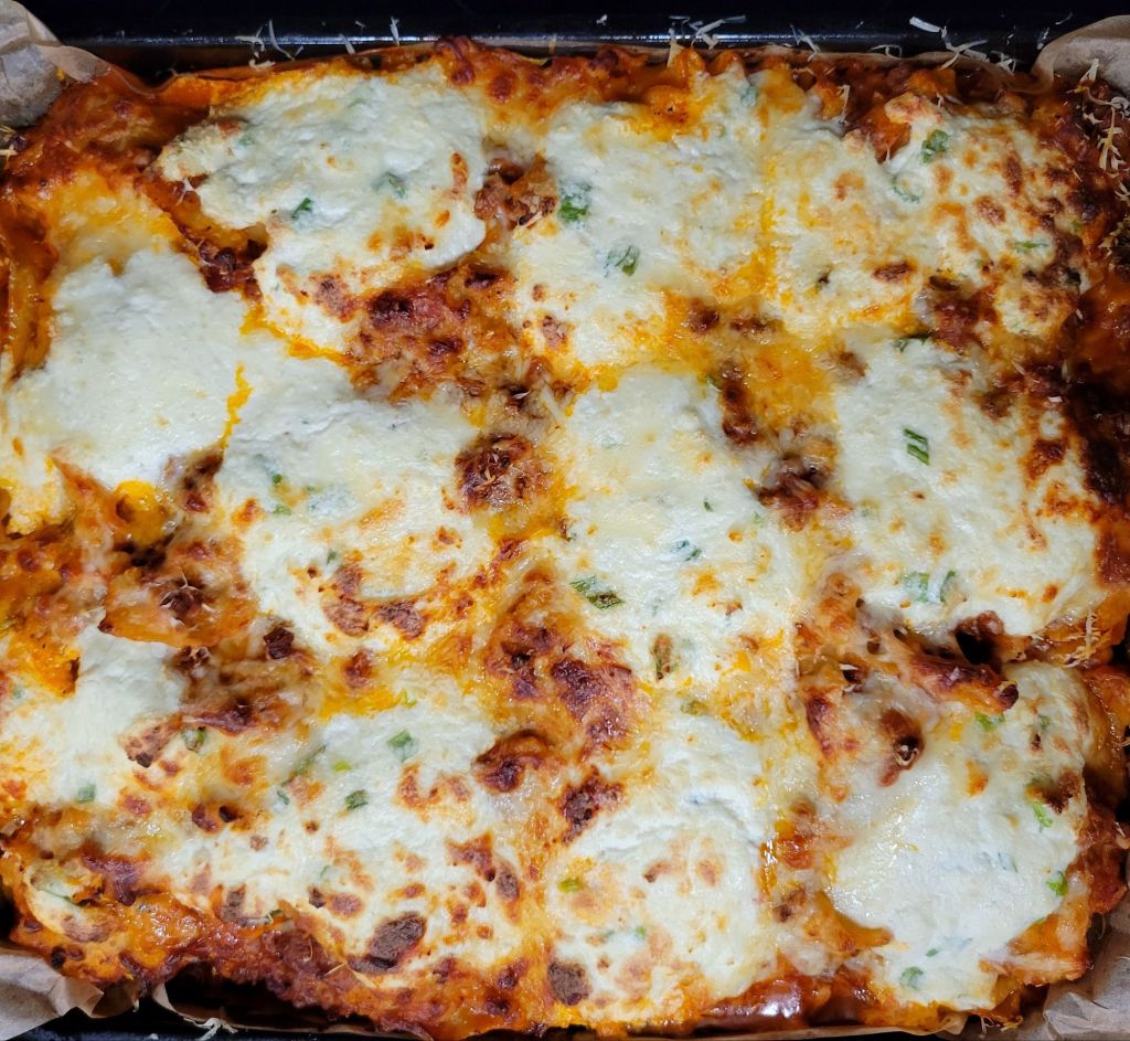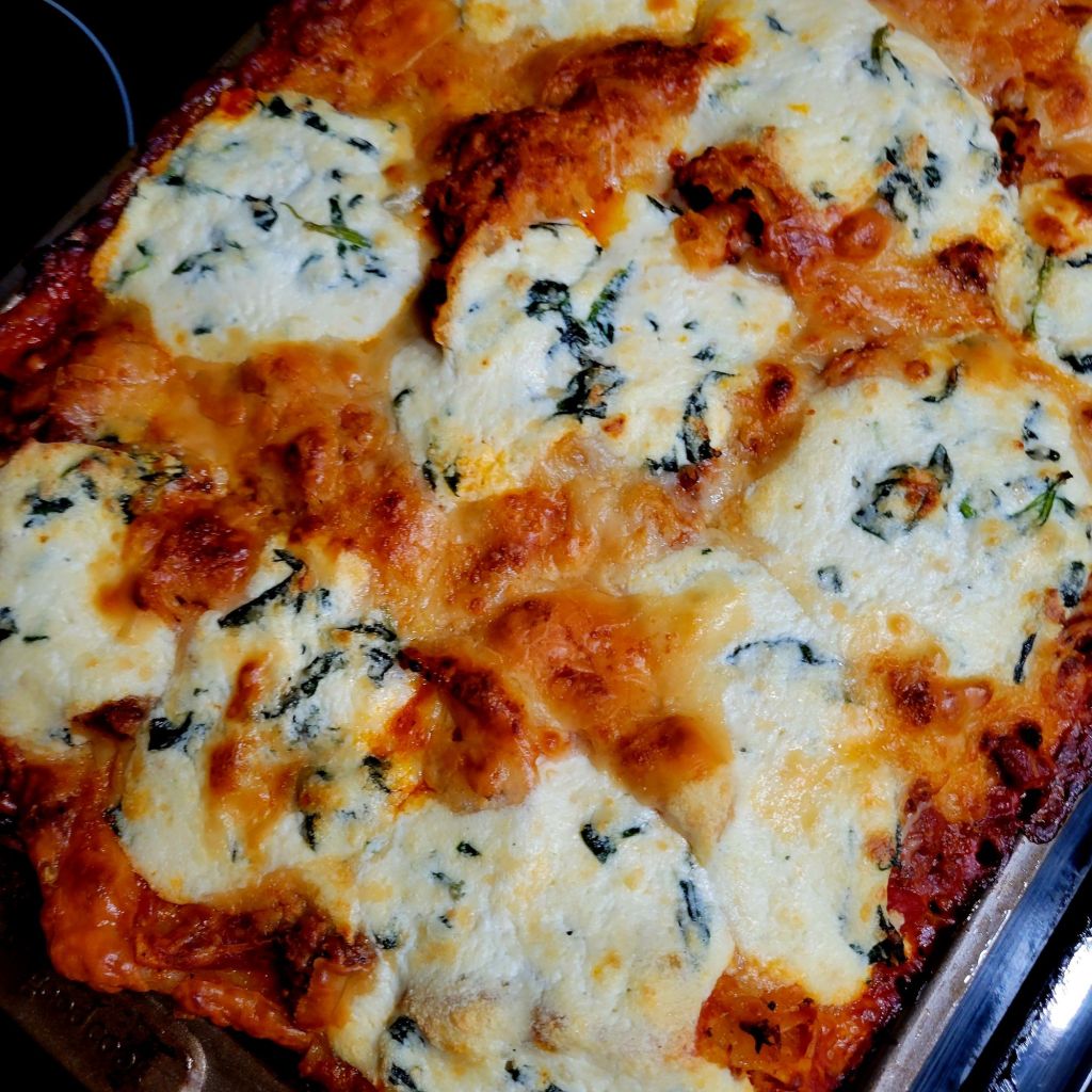 DELISH! My daughter tried this, and I was intrigued. She liked it. It’s an “easier” version, although, for me, that part is the same 😜 However, it is a “different” version of lasagna. I find it lighter, and it gives all of it that crispy corner consistency… that everyone in my family goes for with traditional lasagna. 😍 You can’t go wrong with pasta, marinara sauce, meat, and/or cheese. Speaking of which, I used ground beef… only because some of my family members do not like Italian sausage. It’s all good to me. Also, I added shaved and grated parmesan cheese on top, with mozzarella. We LOVE garlic and cheese, so I put garlic in the ricotta mix, with the sautéed spinach, to the onions and meat, and to sauce. I also added grated parmesan to the ricotta mix. A heads up, I put foil on the bottom of my oven in case it bubbled over. I cut the recipe in half the next time, and it’s still plenty for us. I didn’t cut the cheese in half 🤭 only the amount of pasta and sauce. Pictured below this first round 😉 ⤵️