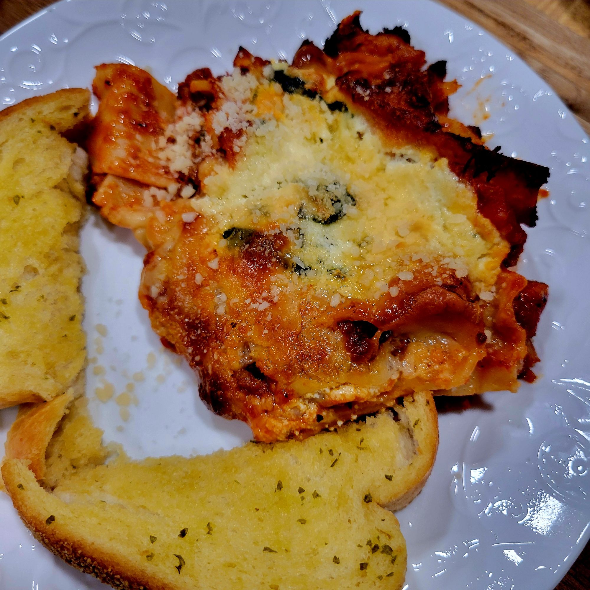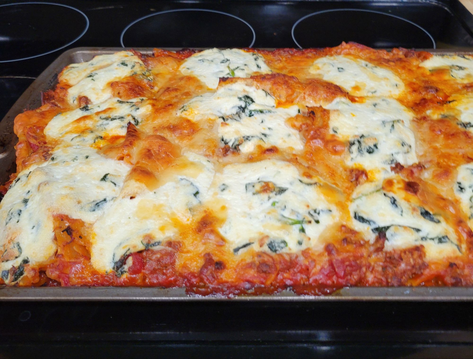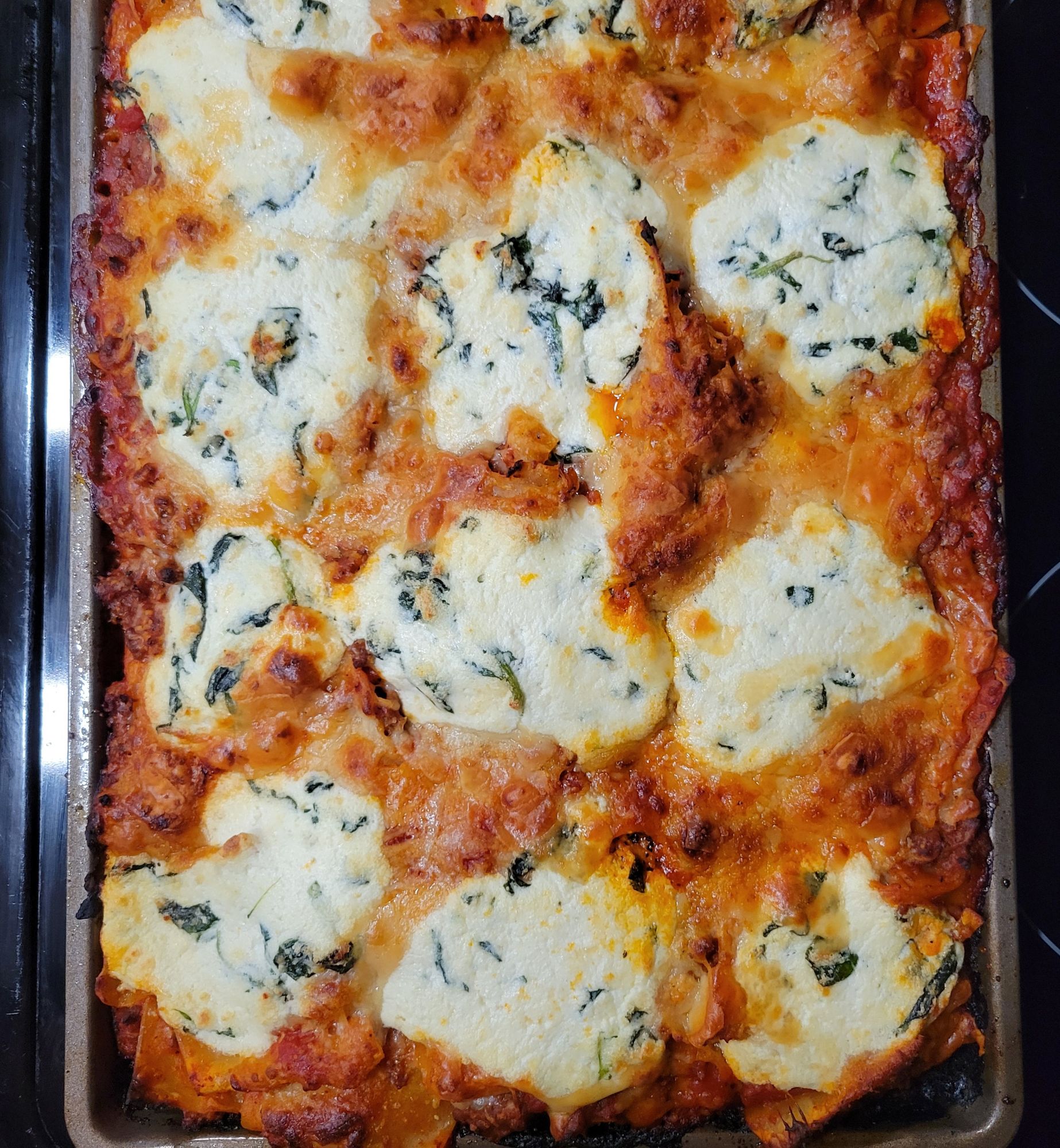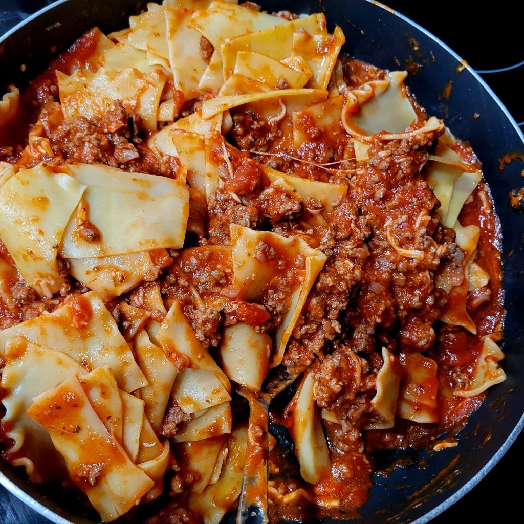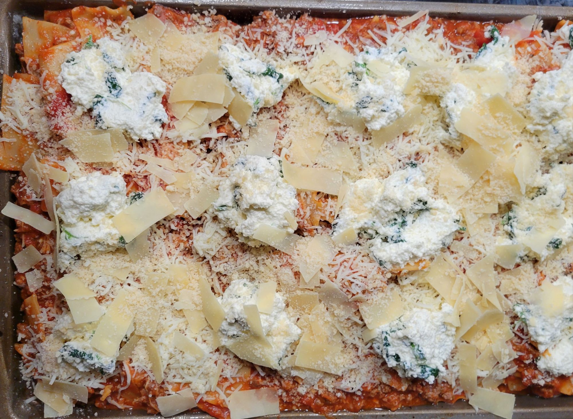 DELISH! My daughter tried this, and I was intrigued. She liked it. It’s an “easier” version, although, for me, that part is the same 😜 However, it is a “different” version of lasagna. I find it lighter, and it gives all of it that crispy corner consistency… that everyone in my family goes for with traditional lasagna. 😍 You can’t go wrong with pasta, marinara sauce, meat, and/or cheese. Speaking of which, I used ground beef… only because some of my family members do not like Italian sausage. It’s all good to me. Also, I added shaved and grated parmesan cheese on top, with mozzarella. We LOVE garlic and cheese, so I put garlic in the ricotta mix, with the sautéed spinach, to the onions and meat, and to sauce. I also added grated parmesan to the ricotta mix. A heads up, I put foil on the bottom of my oven in case it bubbled over. I cut the recipe in half the next time, and it’s still plenty for us. I didn’t cut the cheese in half 🤭 only the amount of pasta and sauce. Pictured below this first round 😉 ⤵️