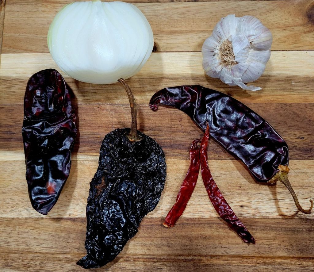 - Toast the guajillo and ancho chiles in a saute pan over medium-high heat, approximately 30 seconds per side.