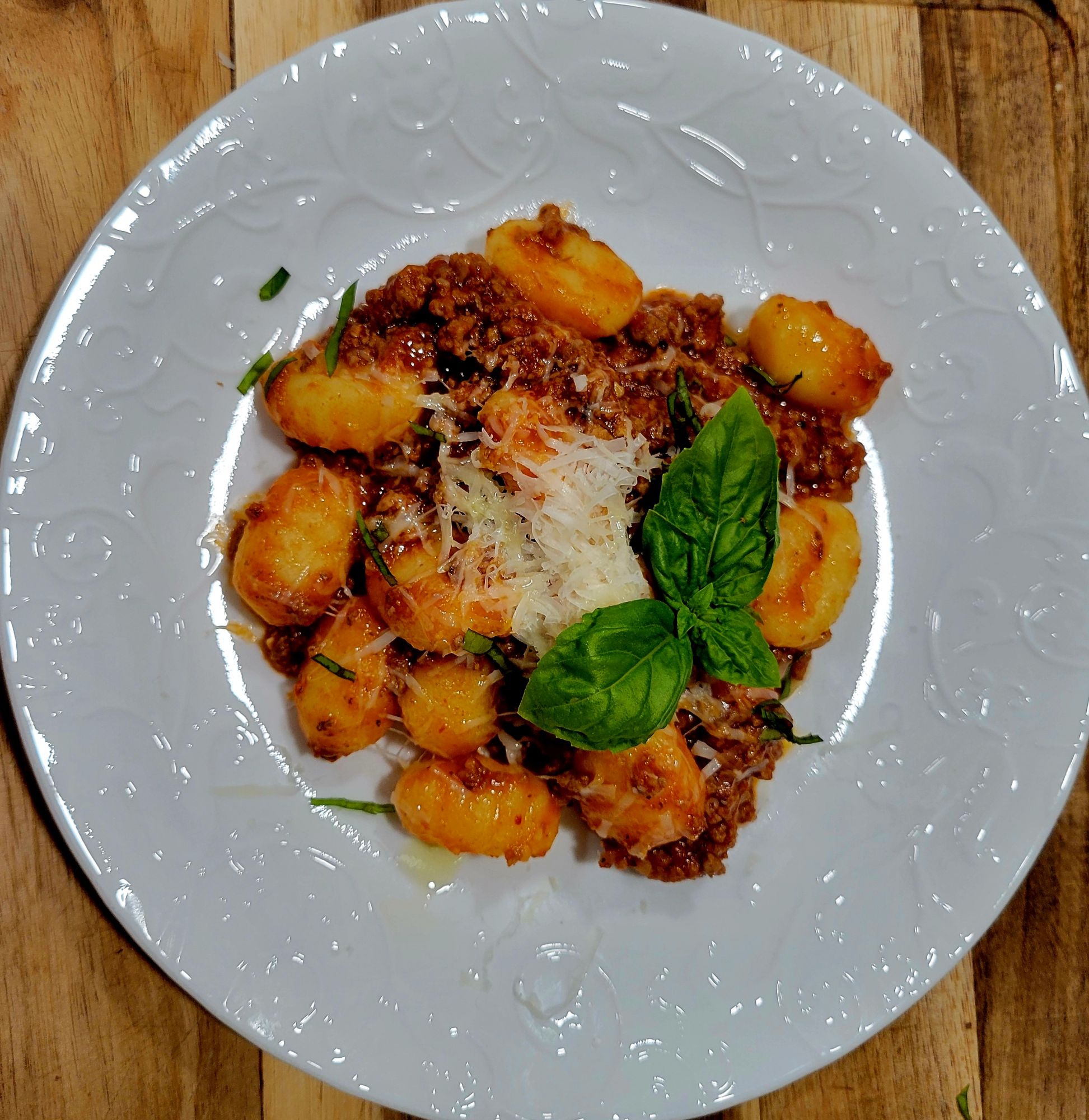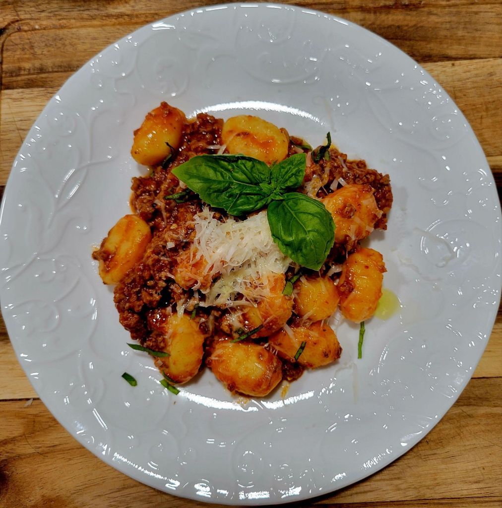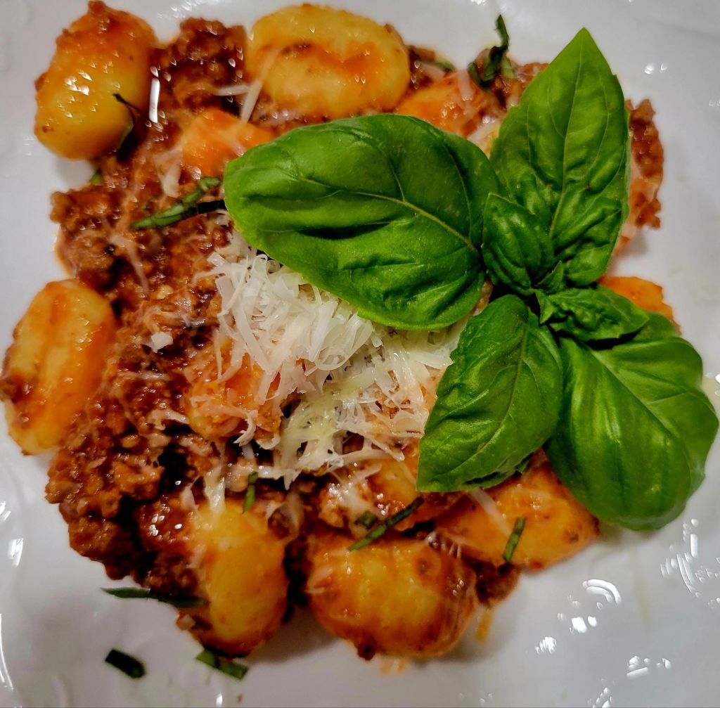 EASY DINNER. My mother-in-law (Sicily 🥰) made homemade gnocchi regularly. For 30 years, I was blessed to have her in my life. Her recipe is as good as it gets. However, the older I get, the less cooking I want to do. I still cook almost every day, for 55 years now, but… some days, I take more shortcuts 😜 gladly. So, easy store bought gnocchi and my go-to MEAT SAUCE 🍝🧀🍃 Nothing wrong with a shortcut with sauce either. If you have a favorite store bought marinara, add it to cooked meat. I use all ground beef, but many mix beef with grounf veal and/ground pork. Like one of the best Lidia Bastianich ❣️ I have to confess, it’s definitely not as good as her homemade. I need to take one day a year, make a lot, and freeze some. That being said, this makes a delicious easy dinner. I would make a salad and bread sticks or garlic bread, but I didn’t have that on this day 😳 So my granddaughter made a side of roasted broccoli and cauliflower 😍 She seasons good and uses evoo. 425° about 15 minutes, stir in between, and when done.