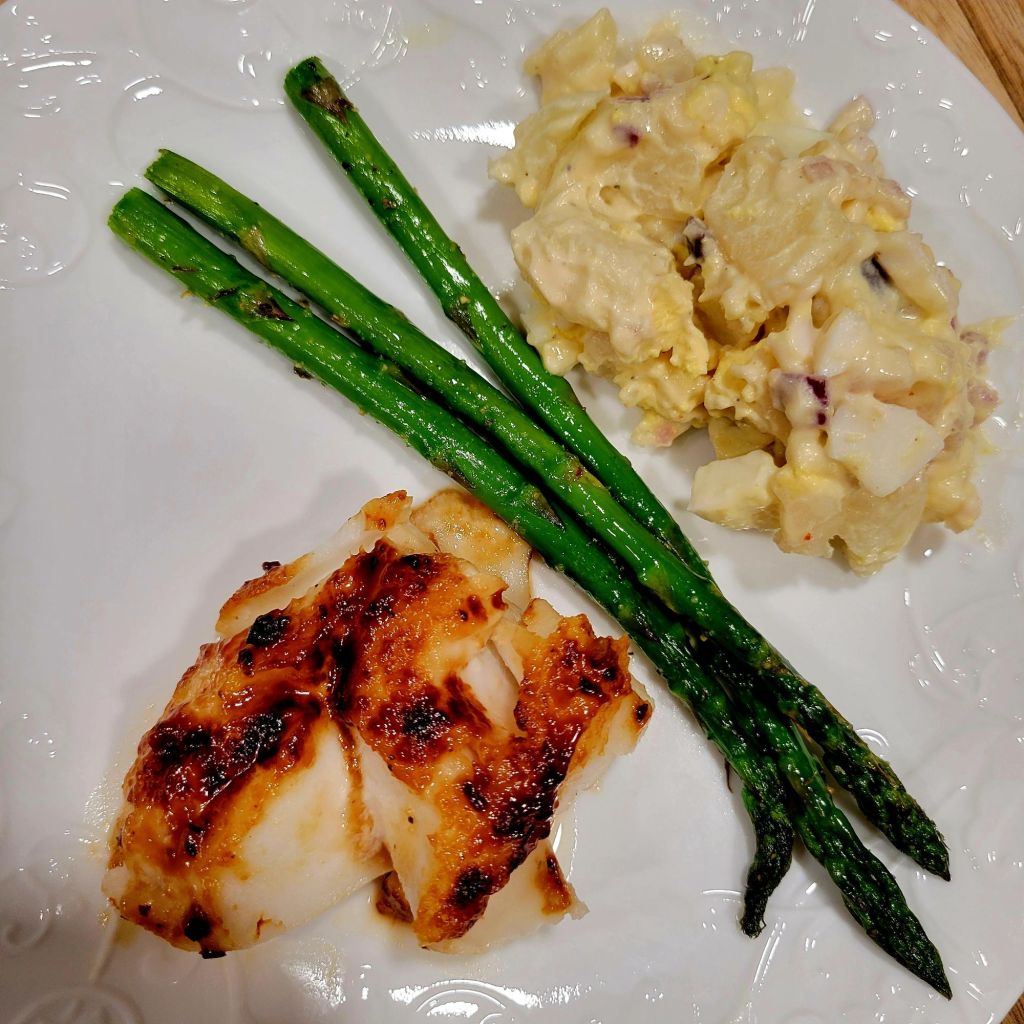 I made asparagus (evoo,seasoning) to go with it. I put it in my small oven at 425ยฐ for 15 minutes. Along with already made potato salad. Both got done at the same time ๐๐ฅ๐ This was a darn good dinner!