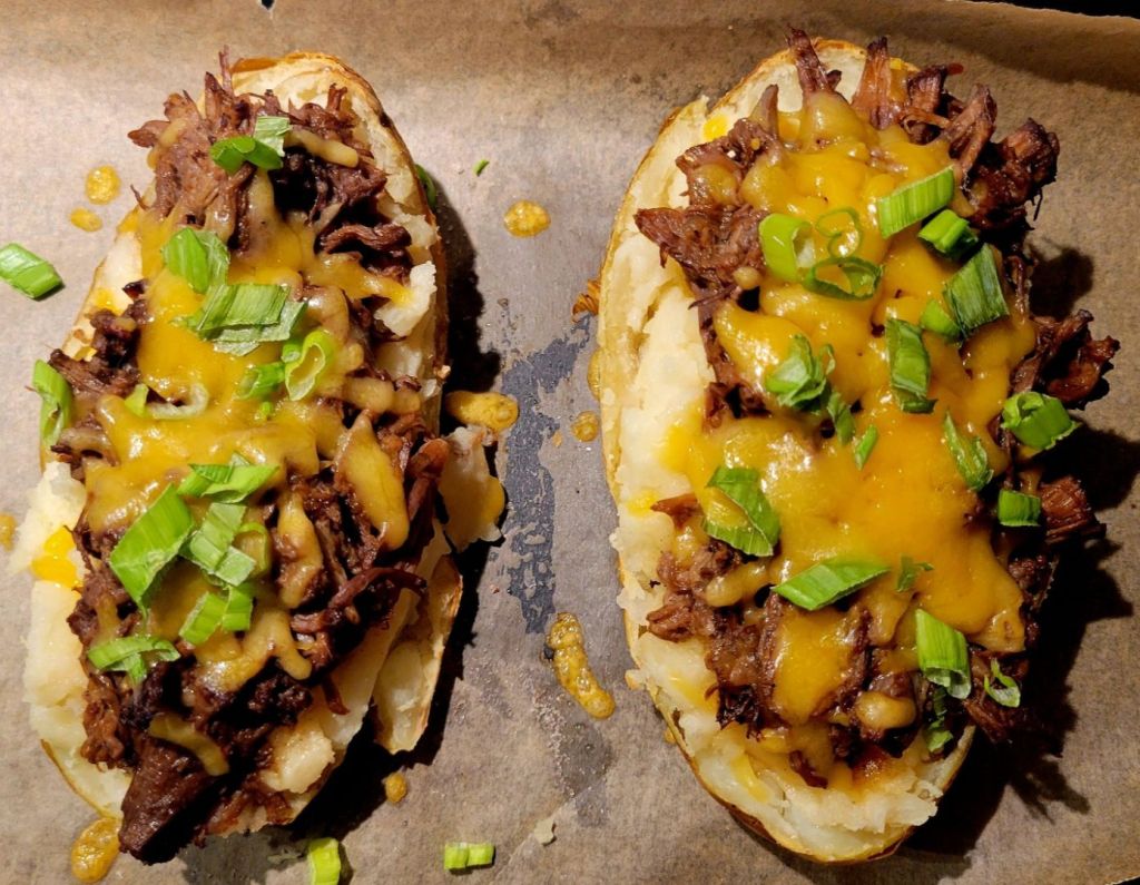 I had one very large potato 😉 just 2 of us, leftover shredded beef, so Shredded Beef Loaded Baked Potatoes (potato 😜) 🥔