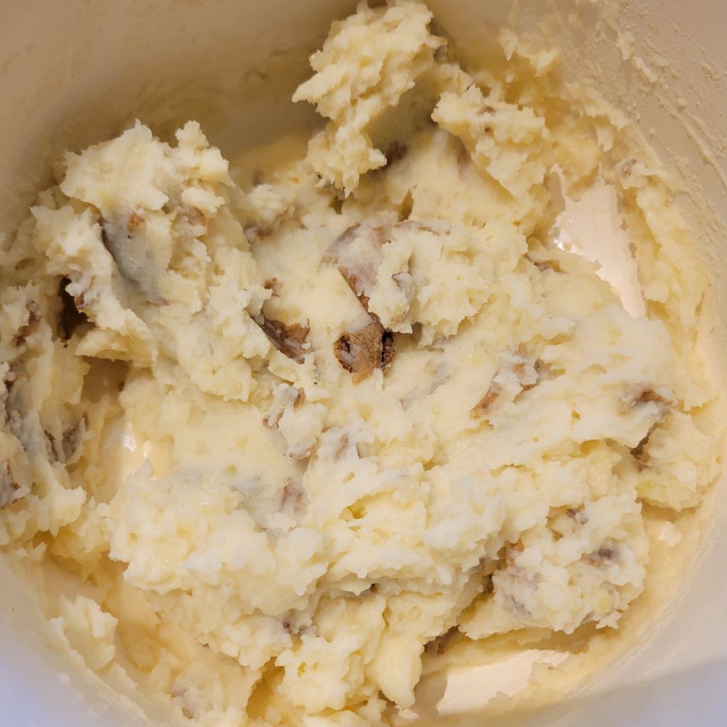 Smashed potatoes: I cut large russet potato (only 2 of us here) in quarters, so that only took 20 minutes in low boiling water. Drained, added salt to taste, couple/3 tbs butter, and cream, and mash to desired consistency. 🤫 I also gave her my black and white pepper. 😬 That’s okay. Everything is delicious with good butter and Redmond Real Salt or other good salt. Luckily, I do have this all-purpose seasoning ⤵️