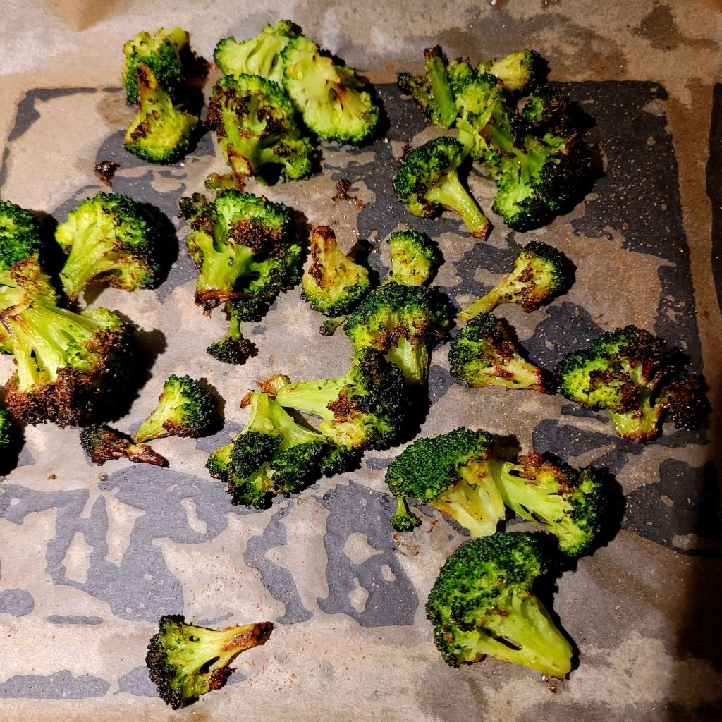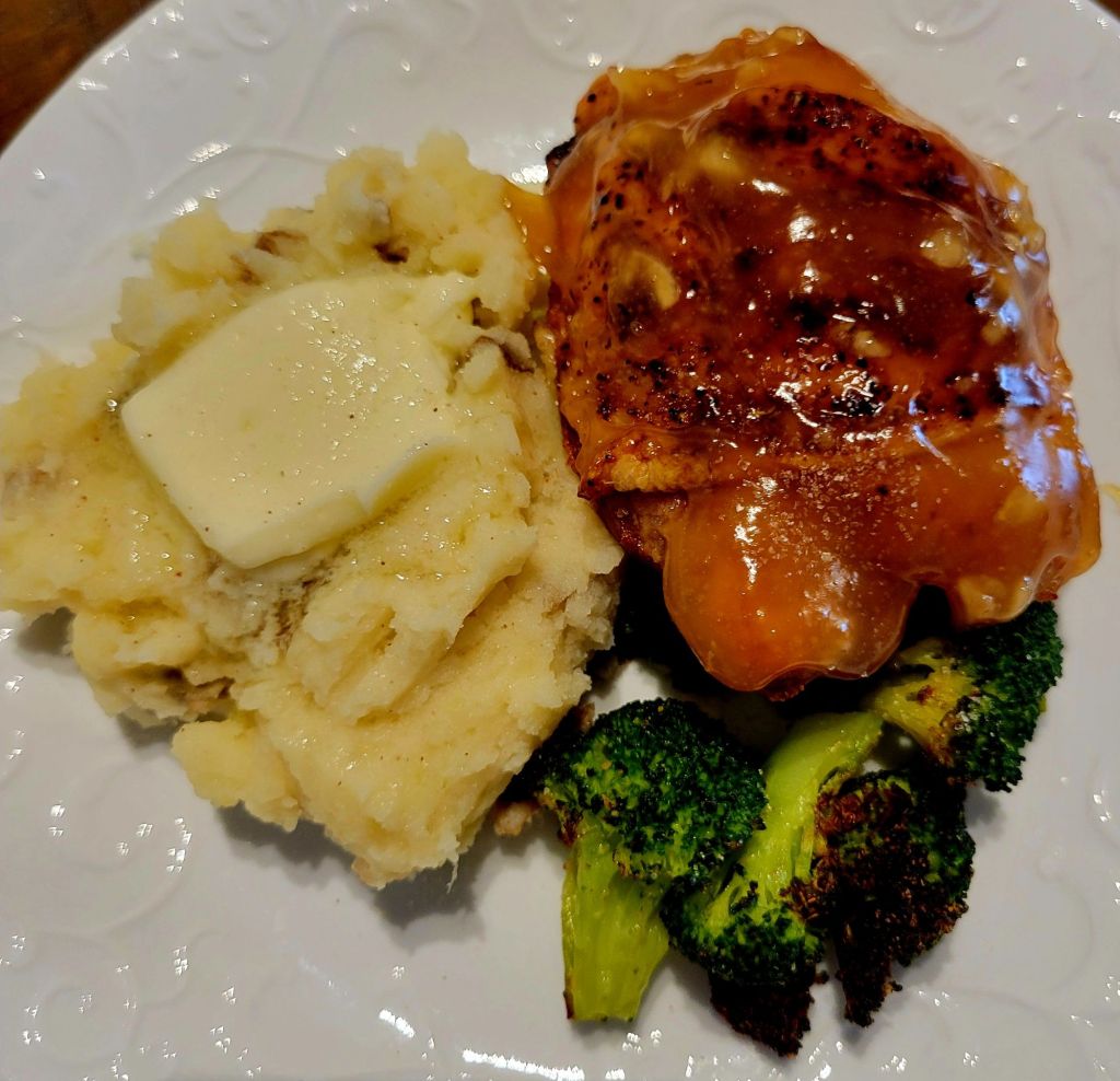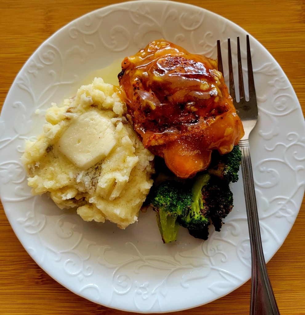Roast well seasoned chicken thighs at a high temperature (425°) for 25- 30 minutes, add seasoned, tossed in evoo, broccoli to another sheet pan in same oven for another 20-25 minutes. While that was cooking, I made smashed potatoes and the honey garlic sauce. ⤵️