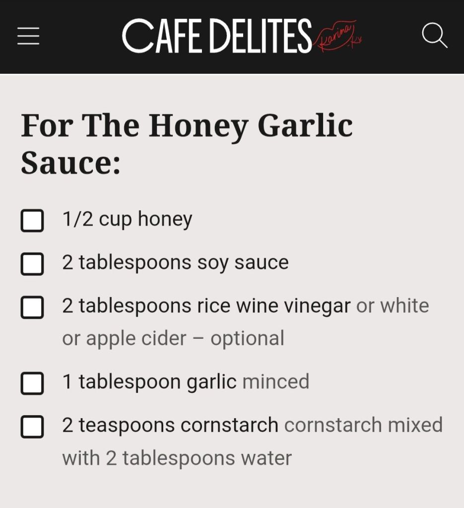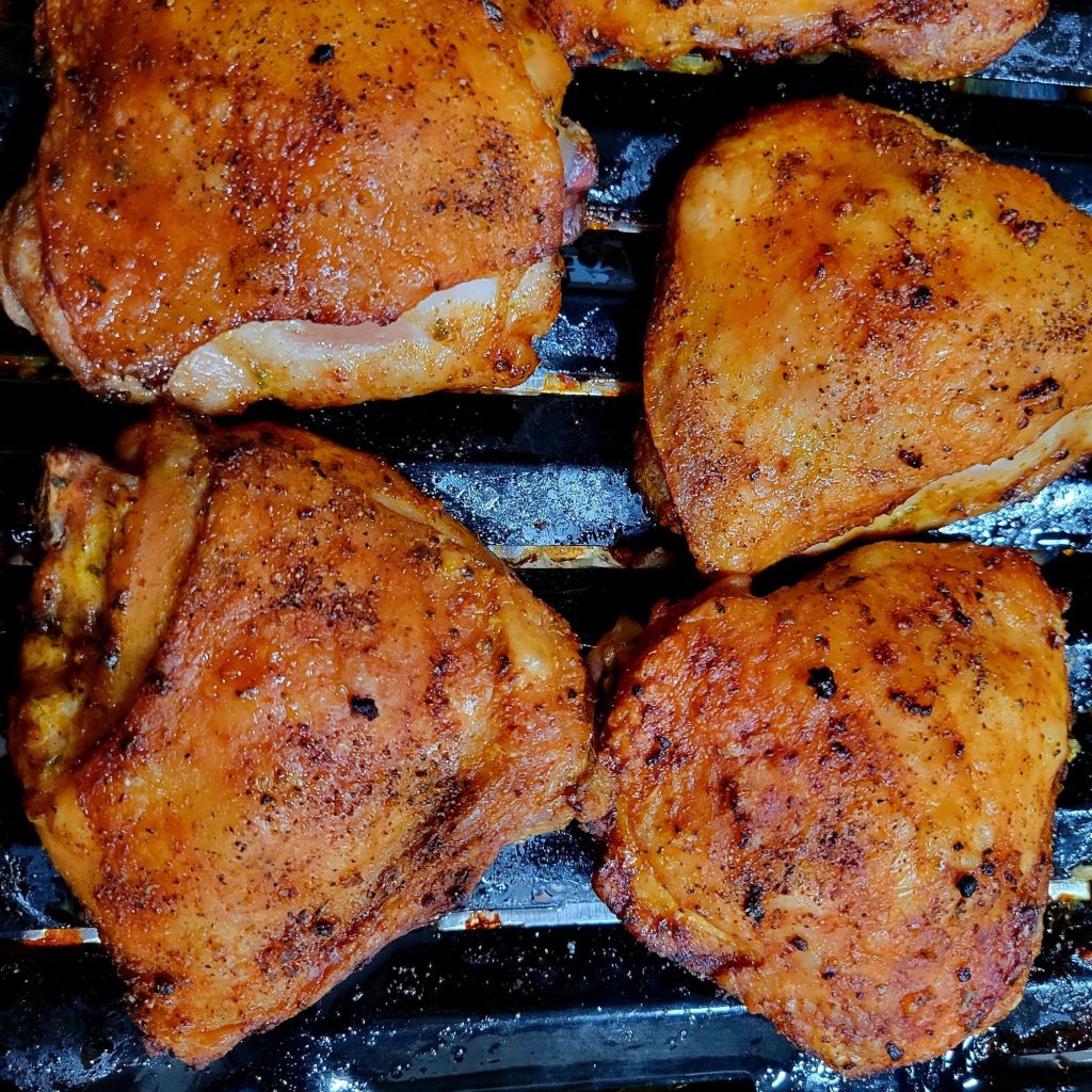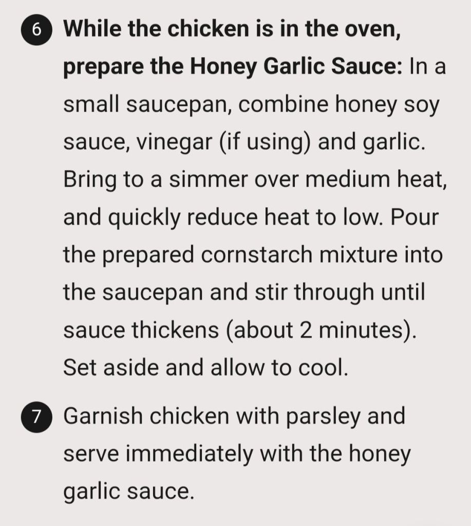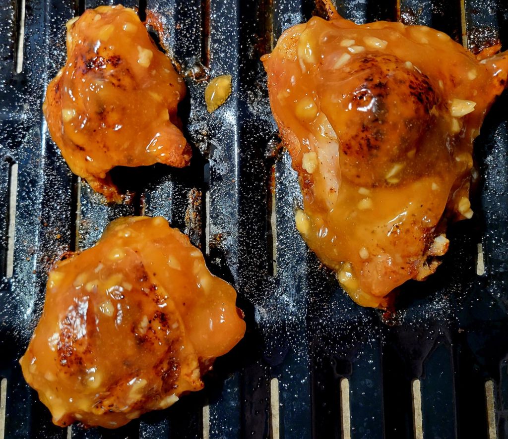 Tried Crispy Roasted Chicken Thighs with a Honey Garlic Sauce . I adapted the idea from the recipe at the Honey Garlic Sauce link (@ Cafe Delites) , BUT I used my own crispy roasted chicken method. It turns out really crispy, delicious, and without all the breading or extra steps. Seasoned well, though. 😉