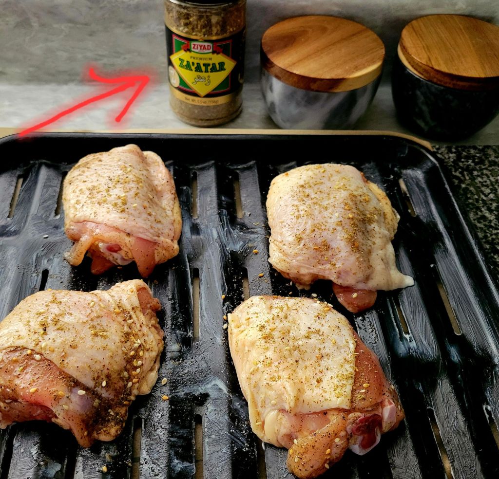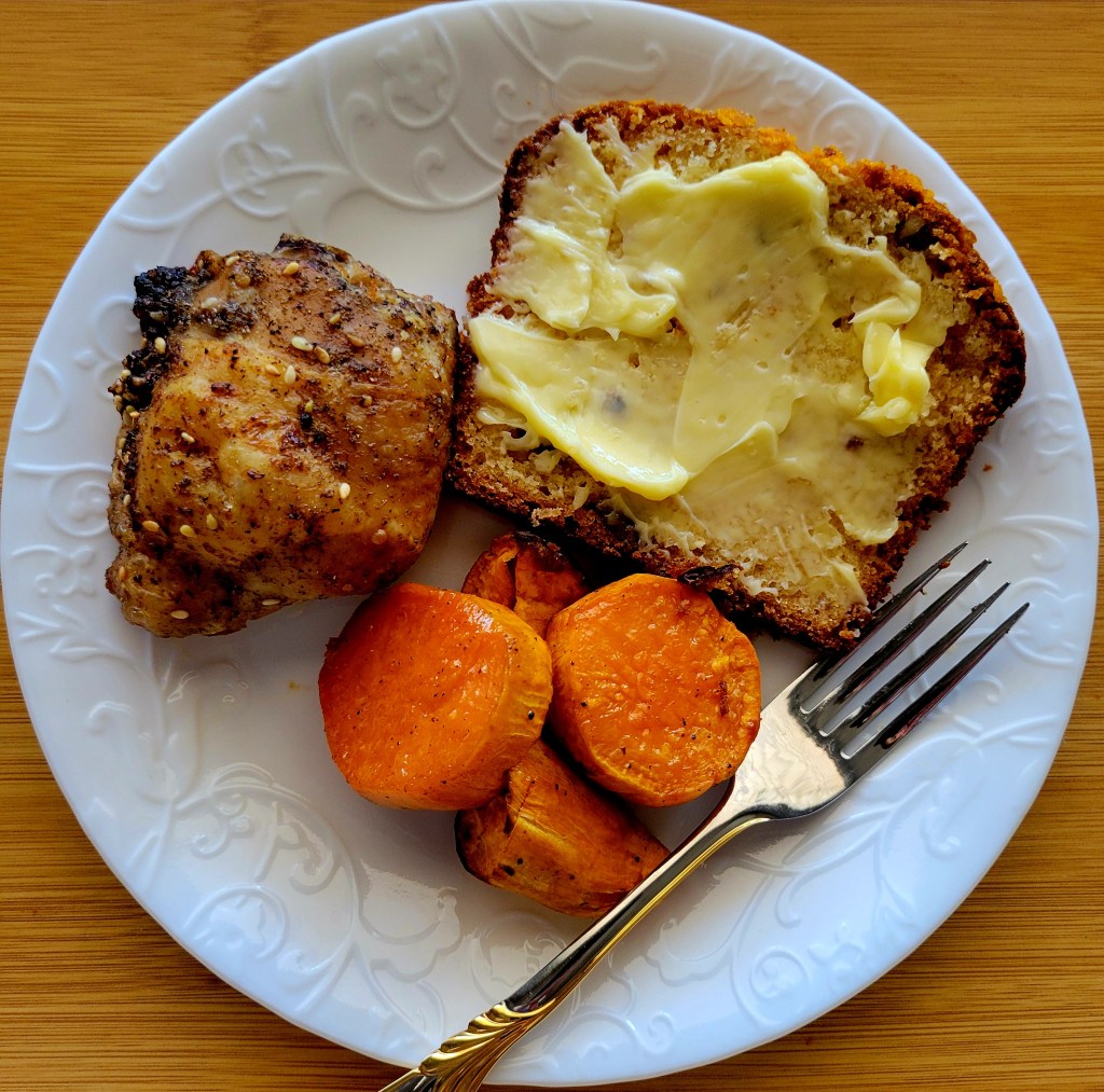 Easy! Za’atar Roasted Chicken Thighs ð Clean chicken, pat dry, rub or toss in olive oil (a healthy oil), seaon with salt (Redmond Real Salt here ð), fresh cracked black pepper, garlic powder, and za’atar. Yes, we went to Baiz Market ð roasted in 425° oven for 55 minutes. Halfway through, I added another sheet pan with sweet potatoes; peeled, cut, tossed in olive oil, salt, pepper, and honey ðŊ Also a slice of fresh baked Orange Cranberry Walnut Bread ðĨ°ð with Rodolphe Le Meunier butter ð§. That was enough for me ð it’s still over 100°, so … there’s that ðĪŠ Surprised this morning by a NEARBY farmer’s market that I didn’t know about ðŦĻð