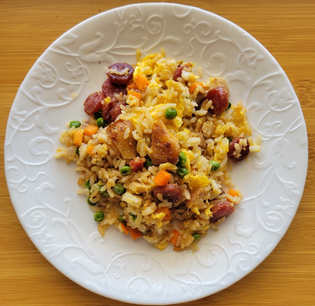 Followed the cooking method exactly. I didn’t have green onions, but I did have frozen peas ๐ The meat/protein I used… Chinese sausage and leftover chicken, that and Tamari Soy Sauce. Deliciousโผ๏ธ๐